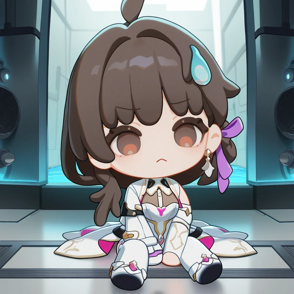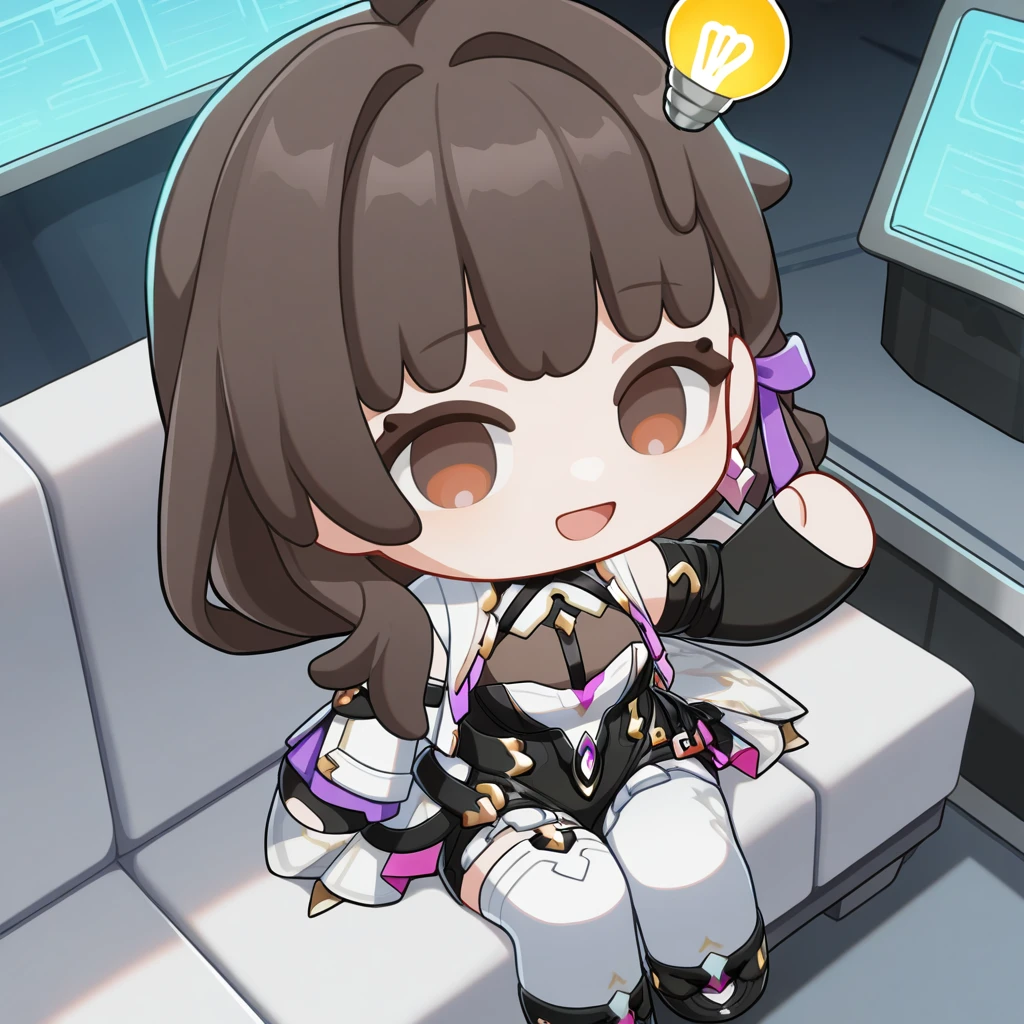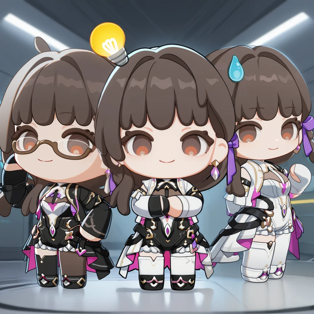 AbebeHi3, 1stAbebe, doll, character doll, chibi only, braid, braided ponytail, brown hair, long hair, brown eyes, asymmetrical clothes, asymmetrical legwear, light bulb hair ornament, black unitard, unitard, frilled shorts, black shorts, single pantsleg, white leggings, single detached legging, thigh cutout, white bustier, bustier, see-through cleavage, brown bodystocking, two-sided fabric, two-tone waist cape, cropped jacket, white jacket, open jacket, between breasts, white gorget, single detached sleeves, white sleeves, single arm warmer, black armwarmers, harness, black strap, gold trim, single earring, purple ribbon, hair ribbon, black gloves, single glove, partially fingerless gloves, black footwear, ankle boots,2nd Form: