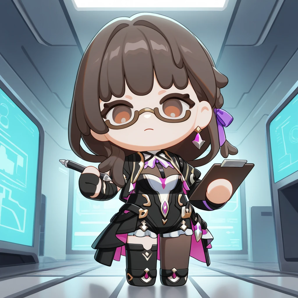 AbebeHi3, 2ndAbebe, doll, character doll, chibi only, braid, braided ponytail, brown hair, long hair, brown eyes, glasses, under-rim eyewear, asymmetrical clothes, asymmetrical legwear, black unitard, unitard, black shorts, frilled shorts, white bustier, bustier, see-through cleavage, brown bodystocking, white gorget, black jacket, cropped jacket, two-sided fabric, black waist cape, purple ribbon, hair ribbon, gold trim, black sleeves, asymmetrical sleeves, single arm warmer, black arm warmers, single earring, brown pantyhose, pantyhose under shorts, single leg pantyhose, single detached legging, black leggings, black gloves, single glove, partially fingerless gloves, black footwear, ankle boots,3rd Form: