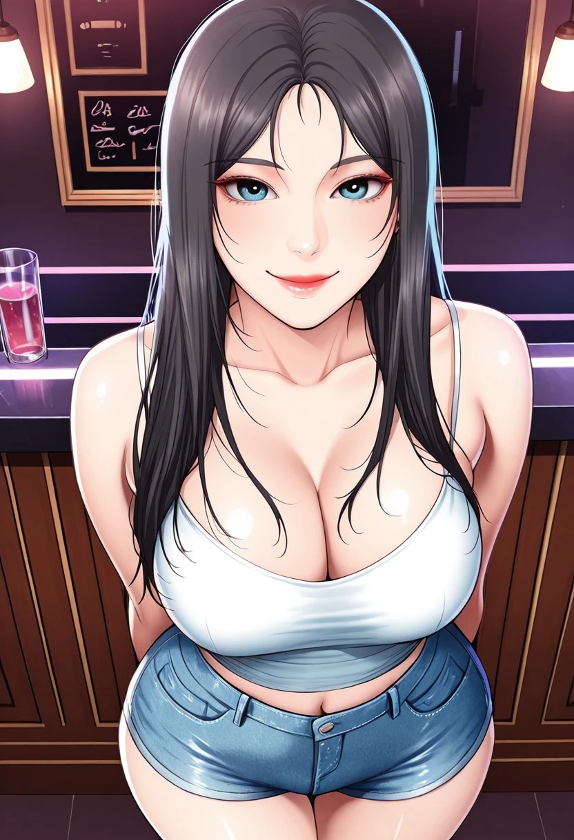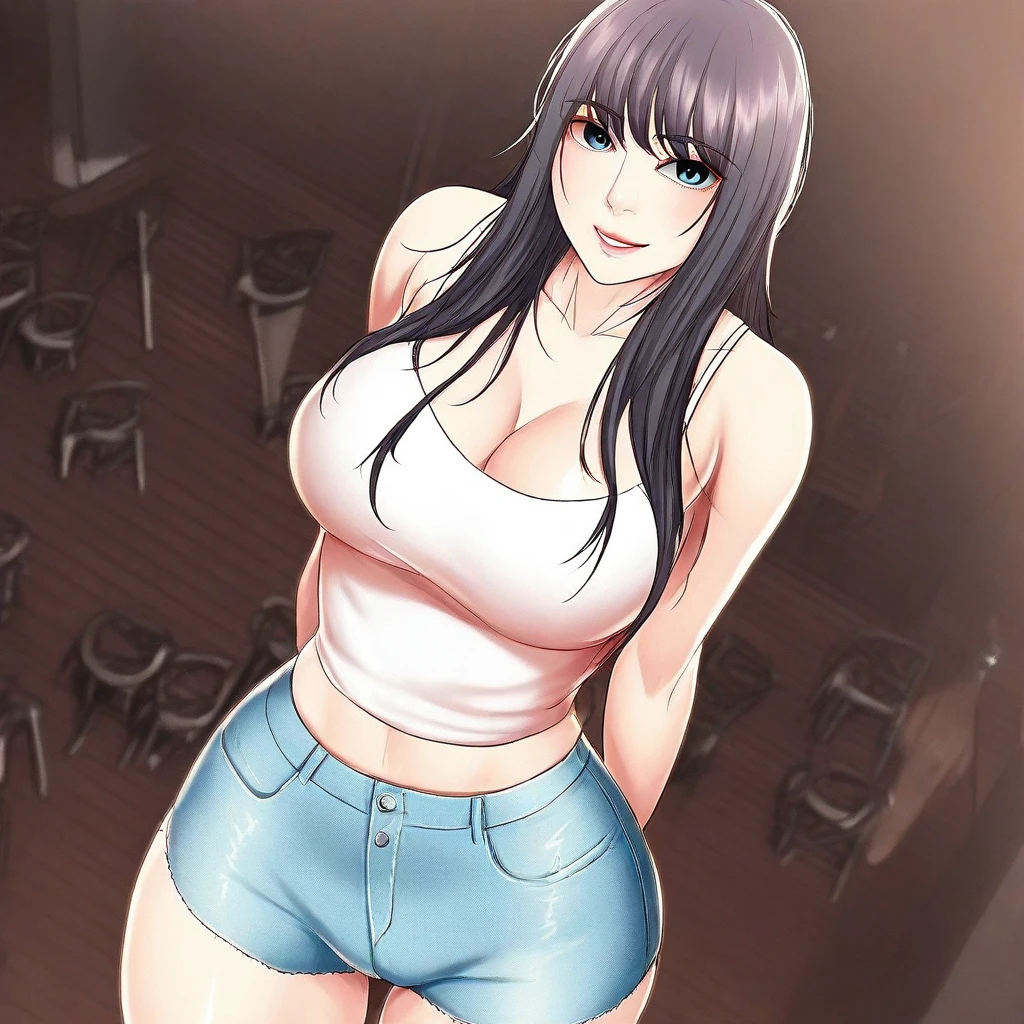 22. ((sexy white camisole, obscene cleavage, huge cleavage, midriff, sexy denim shorts, ))