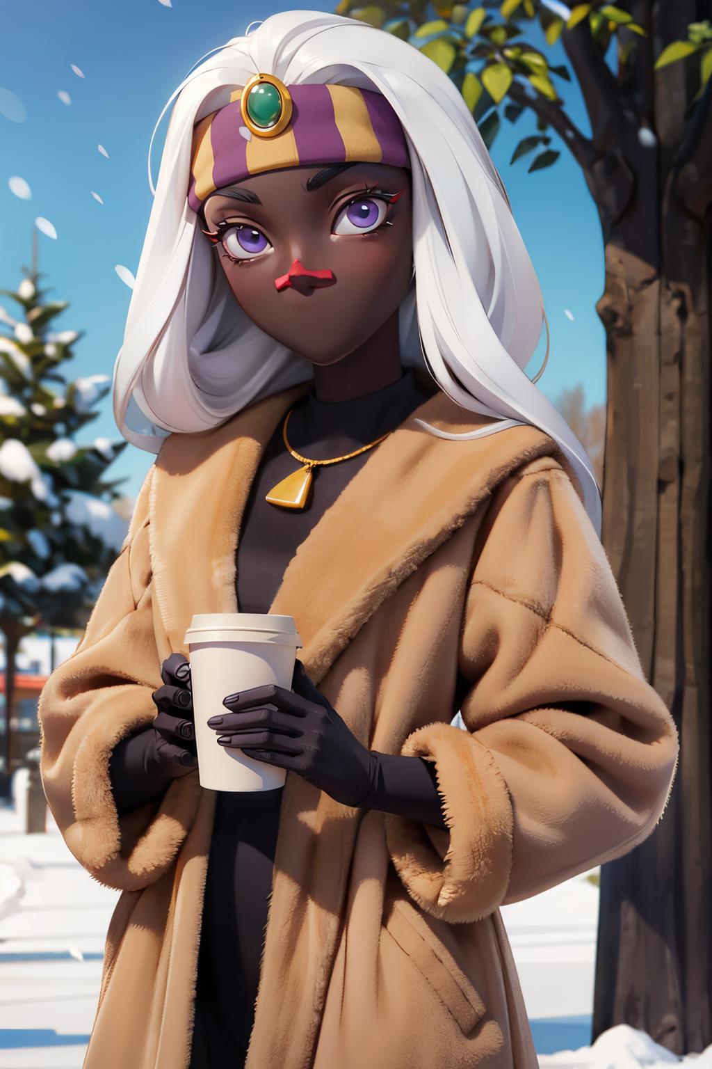 For her classic look: white hair, angry, purple eyes