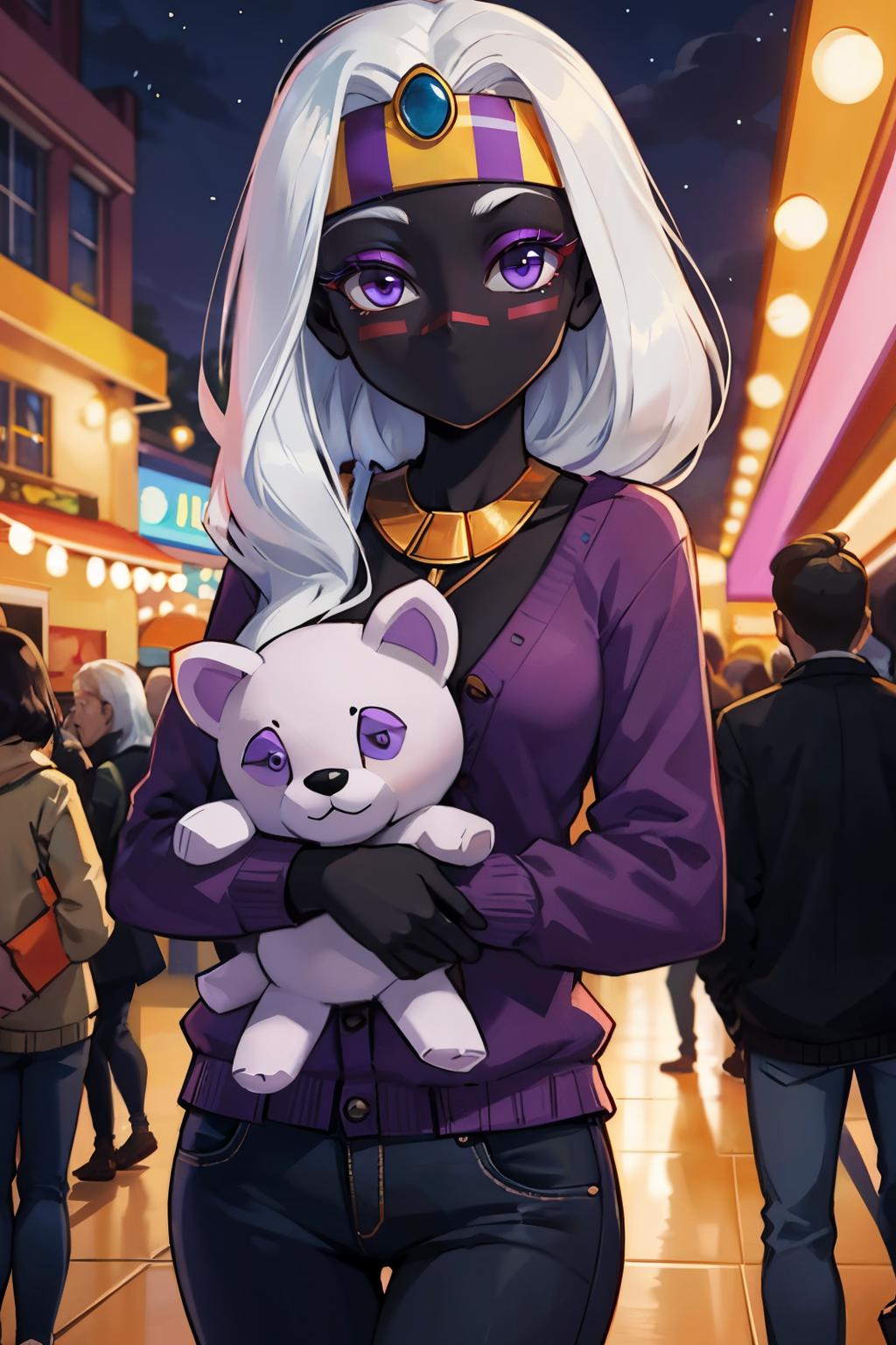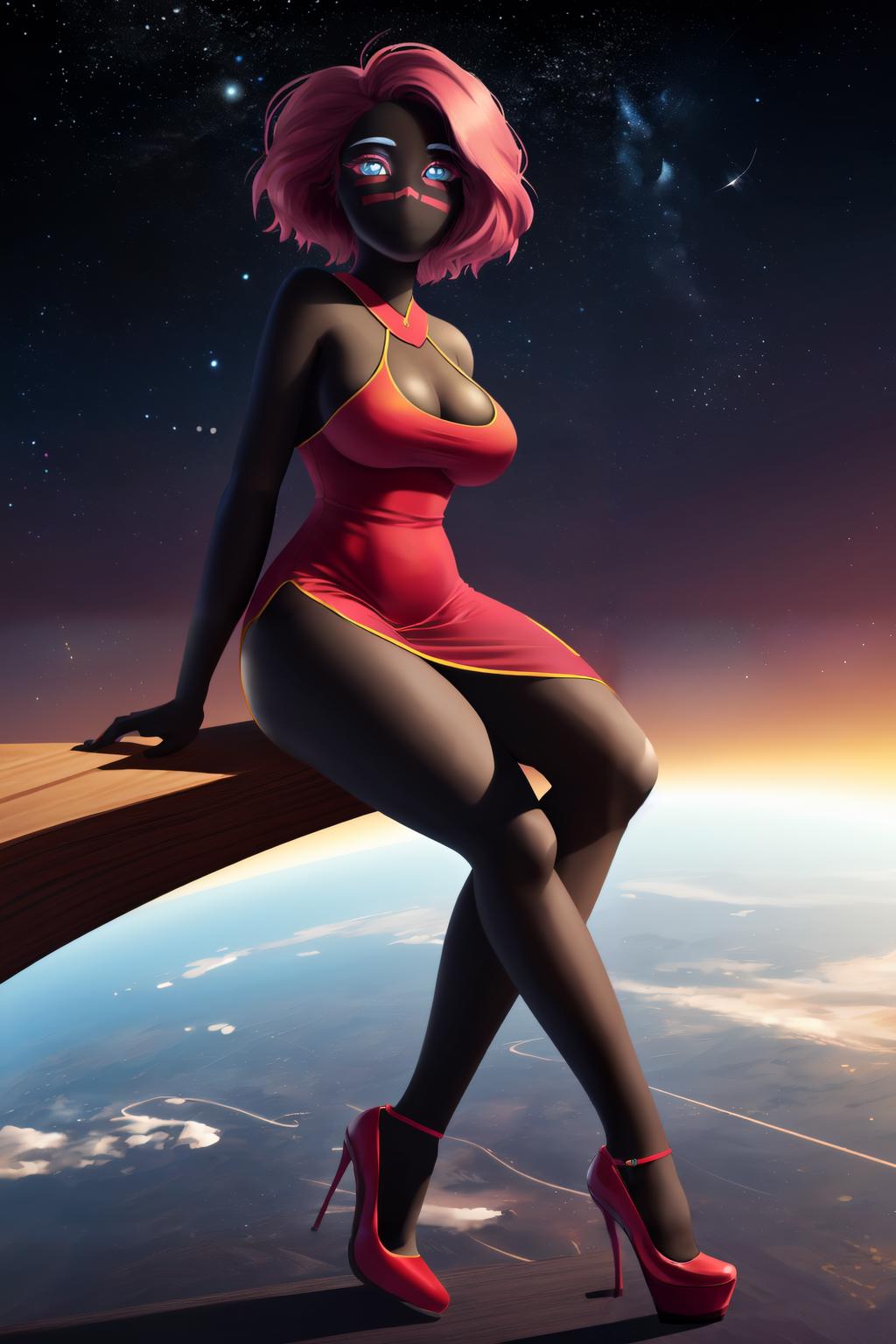 Very angy and very sexy. It took a lot of retrains + testing to get this one to work correctly. The character has no mouth, a very specific mark on her face, a lot of details around her eyes AND most importantly, most of the pictures are in cartoony style.