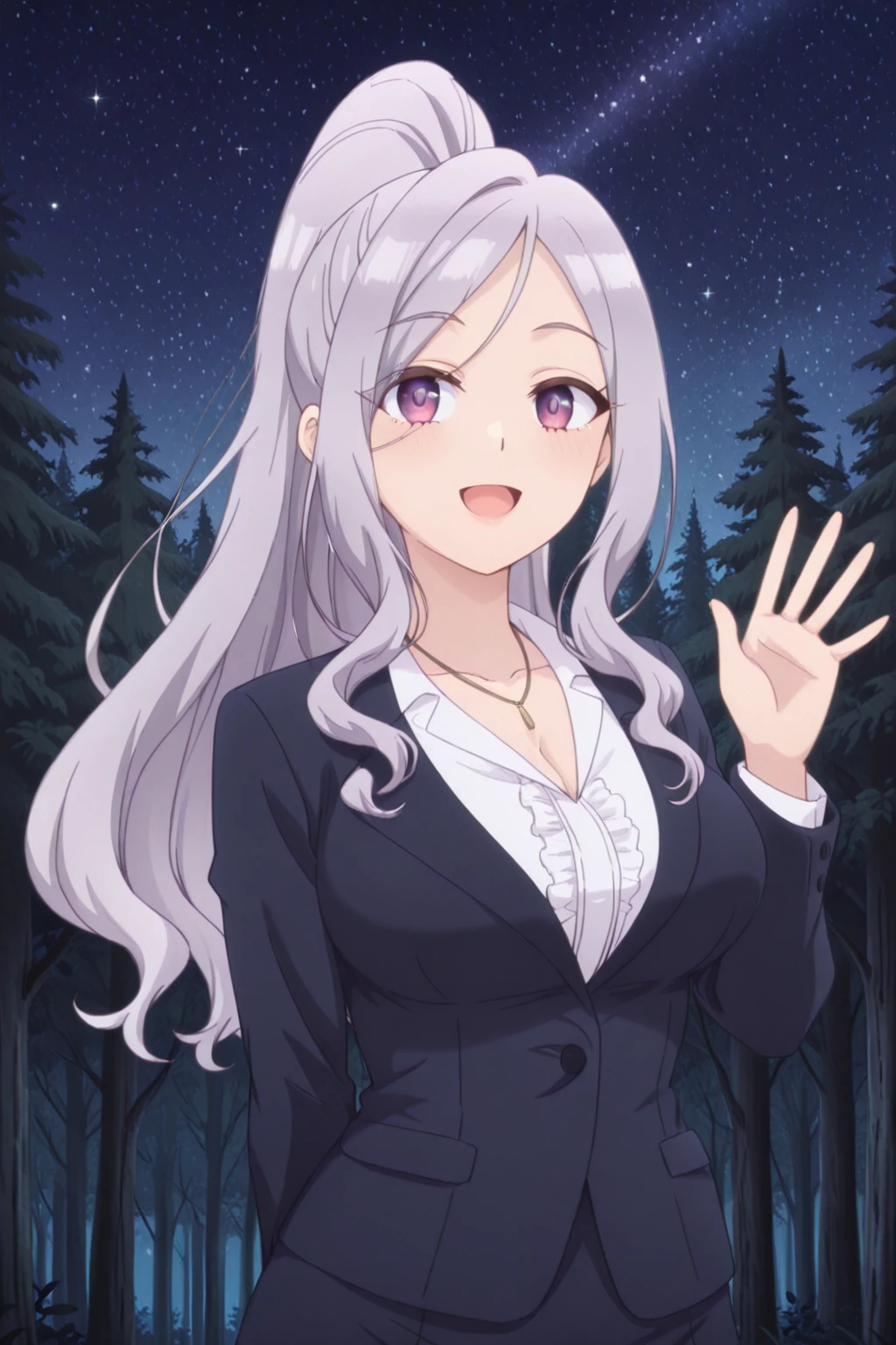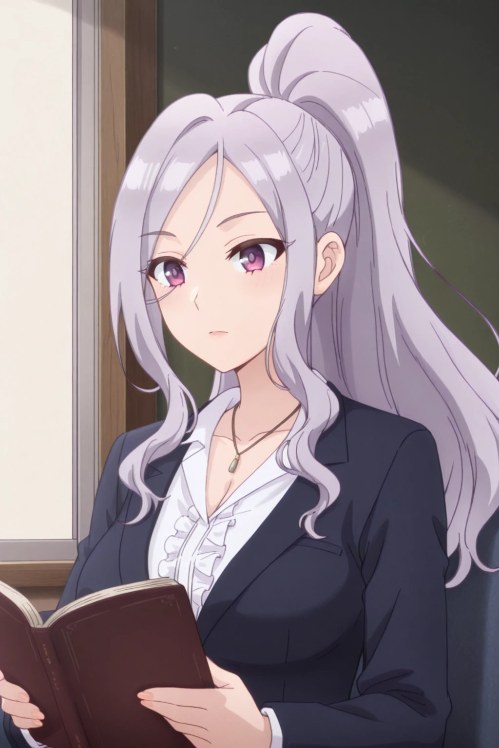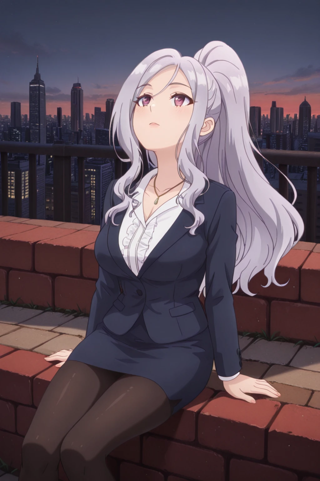 Helpful: 1girl, high ponytail, long hair, silver hair, collared shirt, blazer, skirt, necklace, high heels