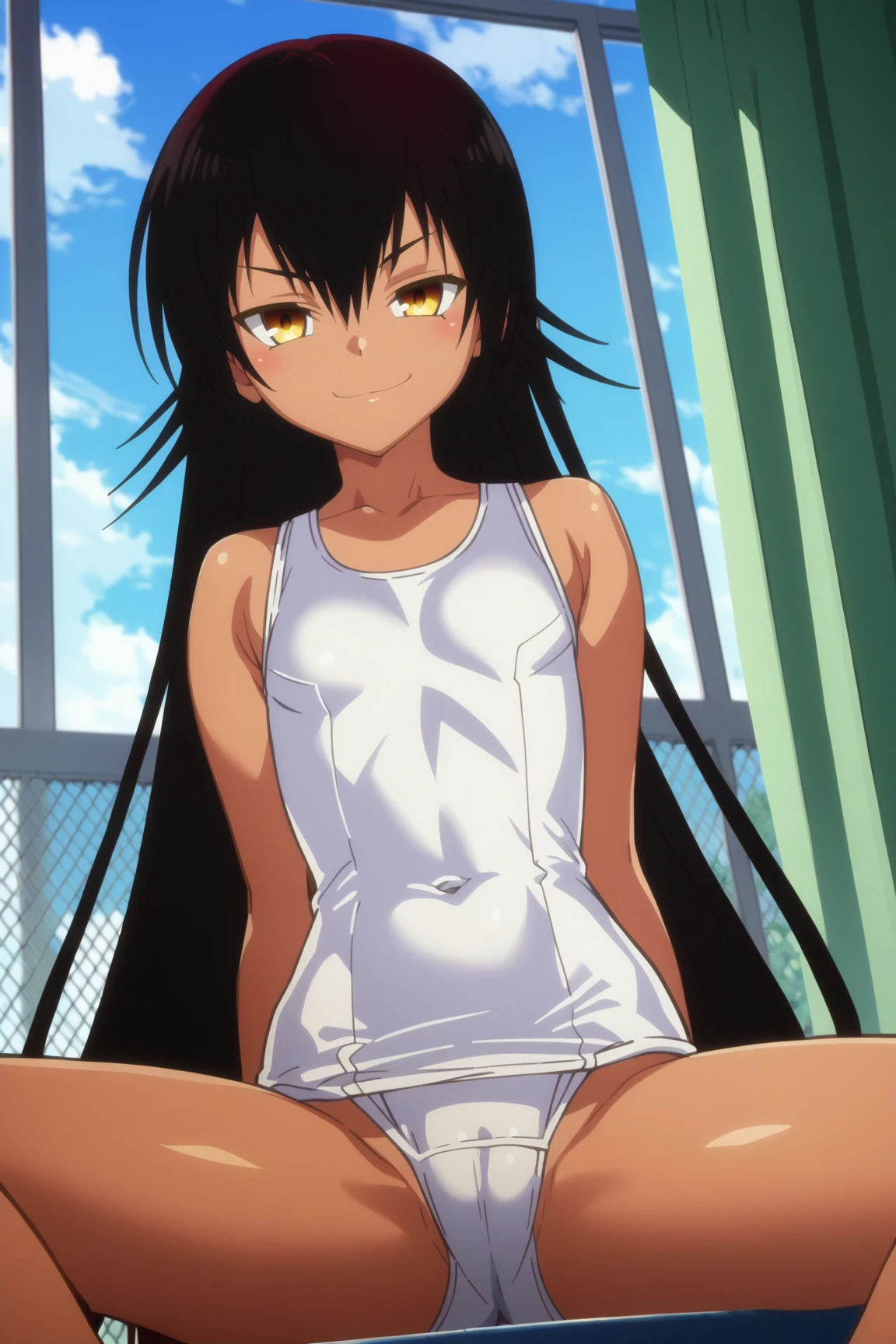 1girl, master_nemesis, to love-ru darkness, black hair, very long hair, yellow eyes, dark skin, small breasts, straight hair, white one-piece swimsuit, school swimsuit,