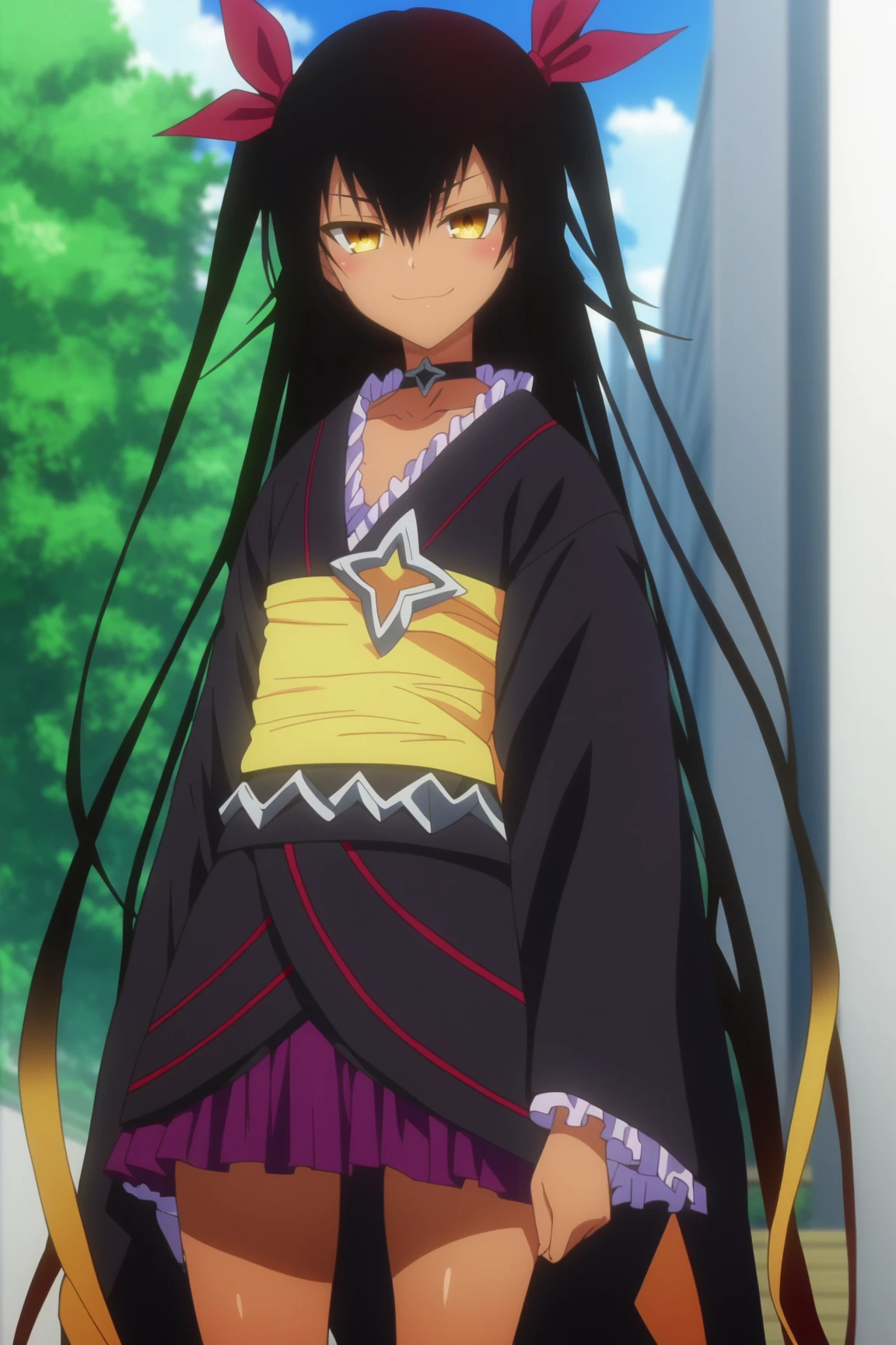 1girl, master_nemesis, to love-ru darkness, black hair, very long hair, yellow eyes, dark skin, small breasts, hair ribbon, kimono, obi, sash, miniskit, choker,