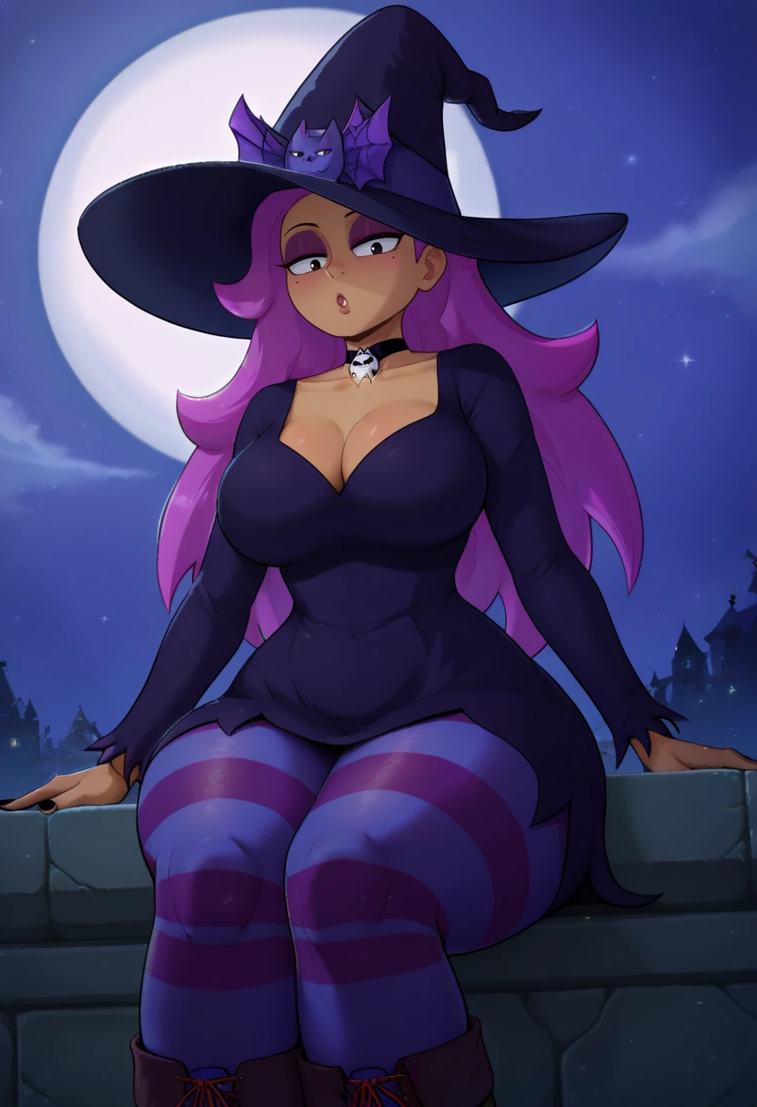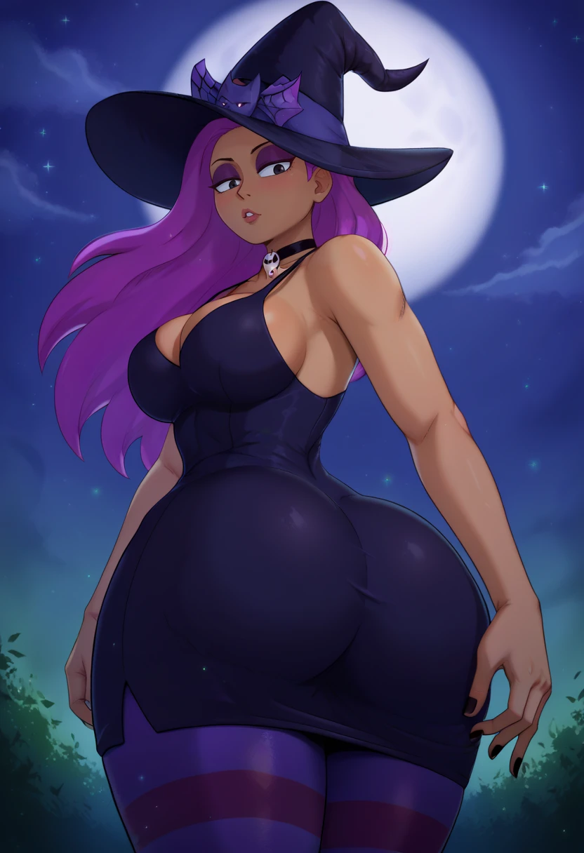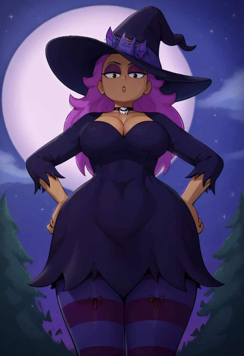 enidSDXL, 1girl, solo, ponytail, short hair, large breasts, shirt, navel, cowboy shot, pink hair, purple hair, dark skin, shorts, midriff, black eyes, crop top, hand on hip, bandages,bike shorts, wide hips, room