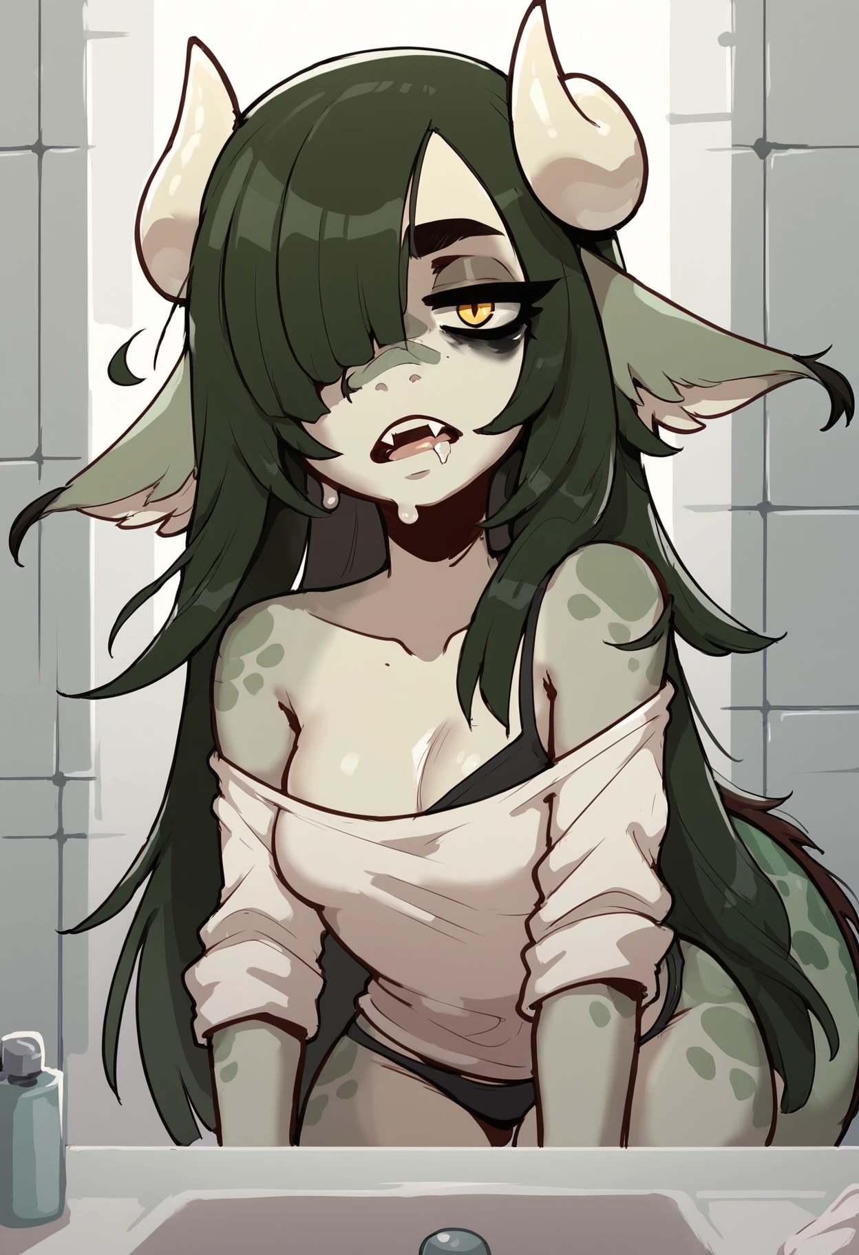 Prompts are : (Verimeen), 1girl, green hair, long hair, green skin, dragon tail, animal ears, white horns, hair over one eye