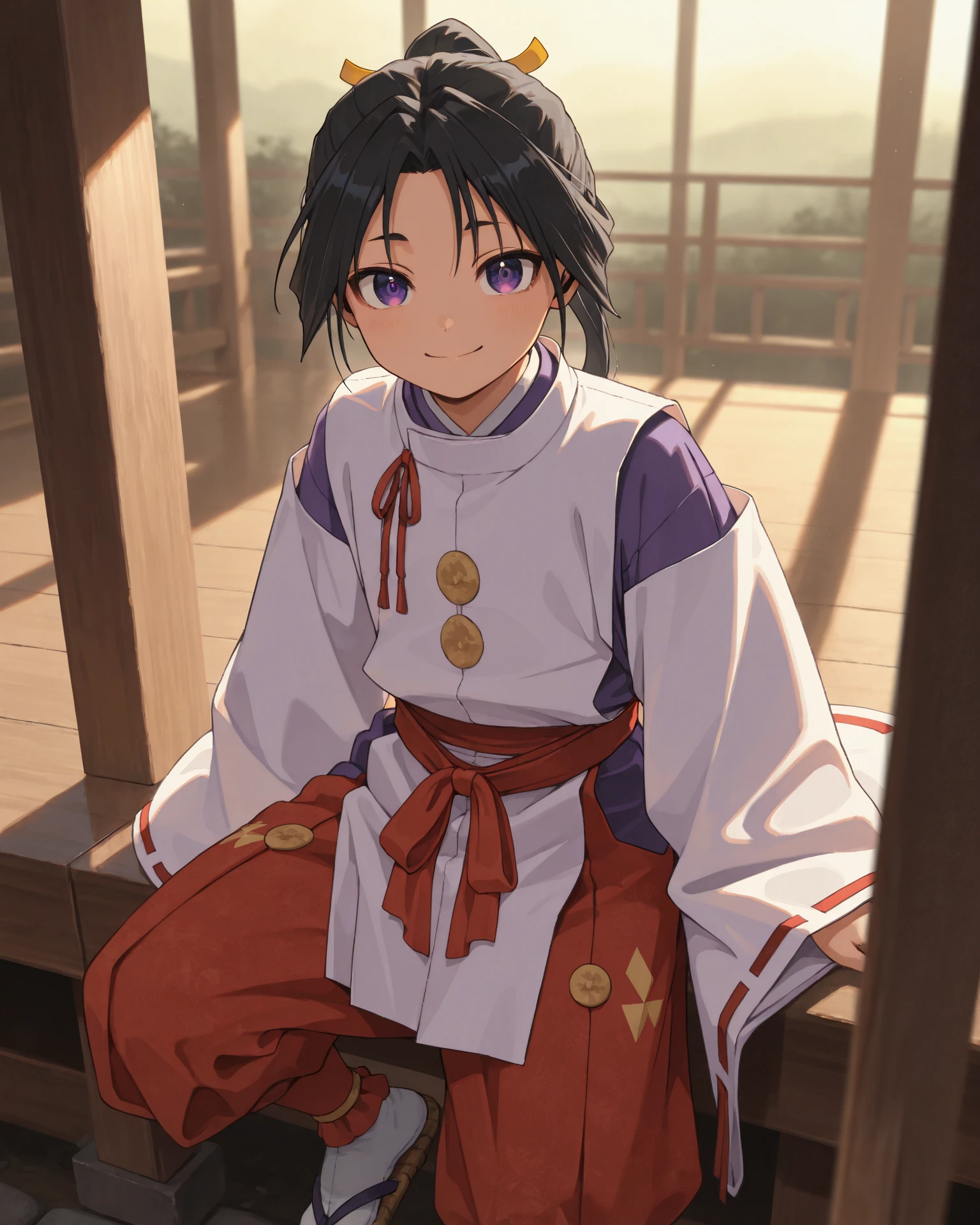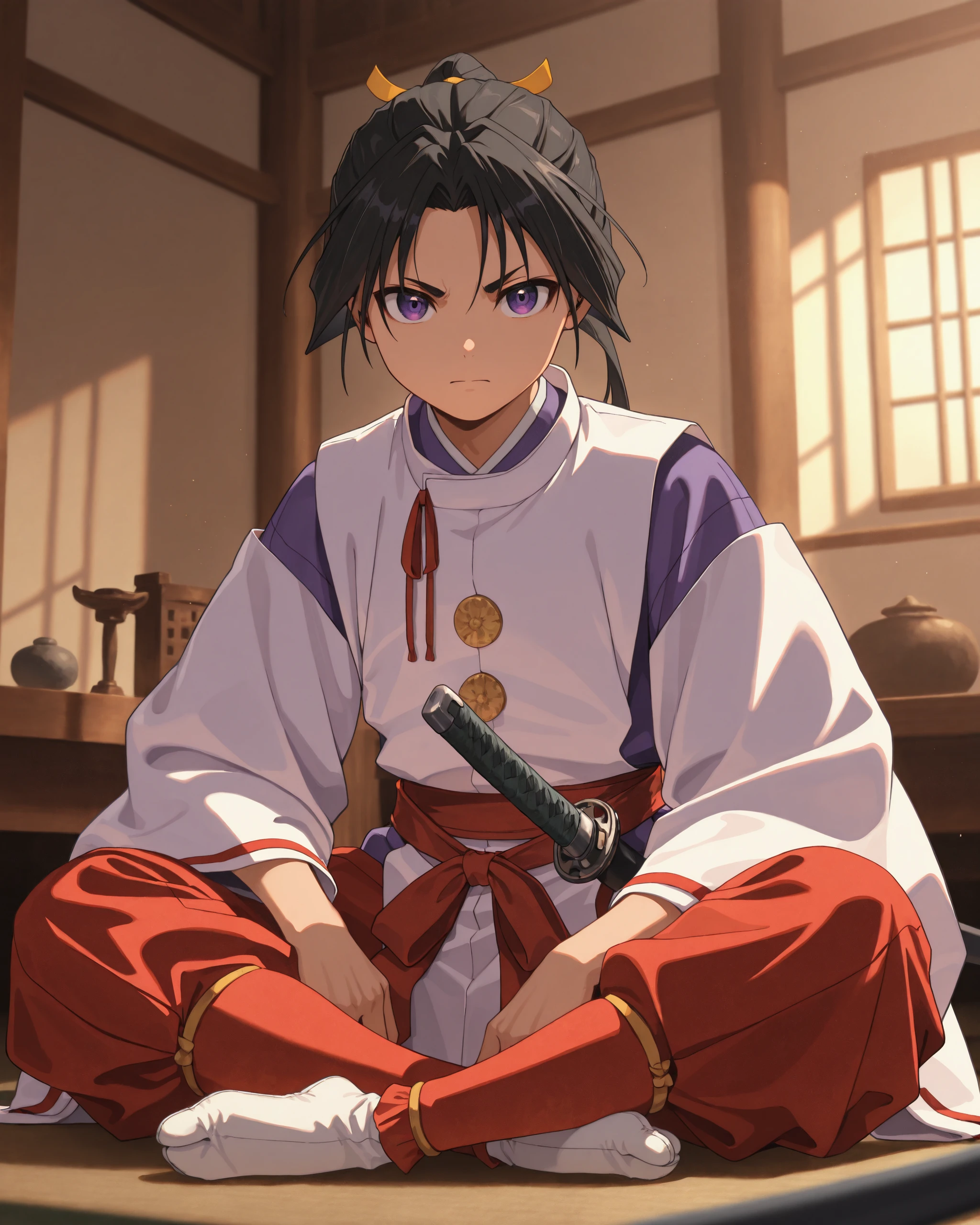 white kariginu, dark purple kimono, red hakama pants, japanese clothes, white tabi, sandals, wide sleeves, red sash, alternate style