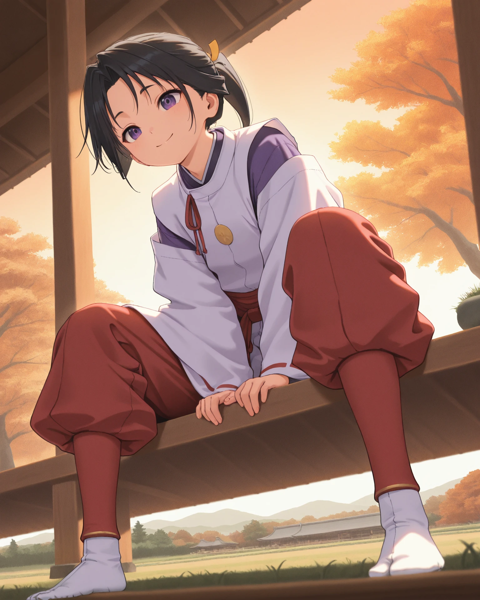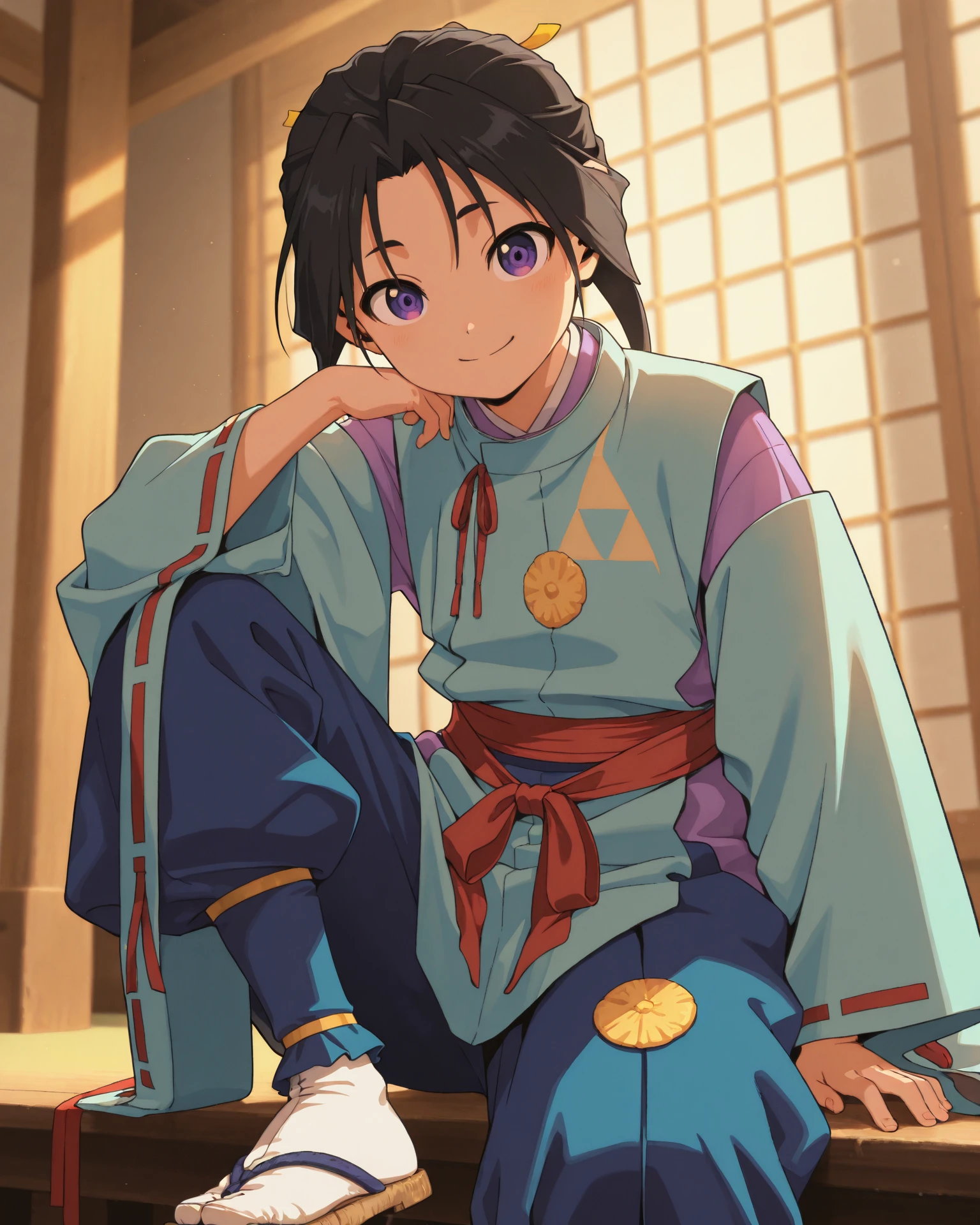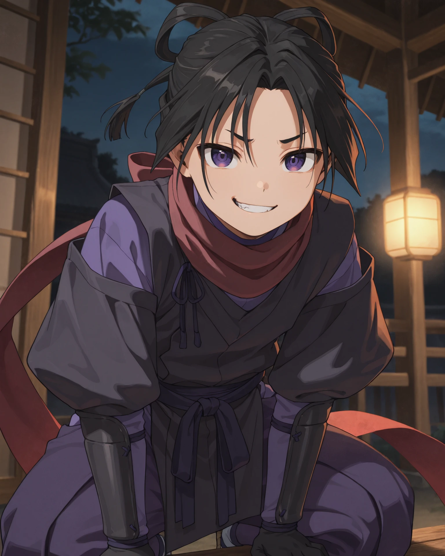 japanese clothes, purple shirt, ninja, juliet sleeves, black gloves, red scarf, purple pants, tabi, sandals