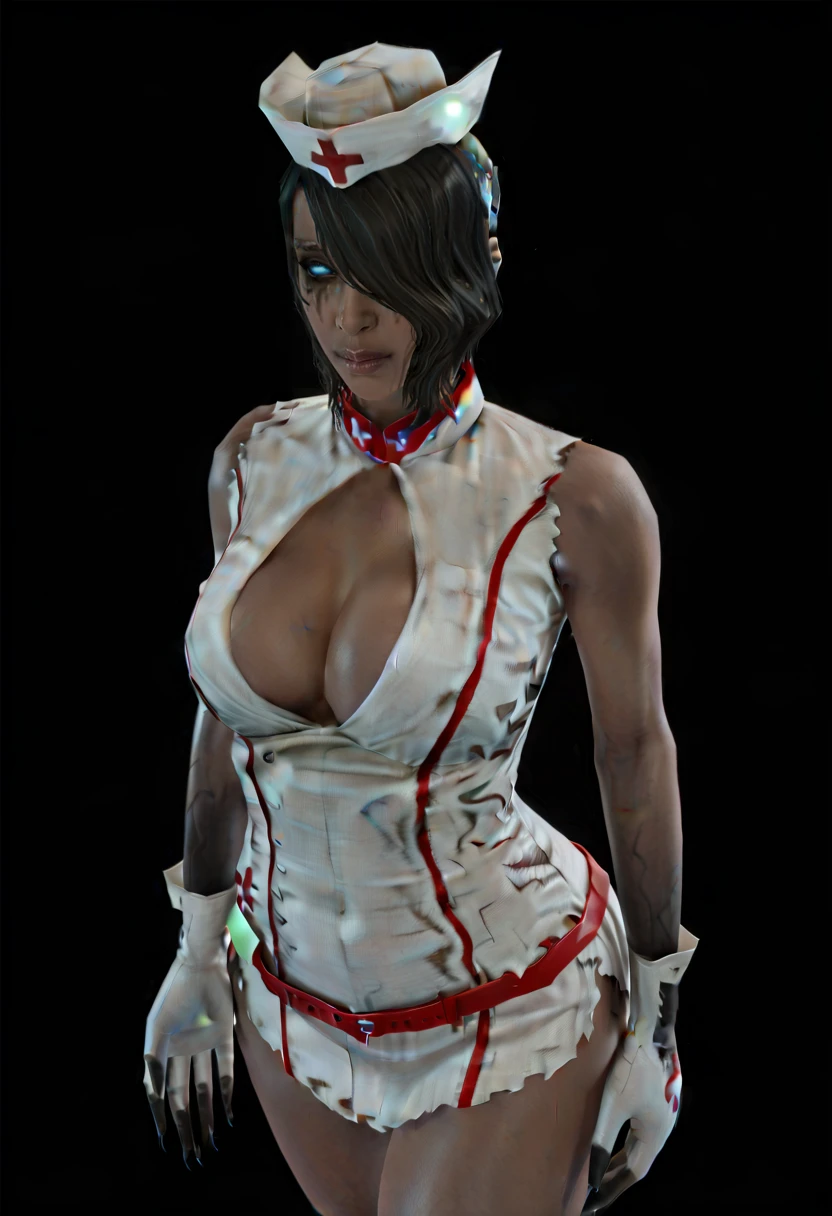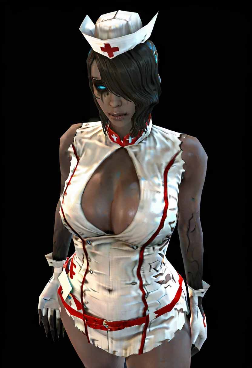 MaidenSlug,1girl,mature female,black hair,short hair,hair over one eye,glowing eyes,make up,nurse,nurse cap,hat,blue eyes,,,cleavage,claws,dark skin,dark-skinned female,colored skin,torn clothes,white dress,gloves,nurse gloves,high heels,mechanical parts,science fiction,
