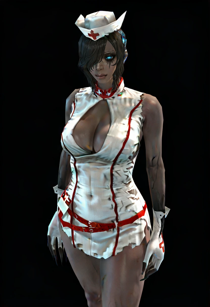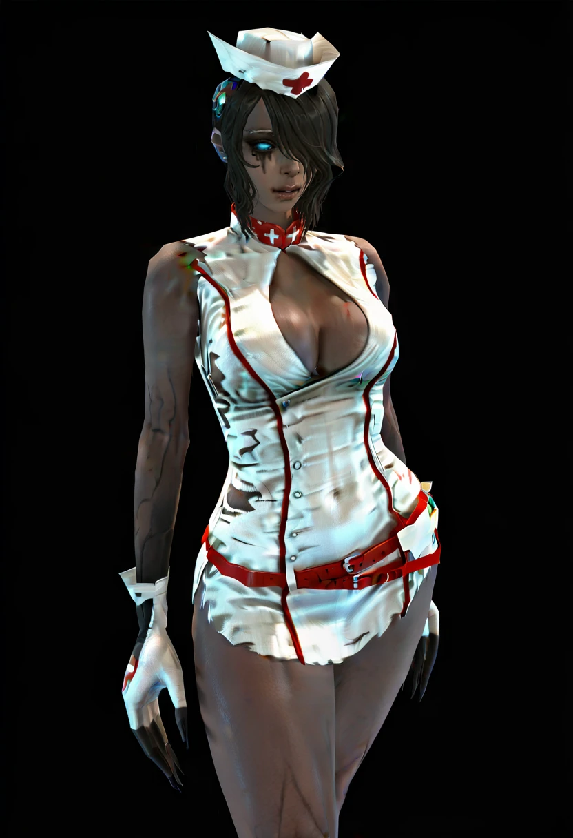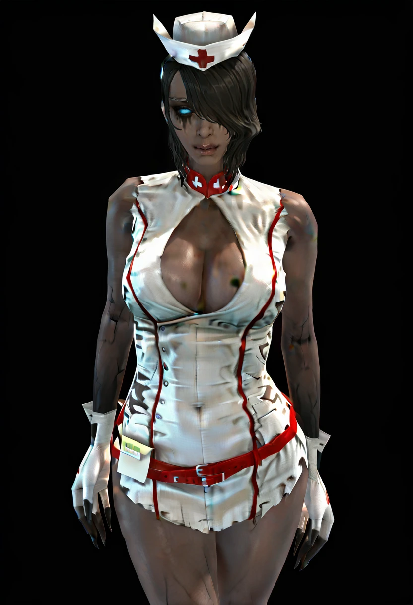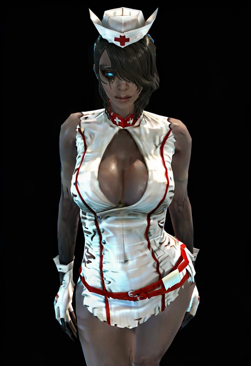 MaidenSlug,1girl,mature female,black hair,short hair,hair over one eye,glowing eyes,make up,nurse,nurse cap,hat,blue eyes,breasts,large breasts,cleavage,claws,dark skin,dark-skinned female,colored skin,torn clothes,white dress,gloves,nurse gloves,high heels,