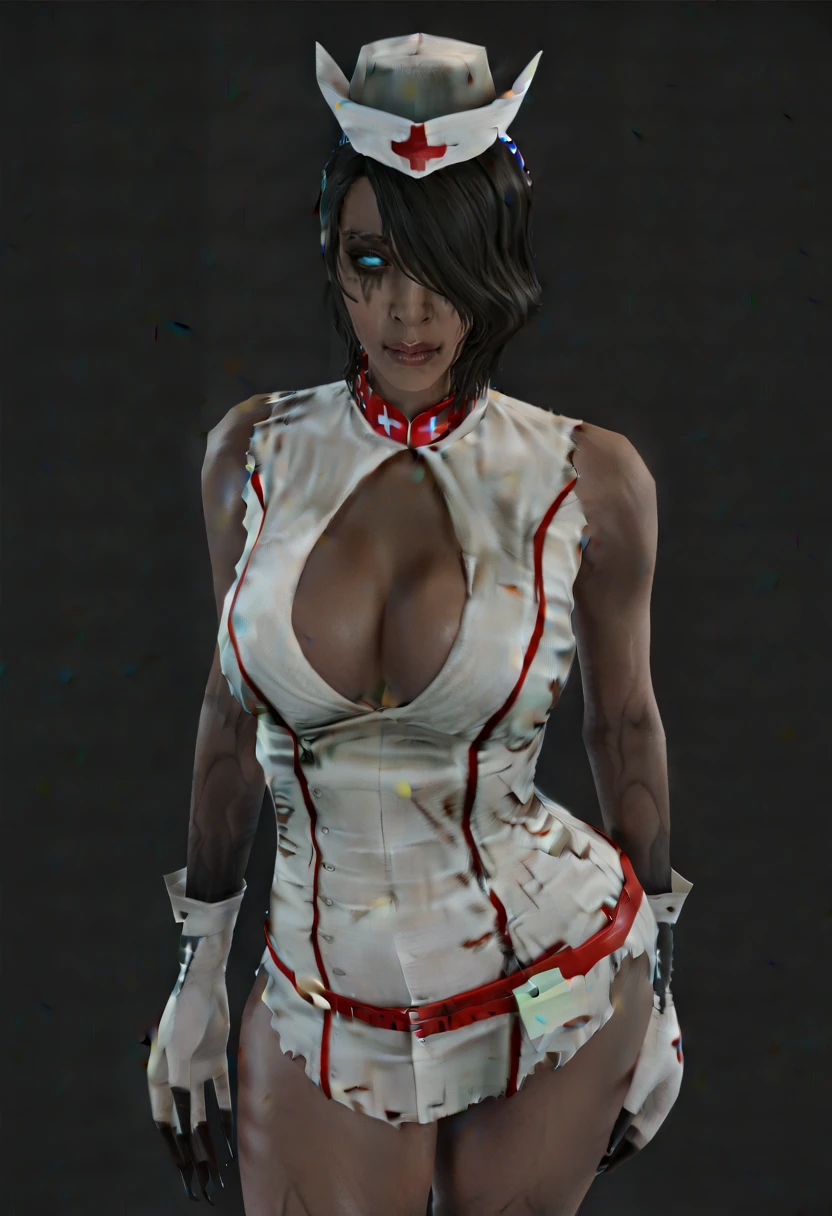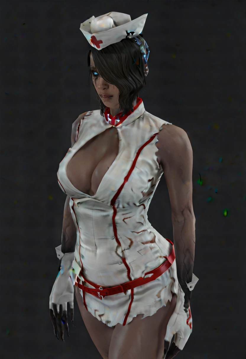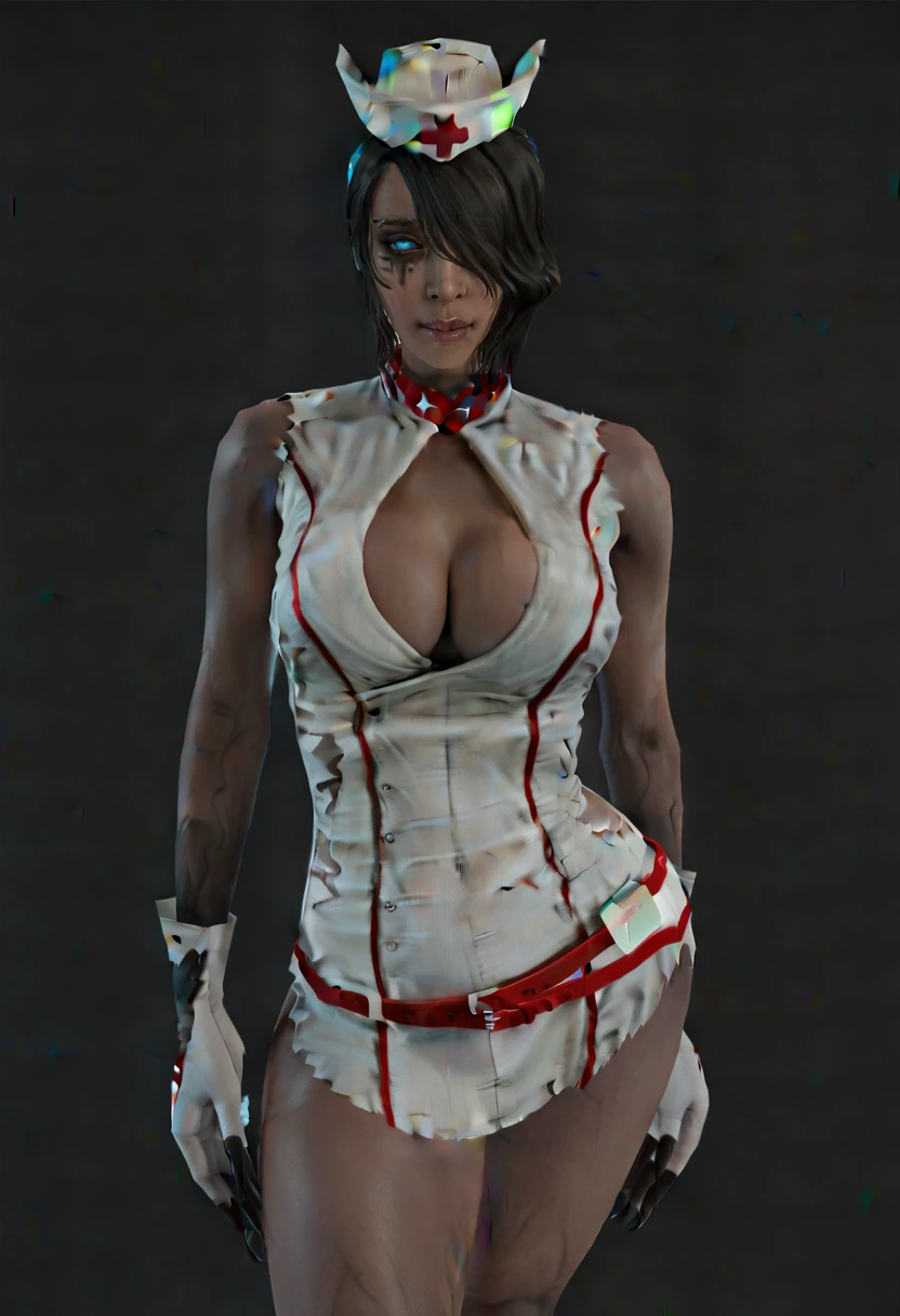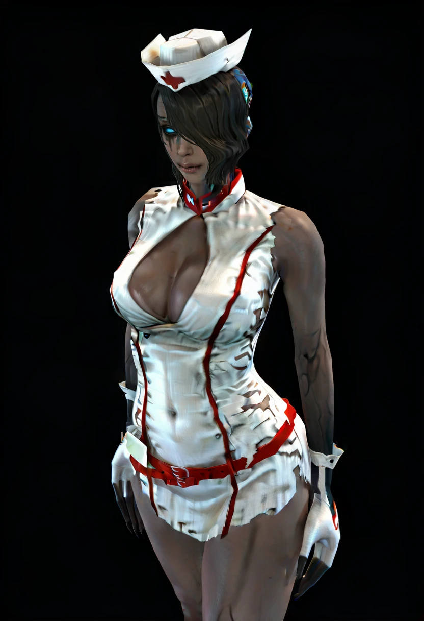 MaidenSlug,1girl,mature female,black hair,short hair,hair over one eye,glowing eyes,make up,nurse,nurse cap,hat,blue eyes,breasts,large breasts,cleavage,claws,dark skin,dark-skinned female,colored skin,torn clothes,white dress,gloves,nurse gloves,high heels,