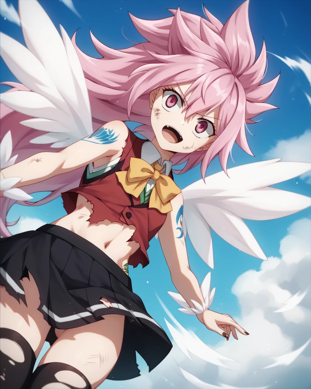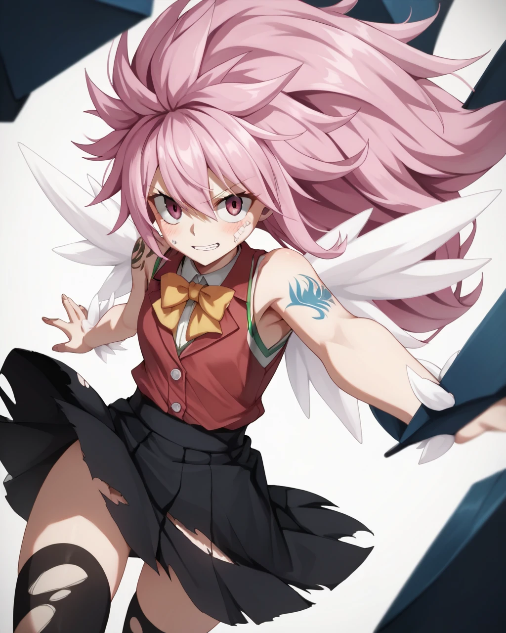 Wendy Marvell, 1girl, solo, long hair,pink eyes, pink hair,spiked hair,torn clothes,White wings,thighhighs,tattoo,red jacket,black skirt,sleeveless,yellow bowtie,