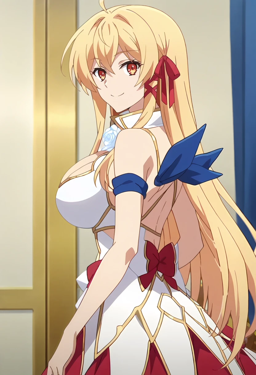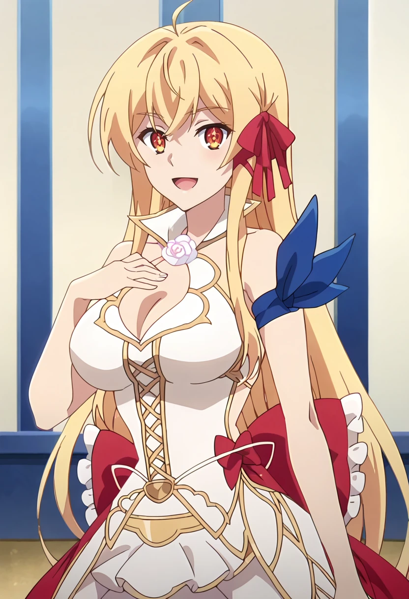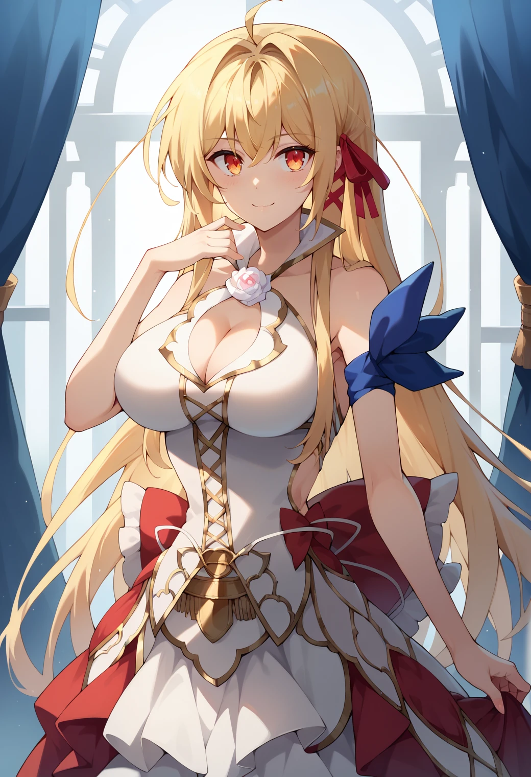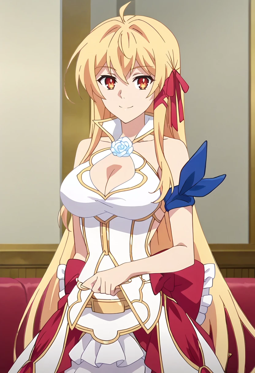 aliceliesebase, hair ribbon, ahoge, alixdefdress, sleeveless dress, cleavage, arm ribbon, > S2/LN