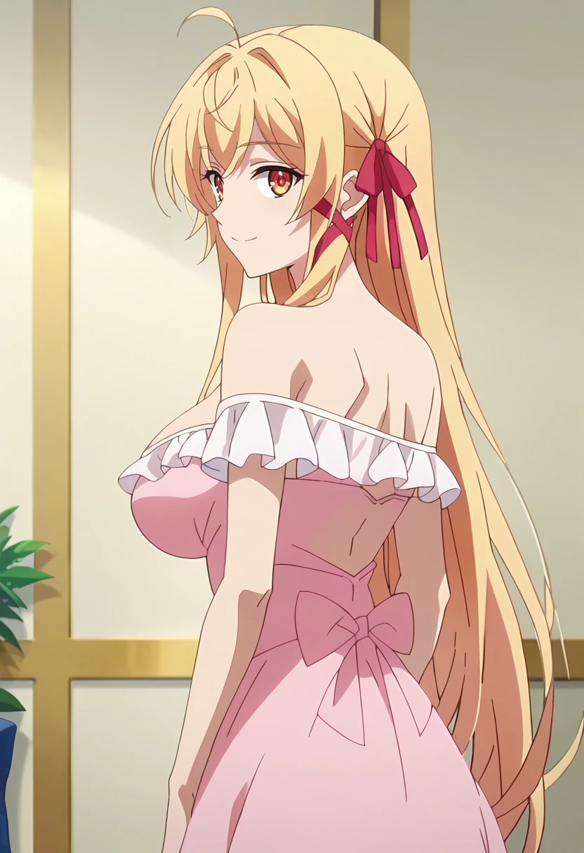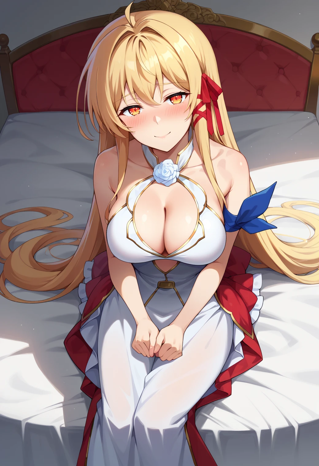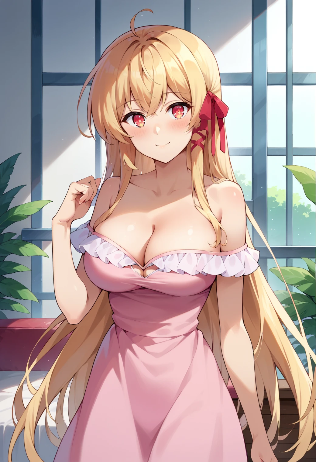 aliceliesebase, hair ribbon, ahoge, alixdefdress, sleeveless dress, cleavage, arm ribbon, > S2/LN