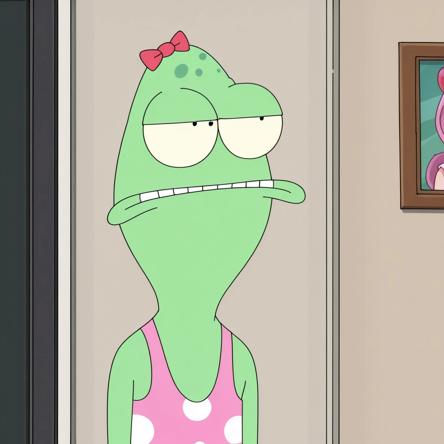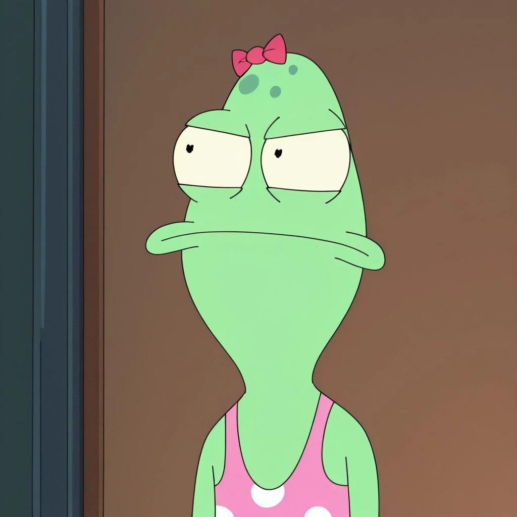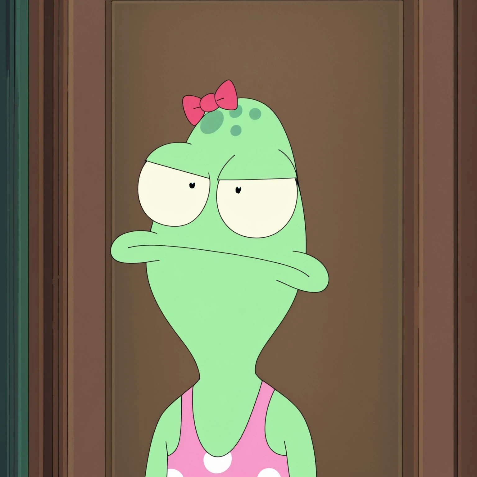 Jessie, 1girl, lime green alien, pink bow on head, pink polka dot sleeveless dress, white shoes,