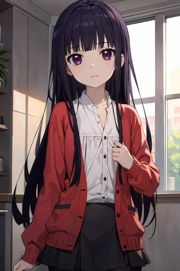 red cardigan, white shirt, black pantyhose, black skirt