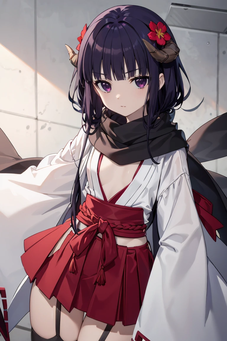 horns, hair flower, miko, hakama short skirt, black scarf, black thighhighs, garter straps, hip vent
