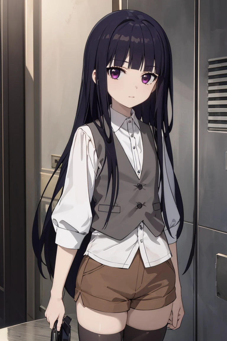 Vest and long shirt: grey vest, cropped vest, untucked shirt, brown shorts, black thighhighs (sometimes need more weight in "untucked shirt")