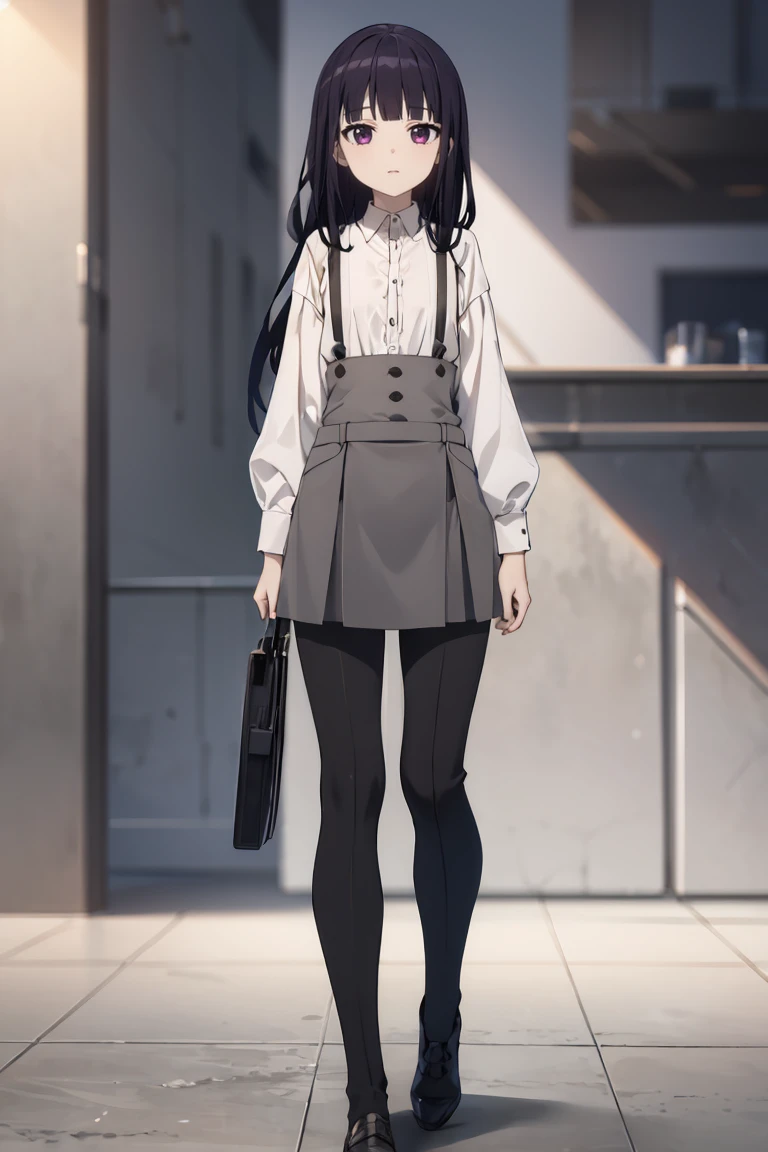Dress and suspenders: suspenders, white shirt, grey dress, black pants