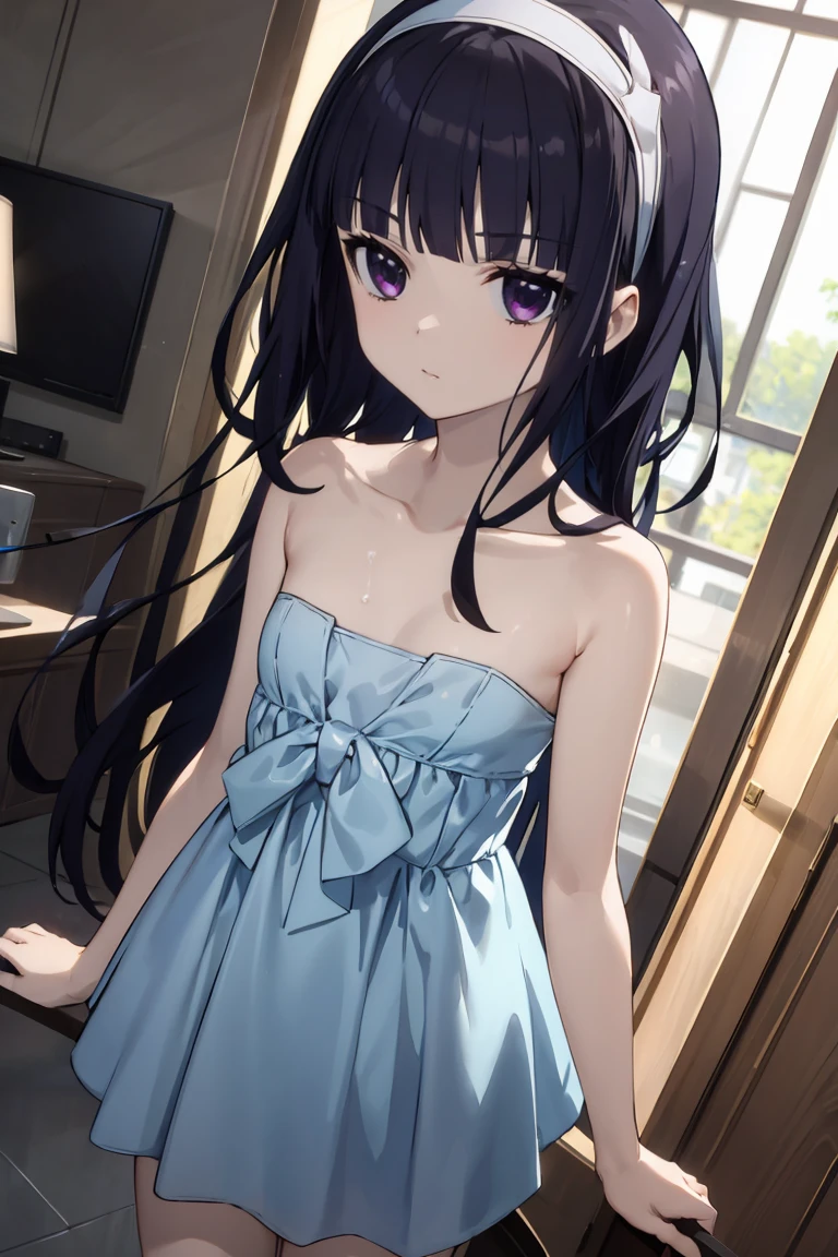 Blue dress: hairband, blue dress, strapless, bare legs (completely imperfect)