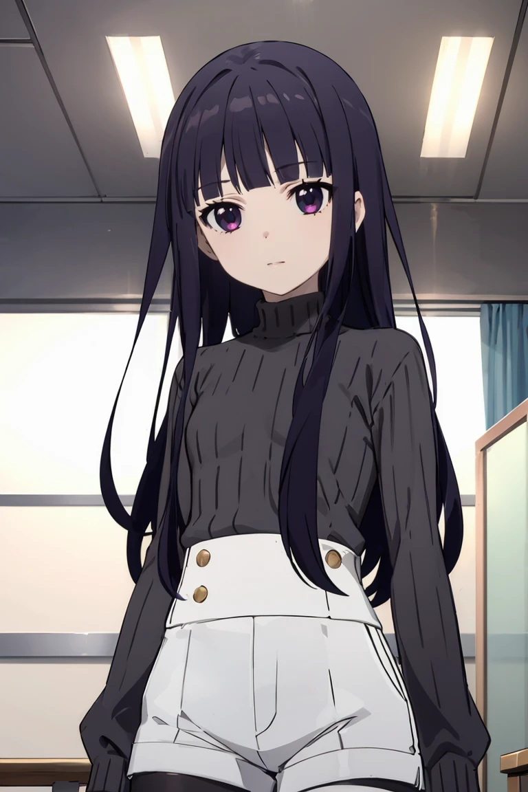 Sweater and shorts: black sweater, turtleneck, white shorts, black pantyhose