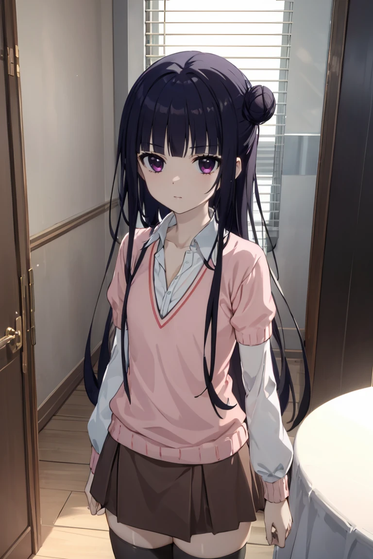 single hair bun, pink sweater, white shirt, single hair bun, brown skirt, black thighhighs, short sleeves, long sleeves