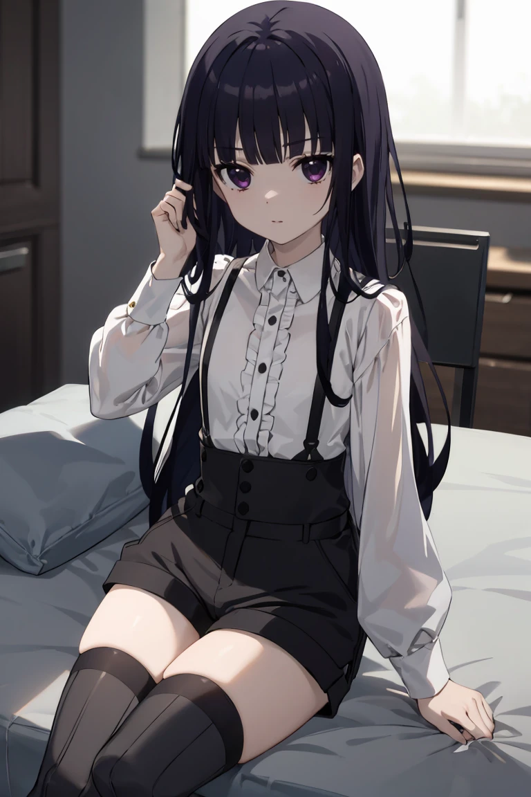 white blouse, suspenders, black shorts, black thighhighs, vertical-striped thighhighs, black thighhighs