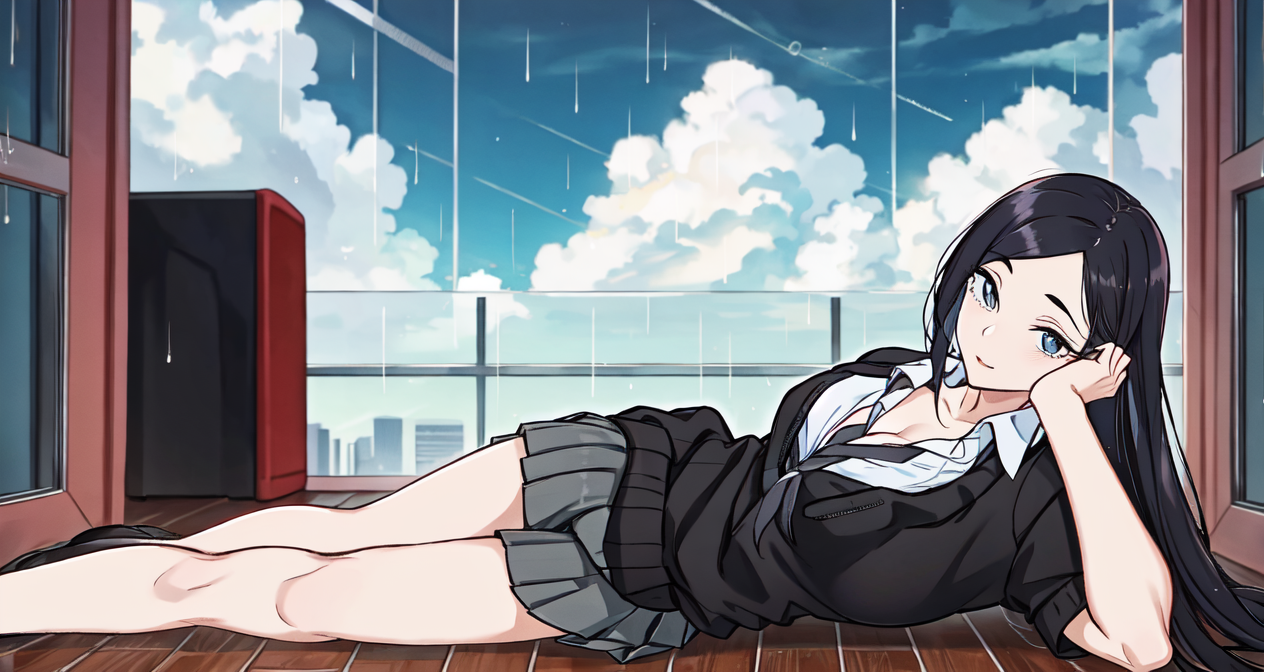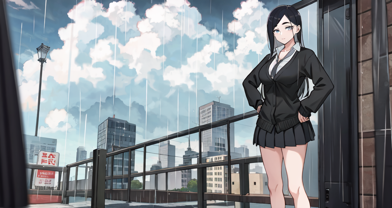Recommended prompts if you want to more close to original character: 1girl, (((solo))), toyoda_(yancha gal), black, hair, long hair, school custome, blue eyes, cleavage, sharped eyes, teasing, medium breasts, black skirt, bare legs, school shoes, city, black cardigan, grey tones, tie, collarbone, large legs, pleated skirt