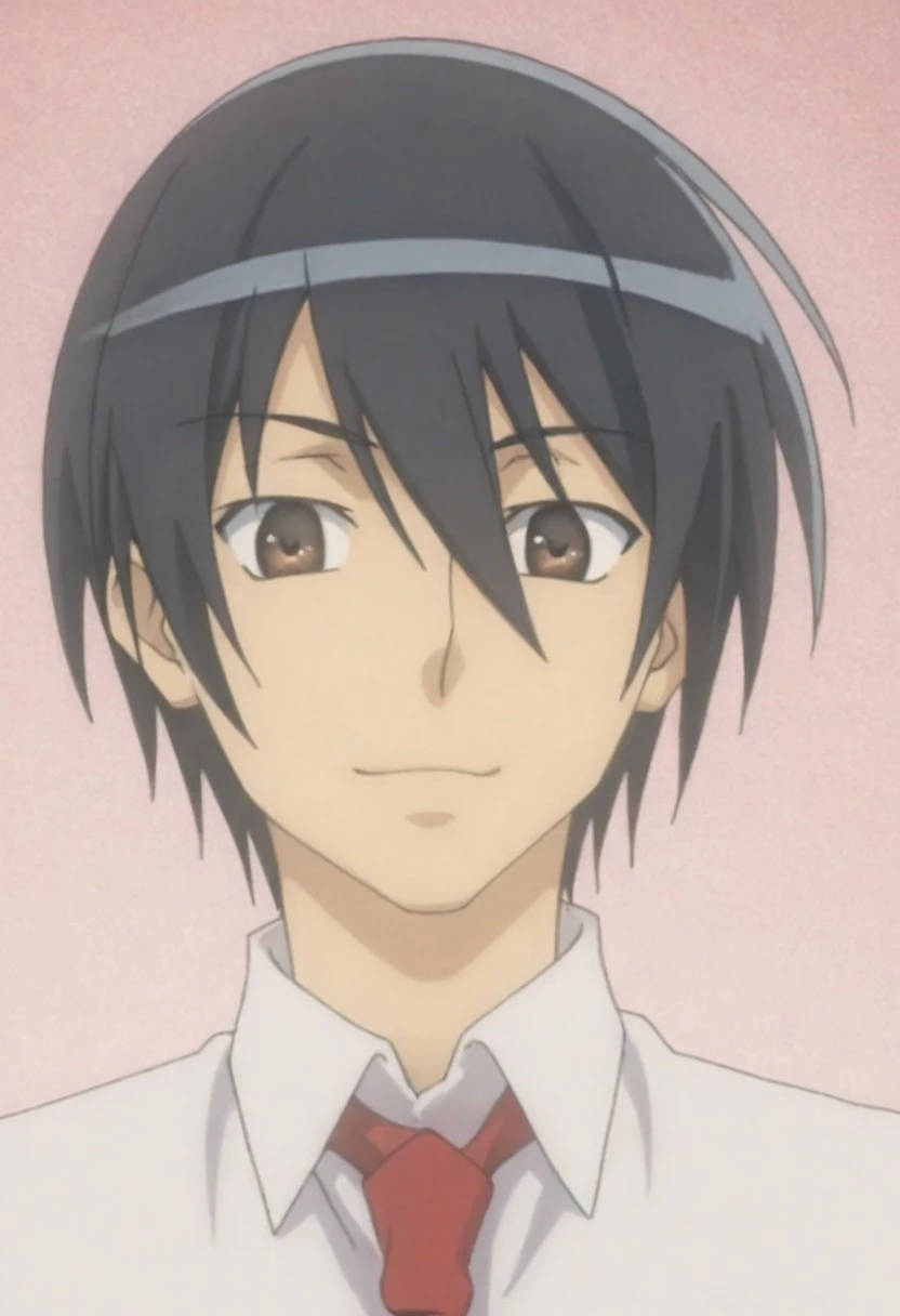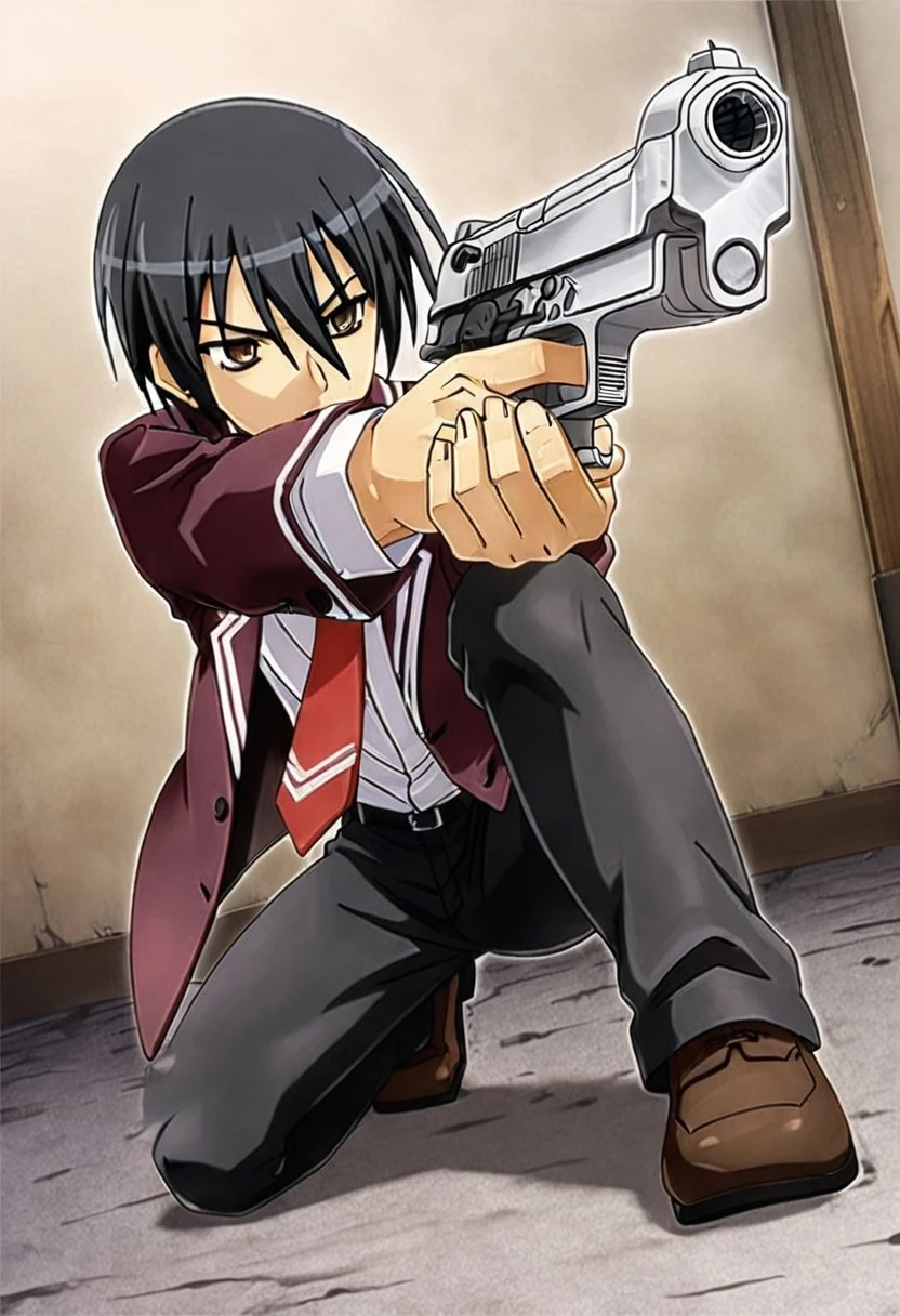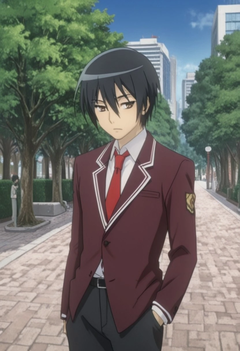 Kinji Toyama, black hair, brown eyes, dark maroon blazer, white accents, red necktie, white collared undershirt, black pants