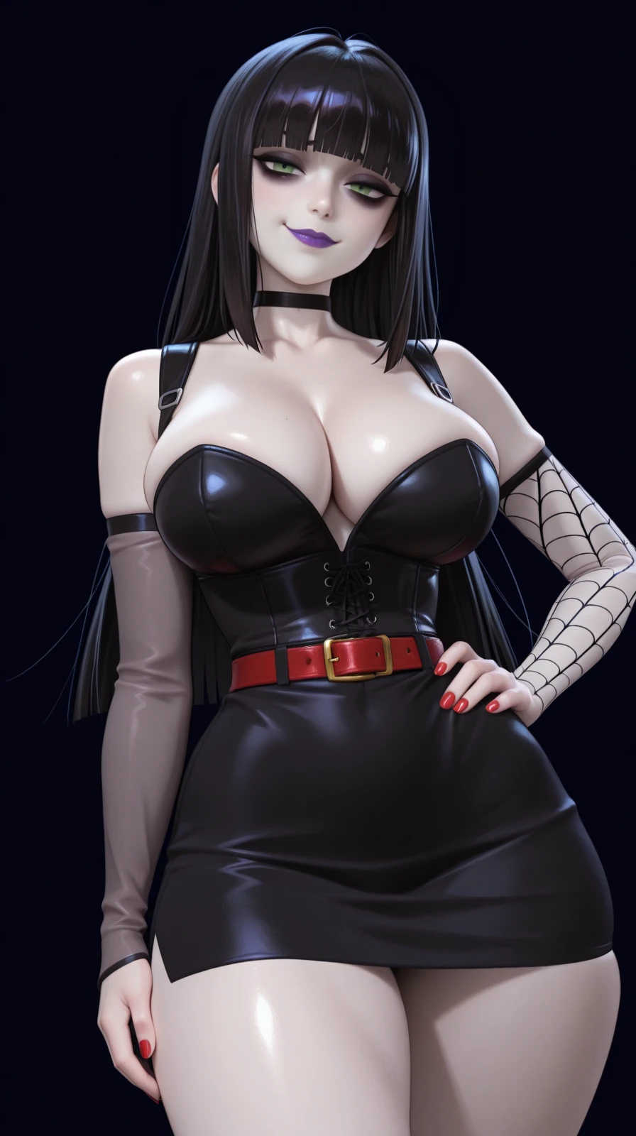 cleavage, black corset, black short skirt, red belt, tight clothes, black stockings, latex stockings