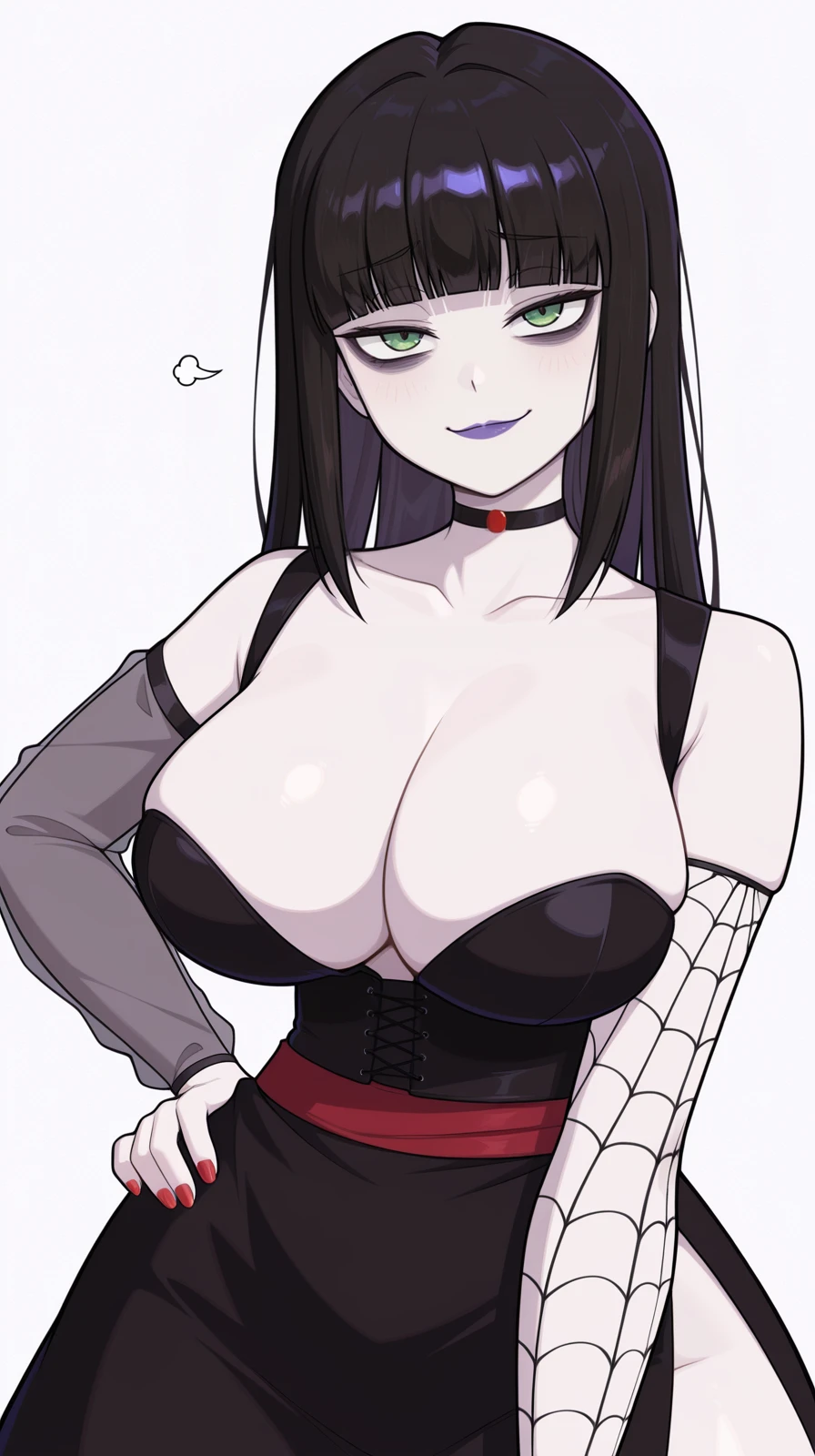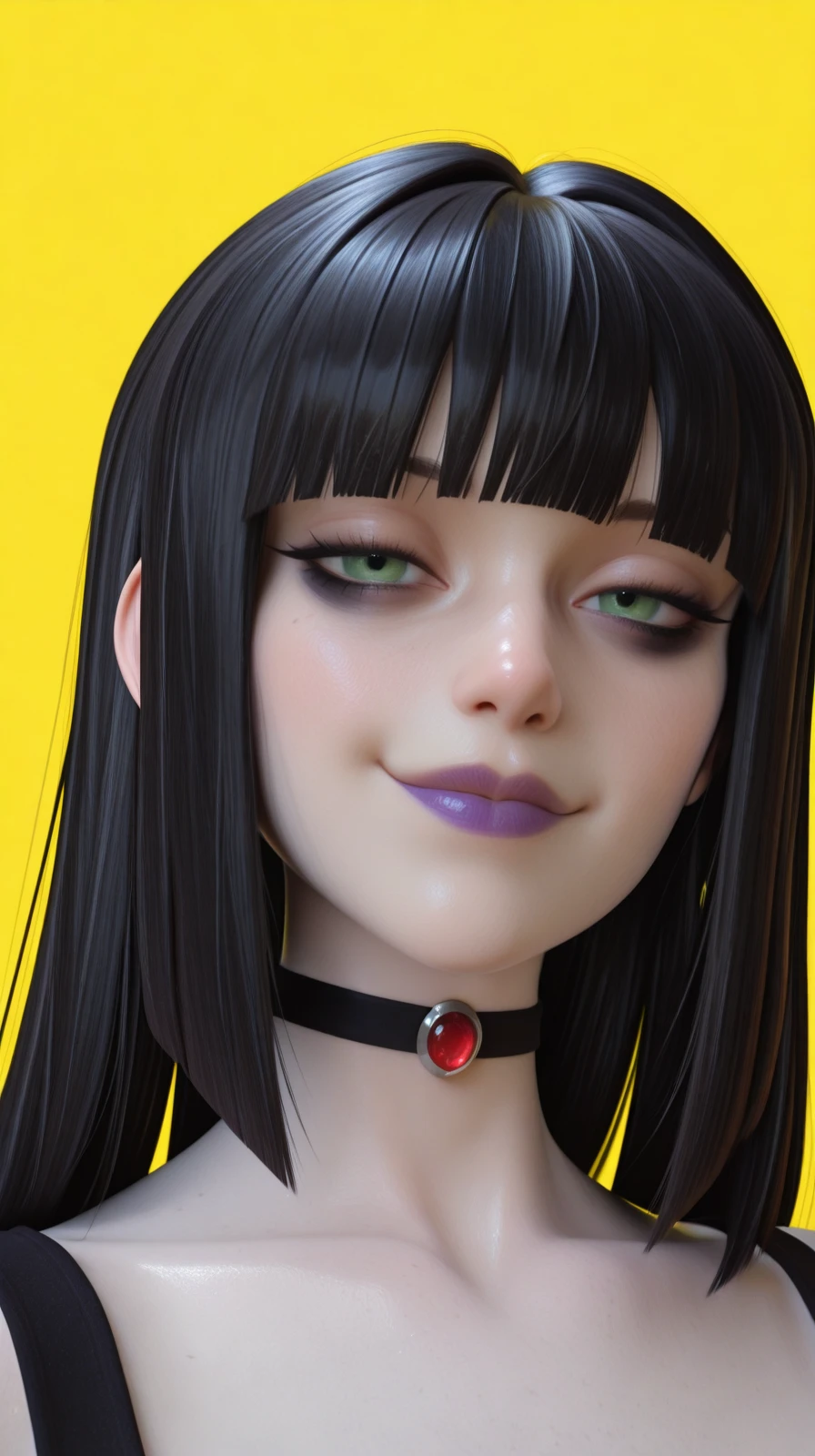 pale skin, purple lipstick, green eyes, black eyeliner, black hair, hime cut, blunt bangs, grey skin, black choker,