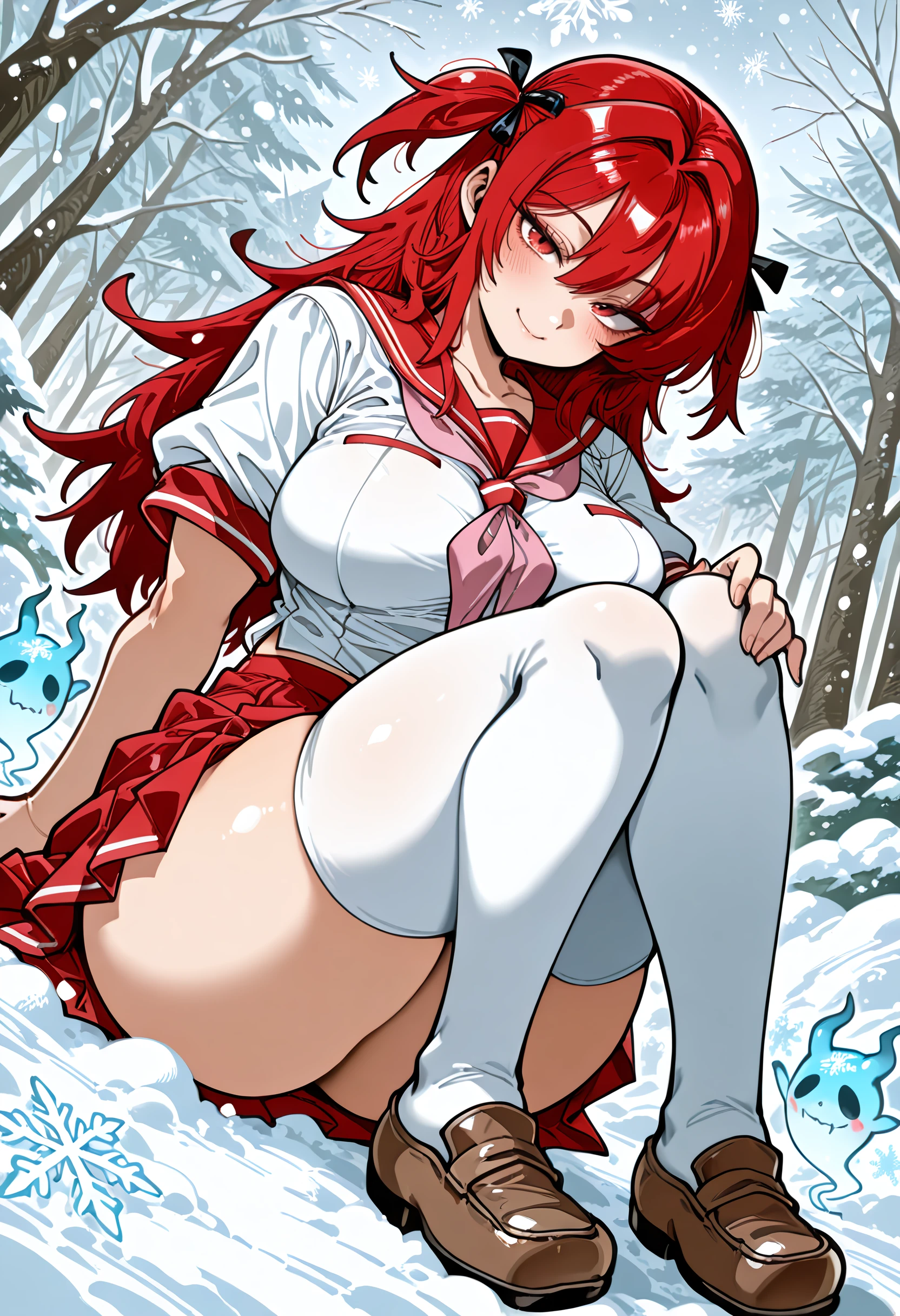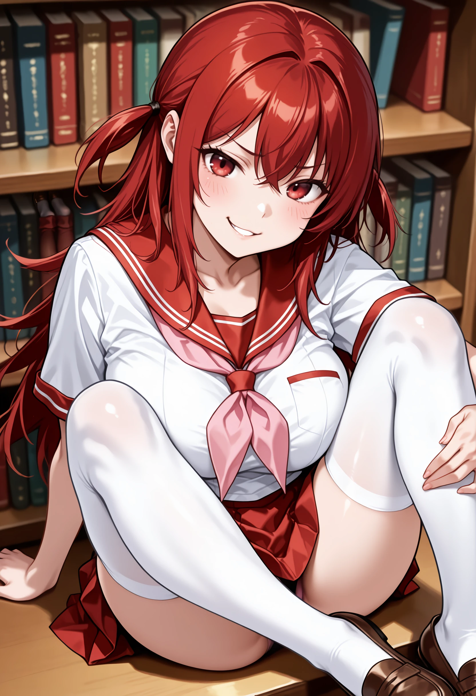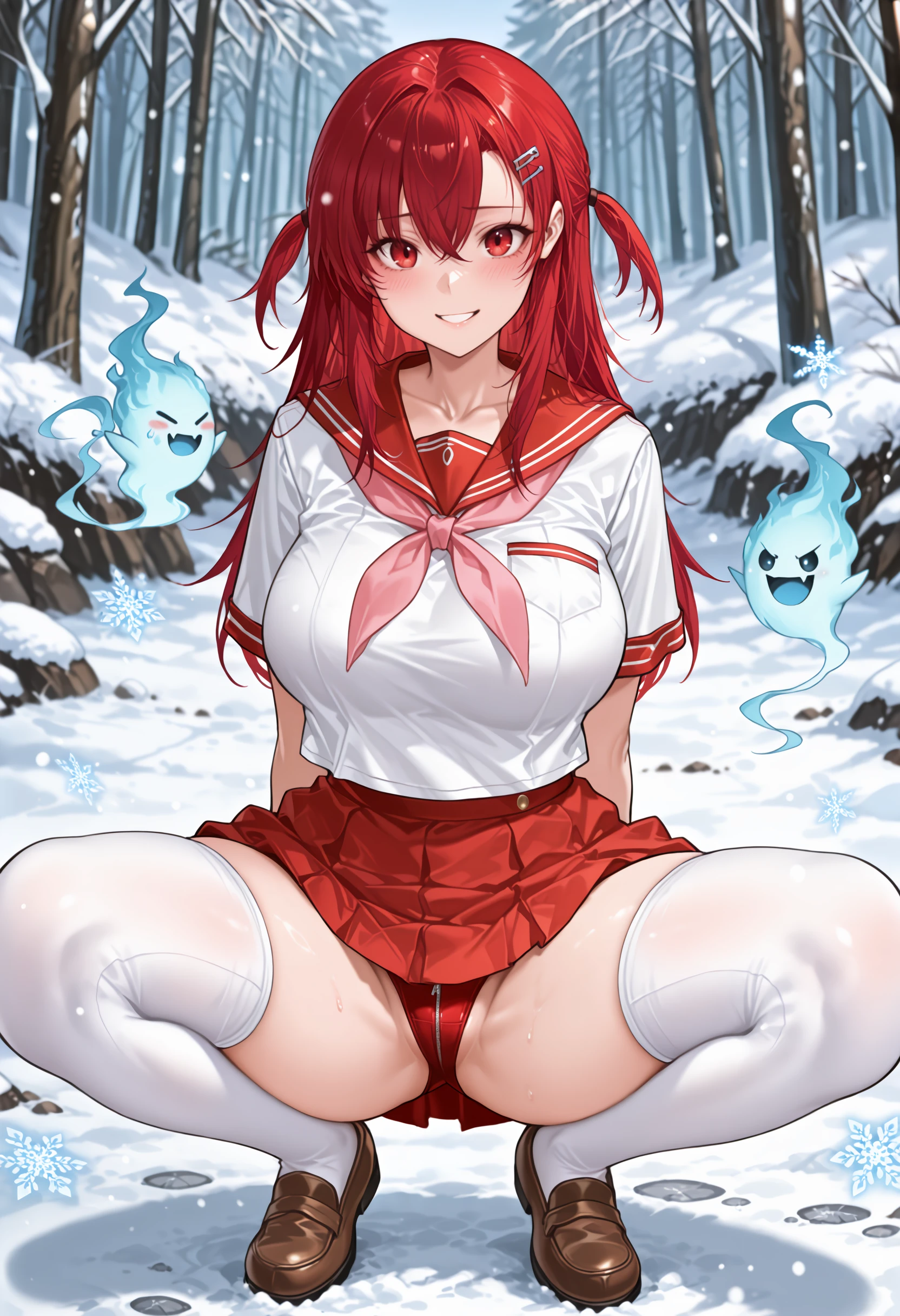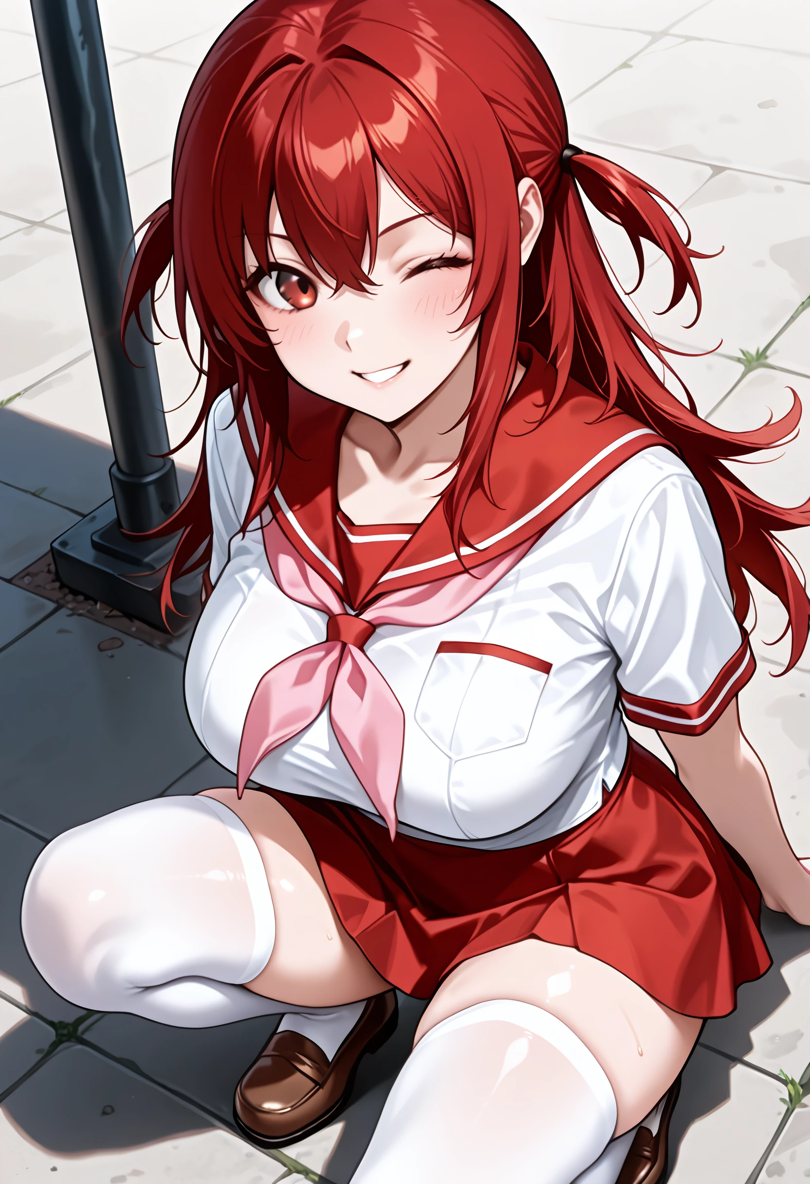 Default Outfit: defsachie, red skirt, white shirt, zipper, school uniform, serafuku, white thighhighs, brown footwear, pink neckerchief, loafers, short twintails,