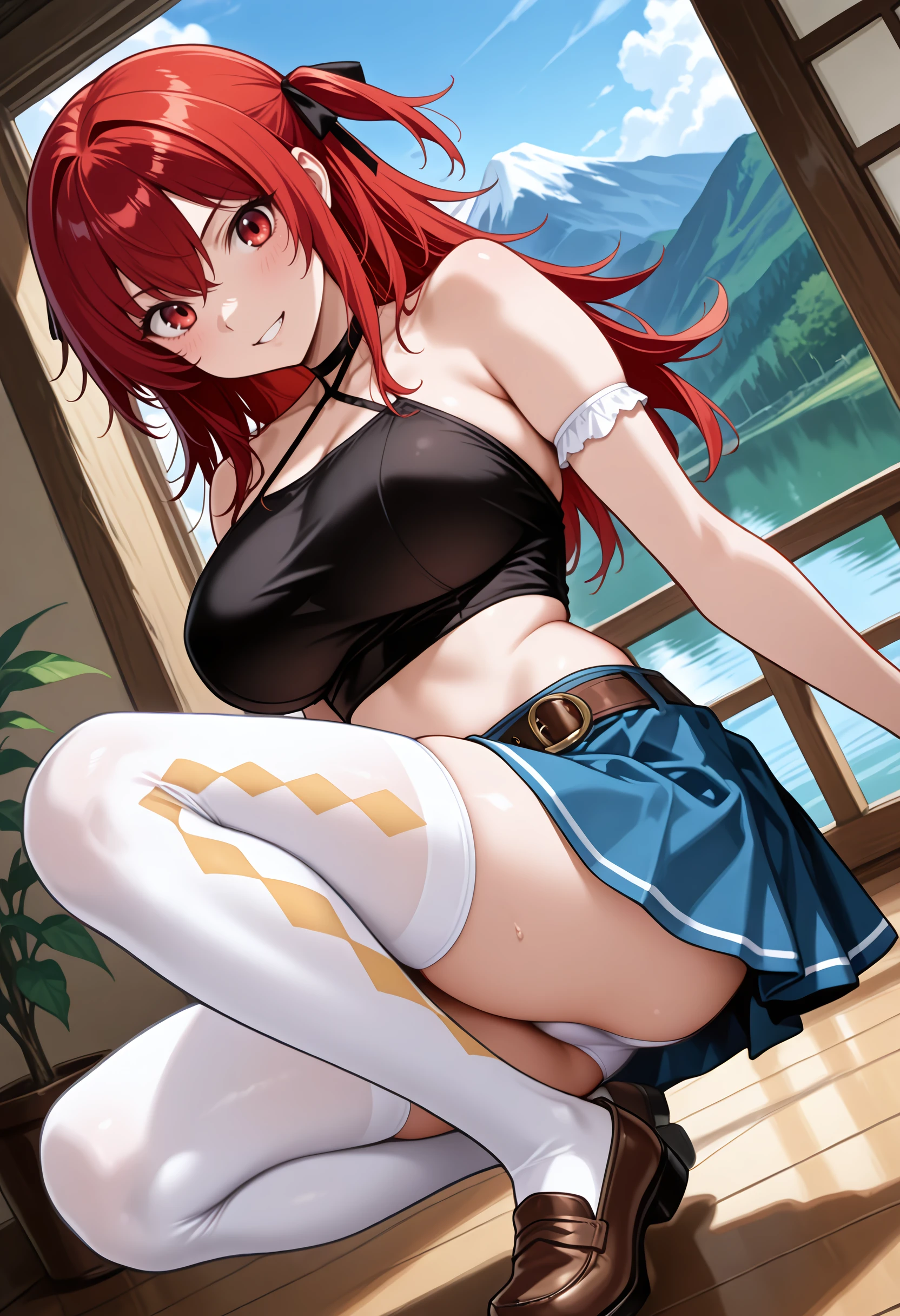 altsachie, blue skirt, bare shoulders, brown footwear, loafers, belt, white thighhighs, white panties, halterneck, argyle legwear, armlet, black ribbon, short twintails, black_shirt, crop_top, taut_shirt,