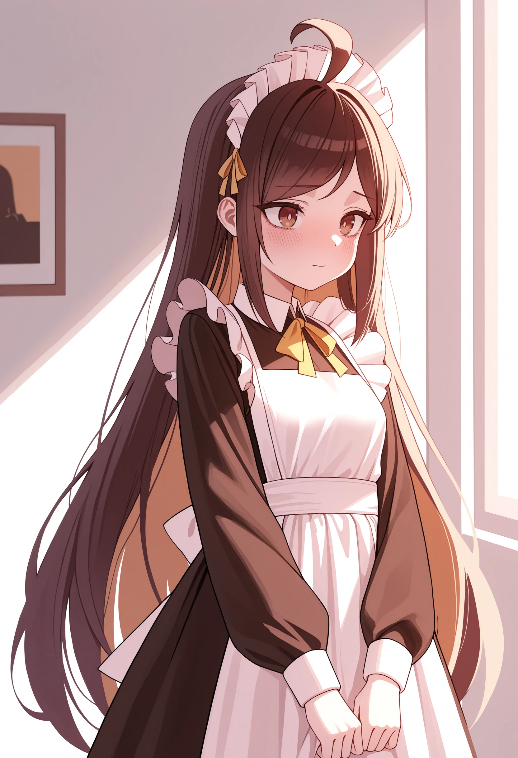 MariPony, small breast, light skin, brown hair, long hair, bangs, very long hair, ahoge, brown eyes