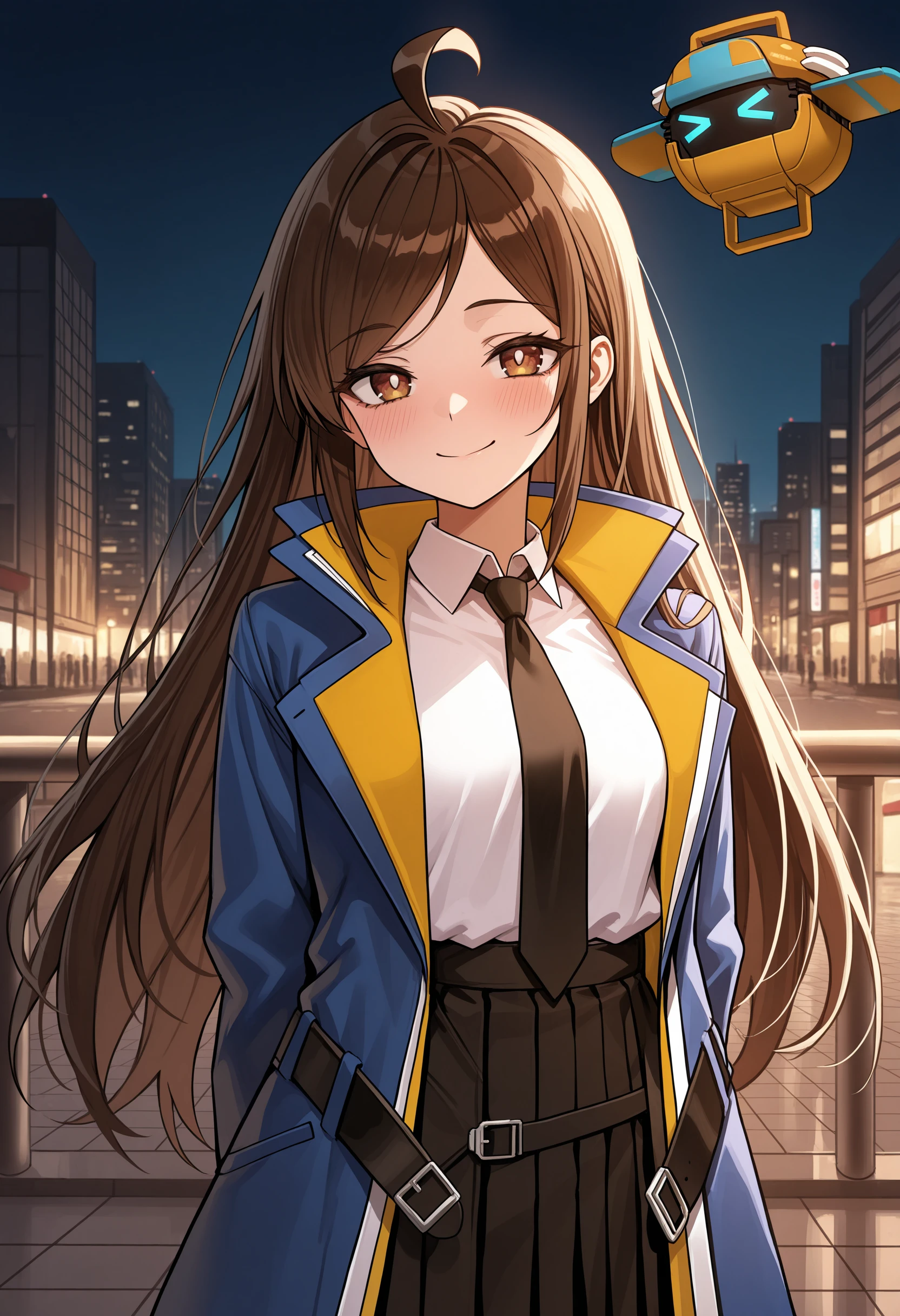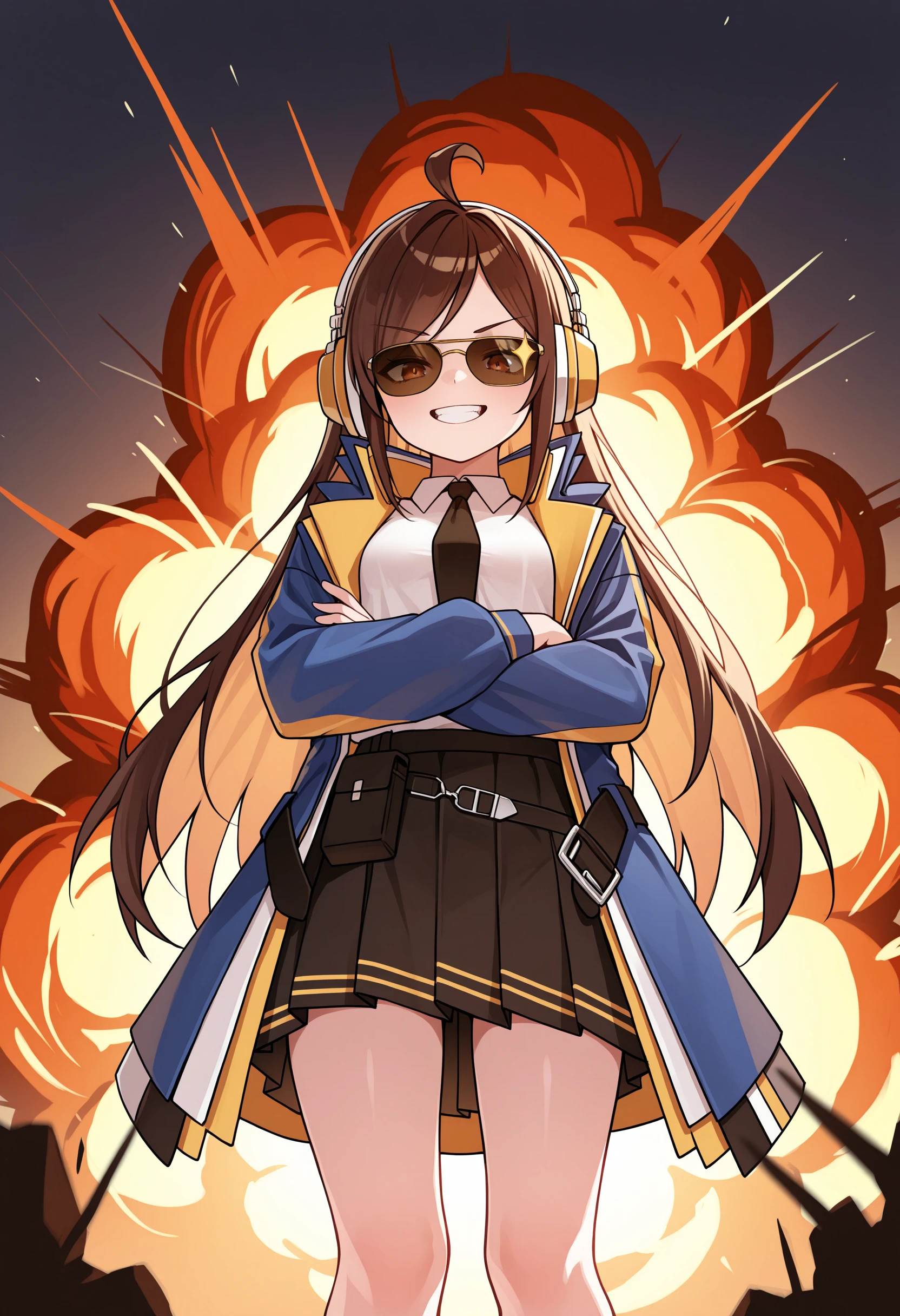 oversized clothes, white shirt, Blue jacket, yellow stripes, open jacket, black necktie, black skirt, plead skirt, jacket belt