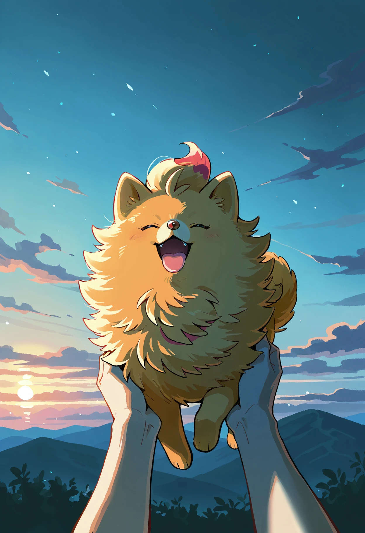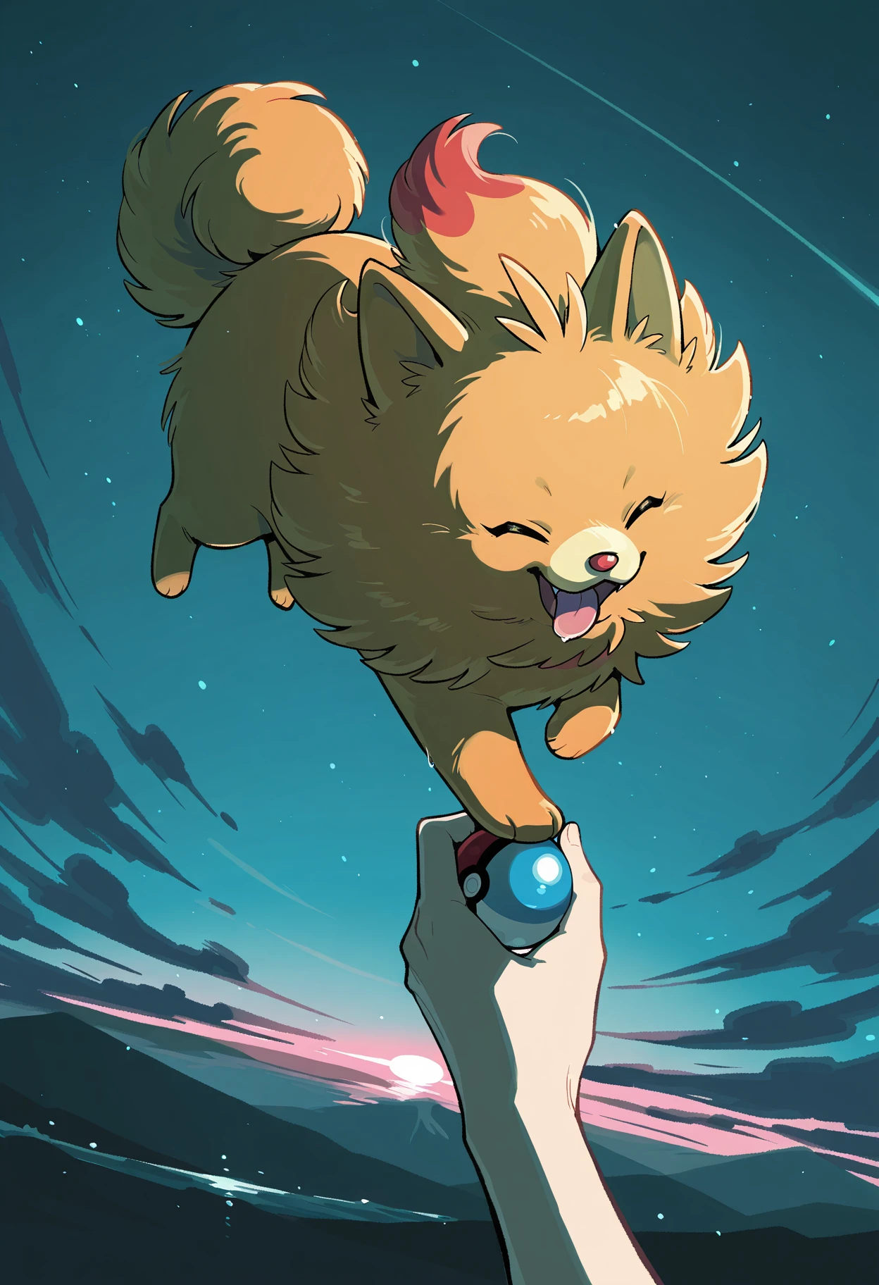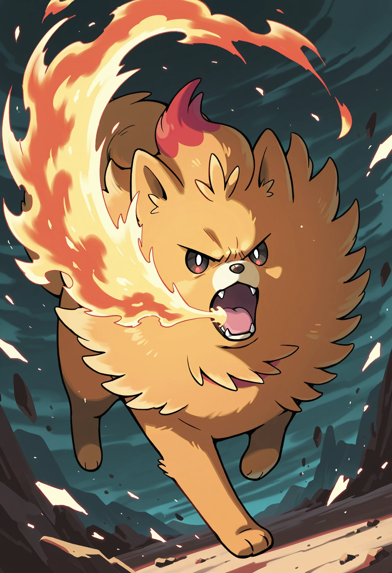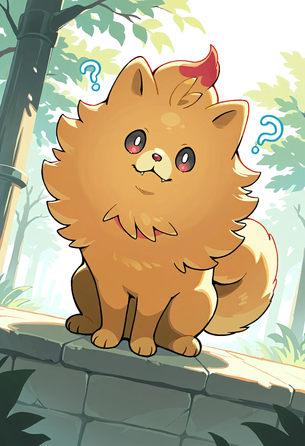 PKMNPombon, 1other, pomeranian (dog), pokemon (creature), two-tone eyes, black eyes, red eyes, white pupils, orange fur,