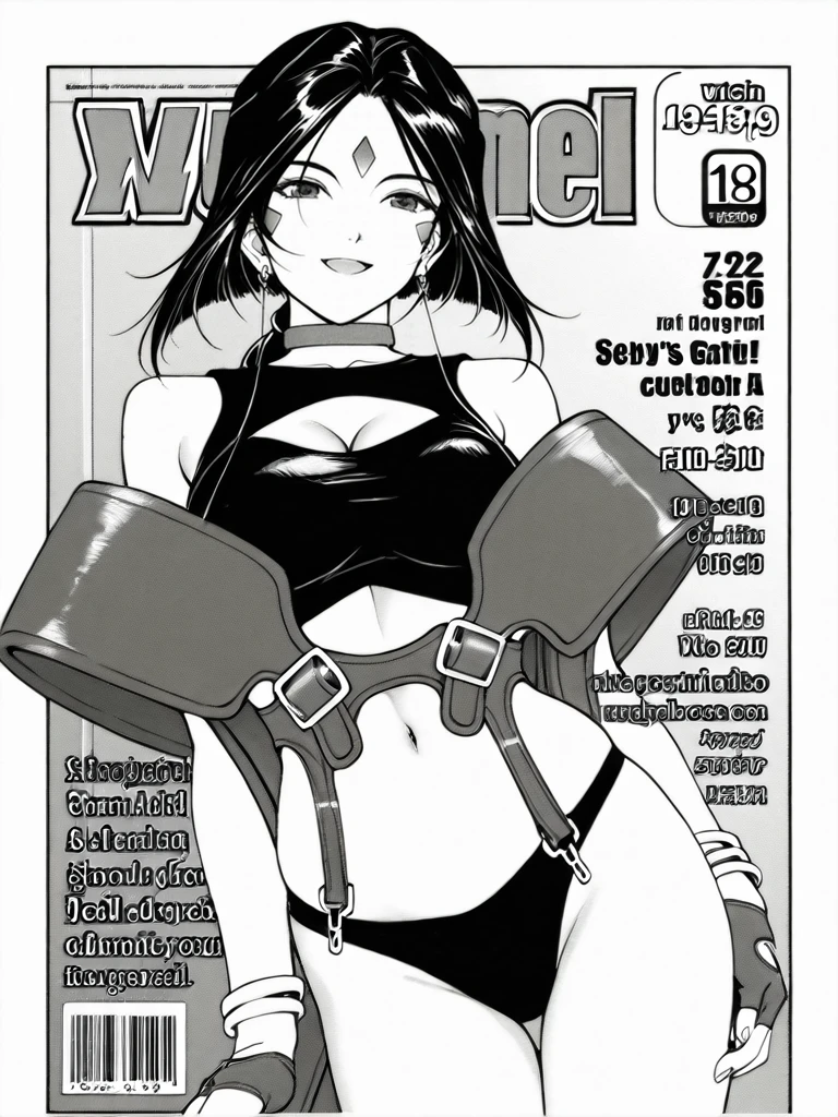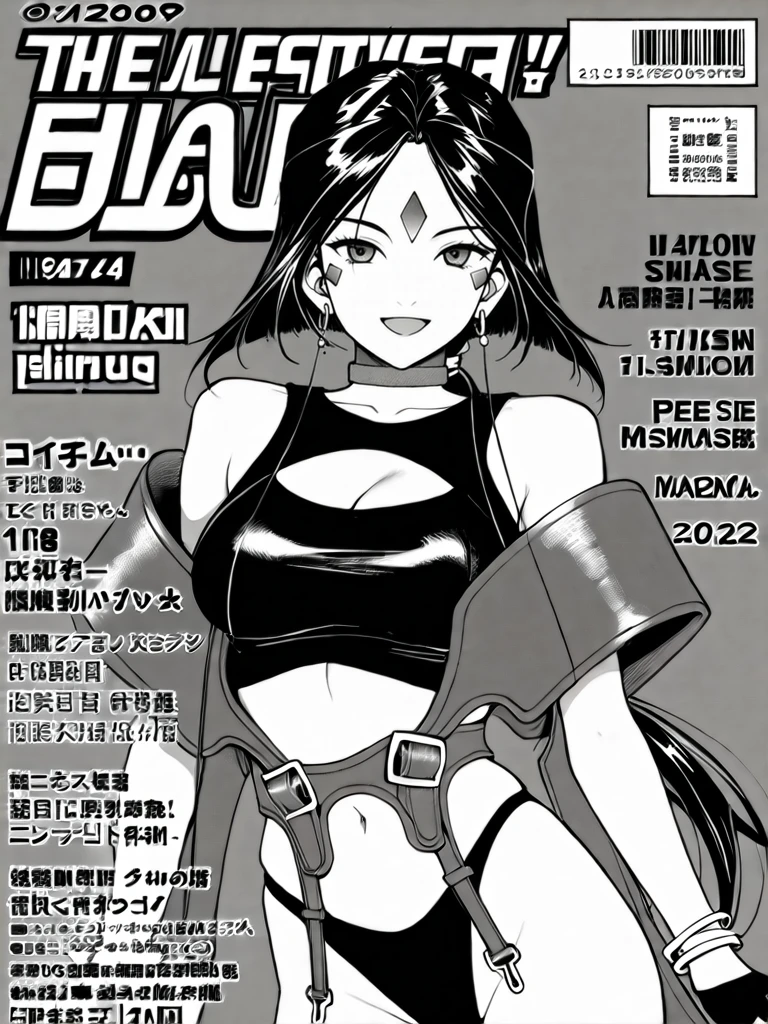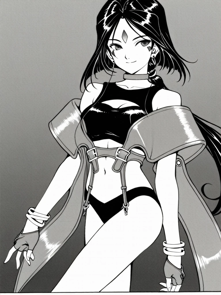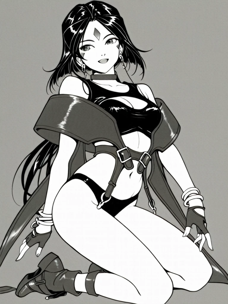,greyscale,monochrome,facial mark,forehead mark,long hair,low ponytail,black hair,medium breasts,cleavage,navel,bare shoulders,earrings,choker,bracelet,fingerless gloves,panties,midriff,clothing cutout,cleavage cutout,