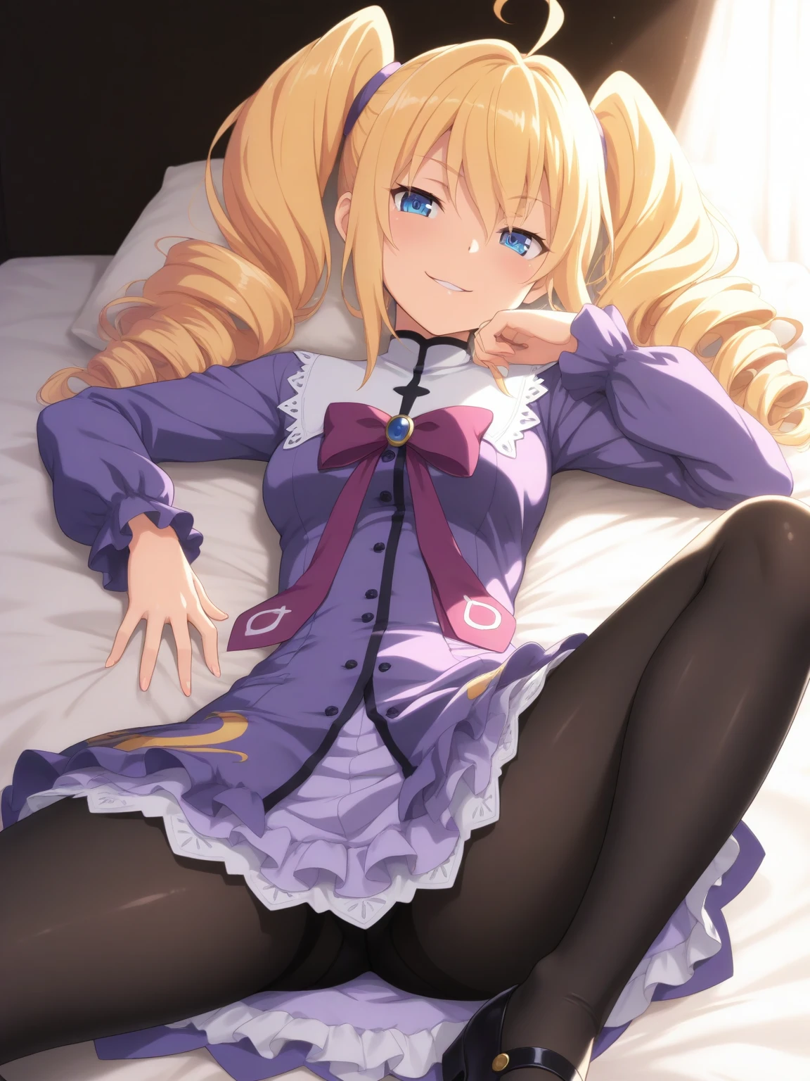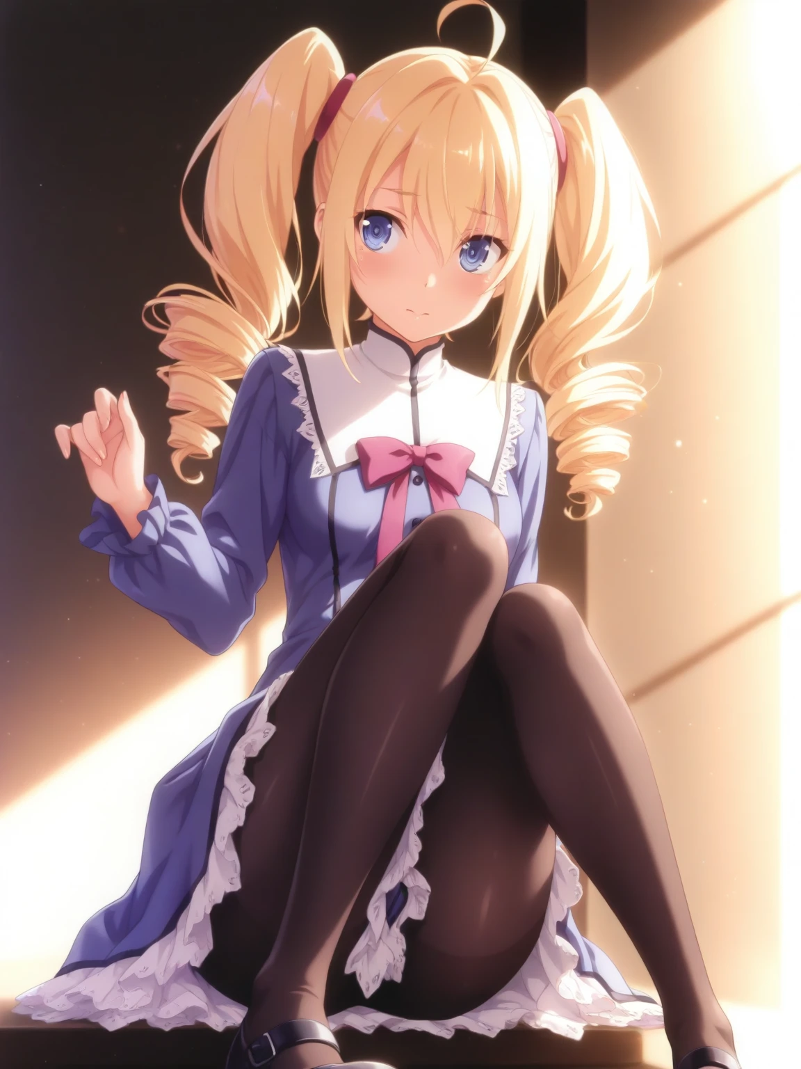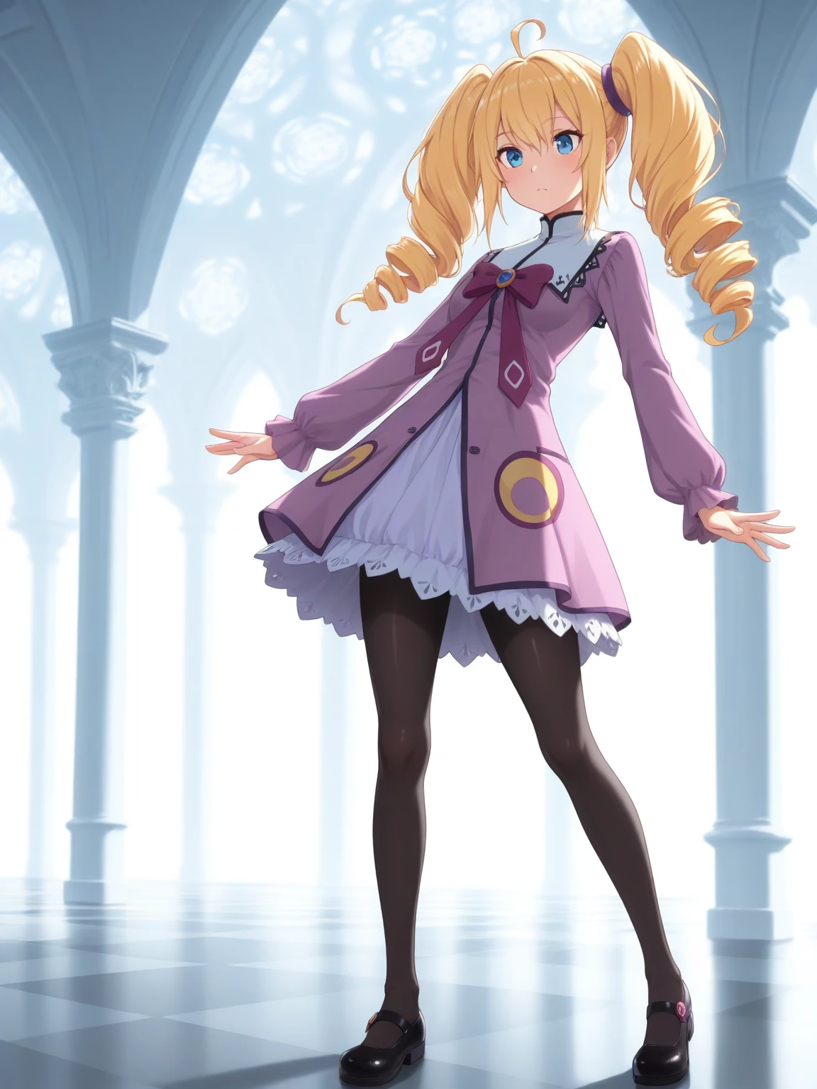 Dress: (RavelDress, blue eyes, blonde hair, twintails, twin drills, ahoge), (light purple dress, long sleeves), purple bow, black pantyhose, purple mary janes,