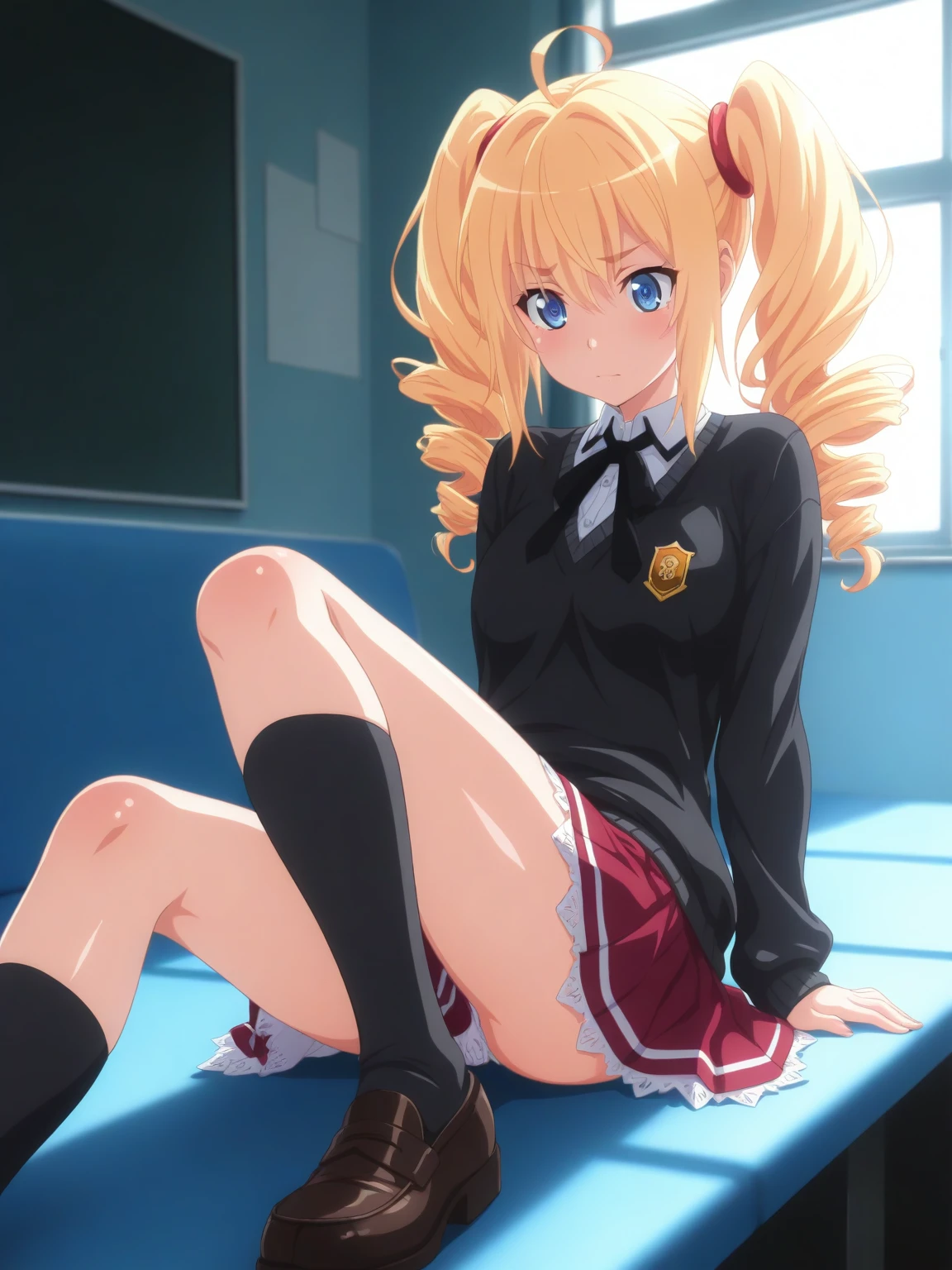 Uniform: (RavelSchool, blue eyes, blonde hair, twintails, twin drills, ahoge), school uniform, black sweater, red skirt, neck ribbon, socks, loafers,