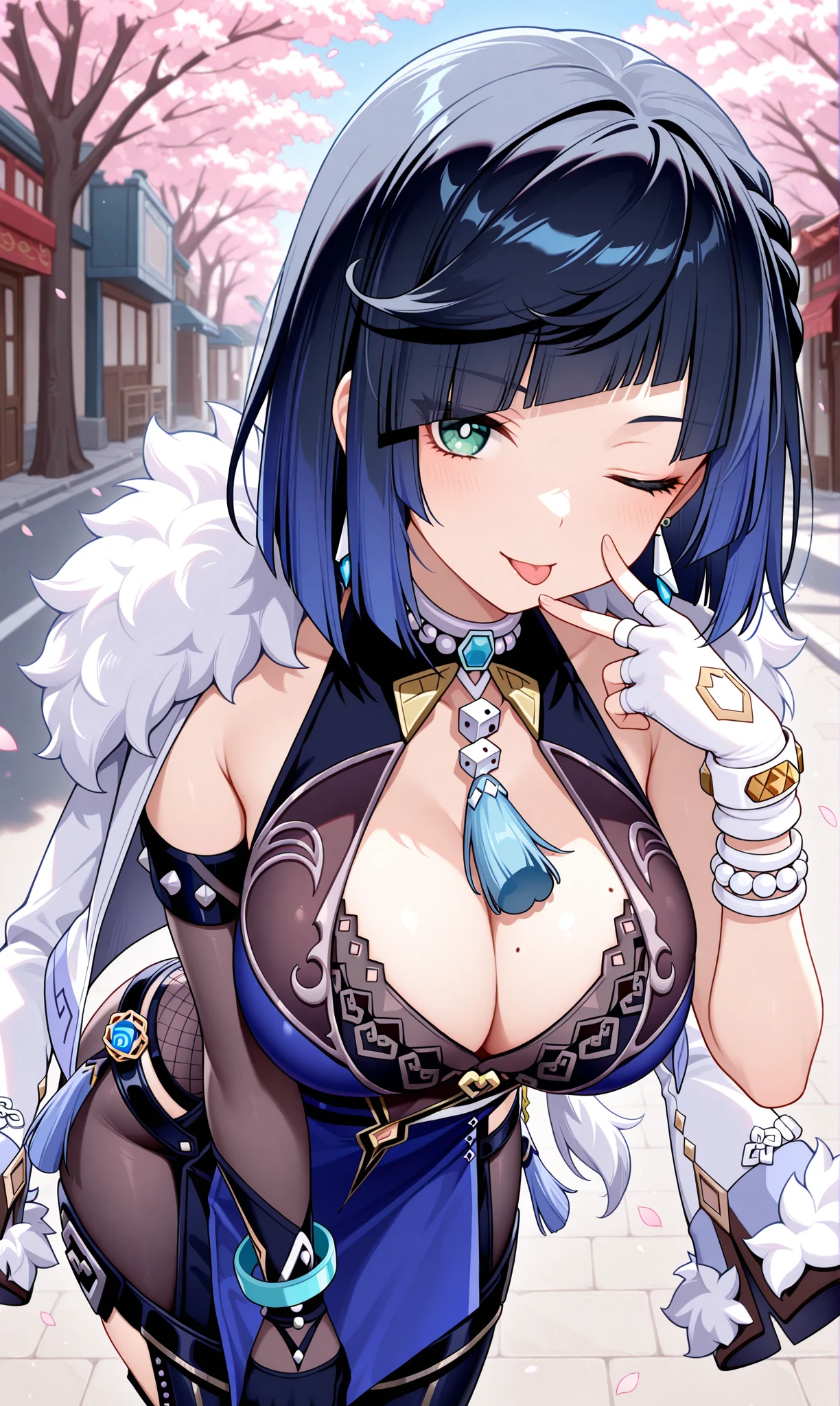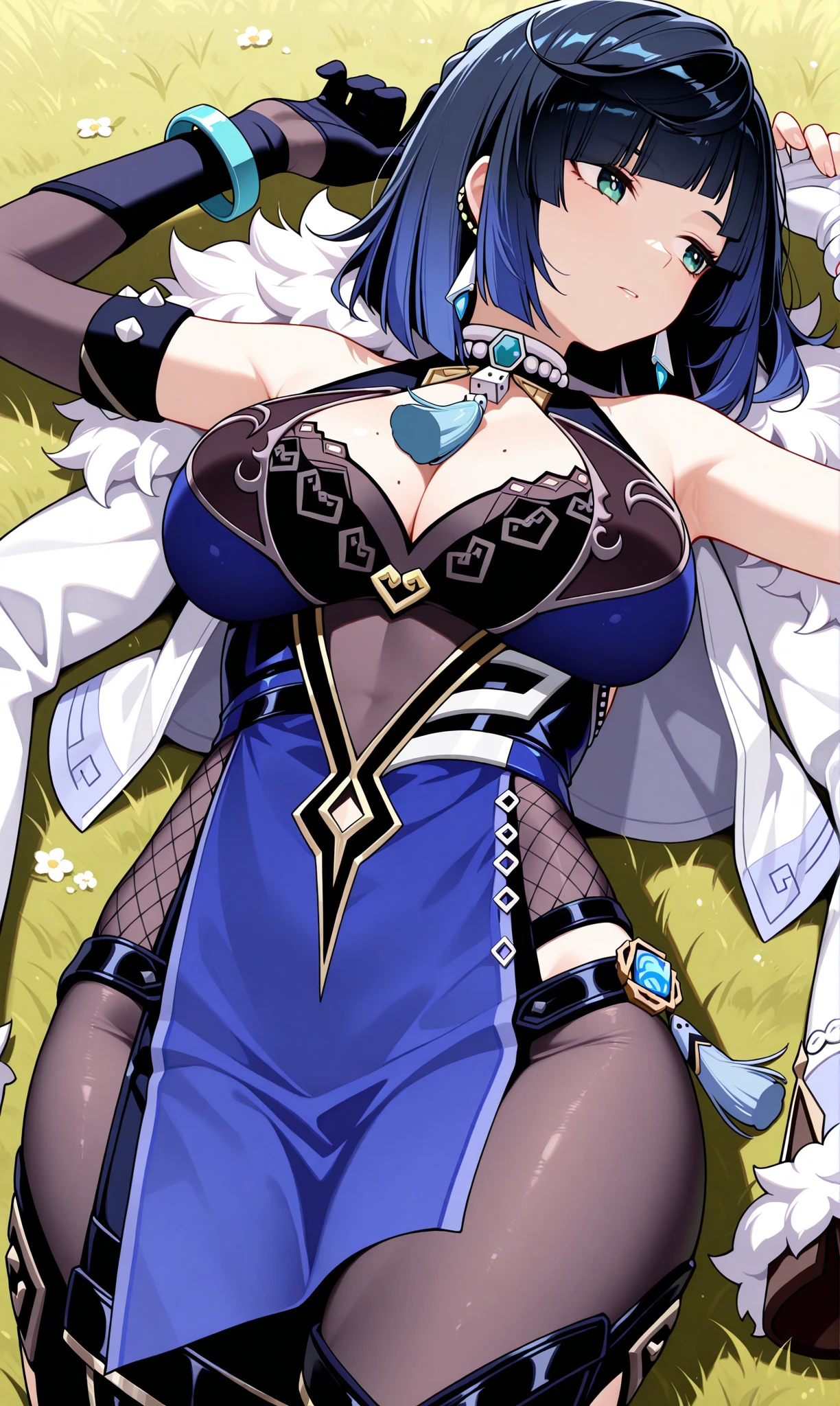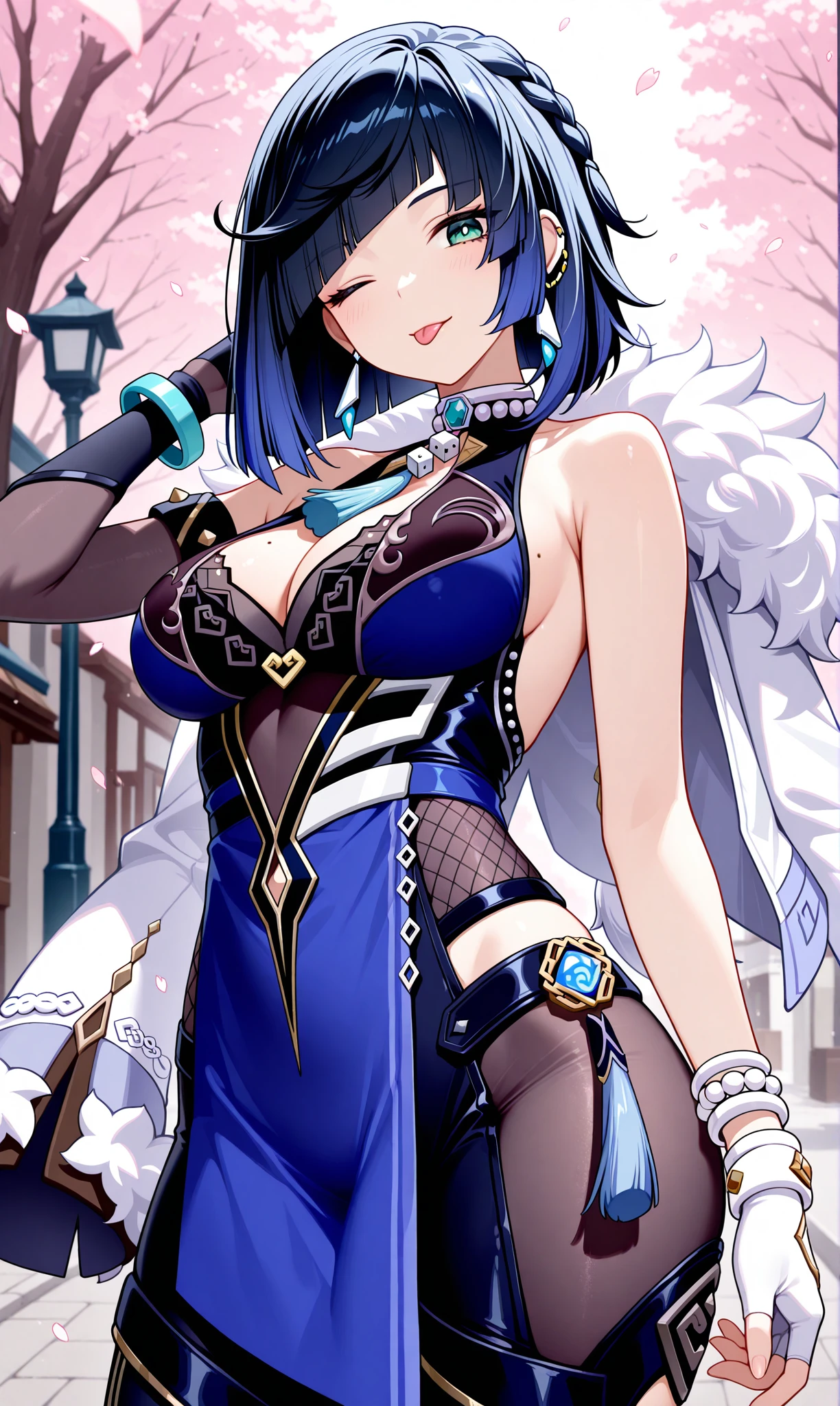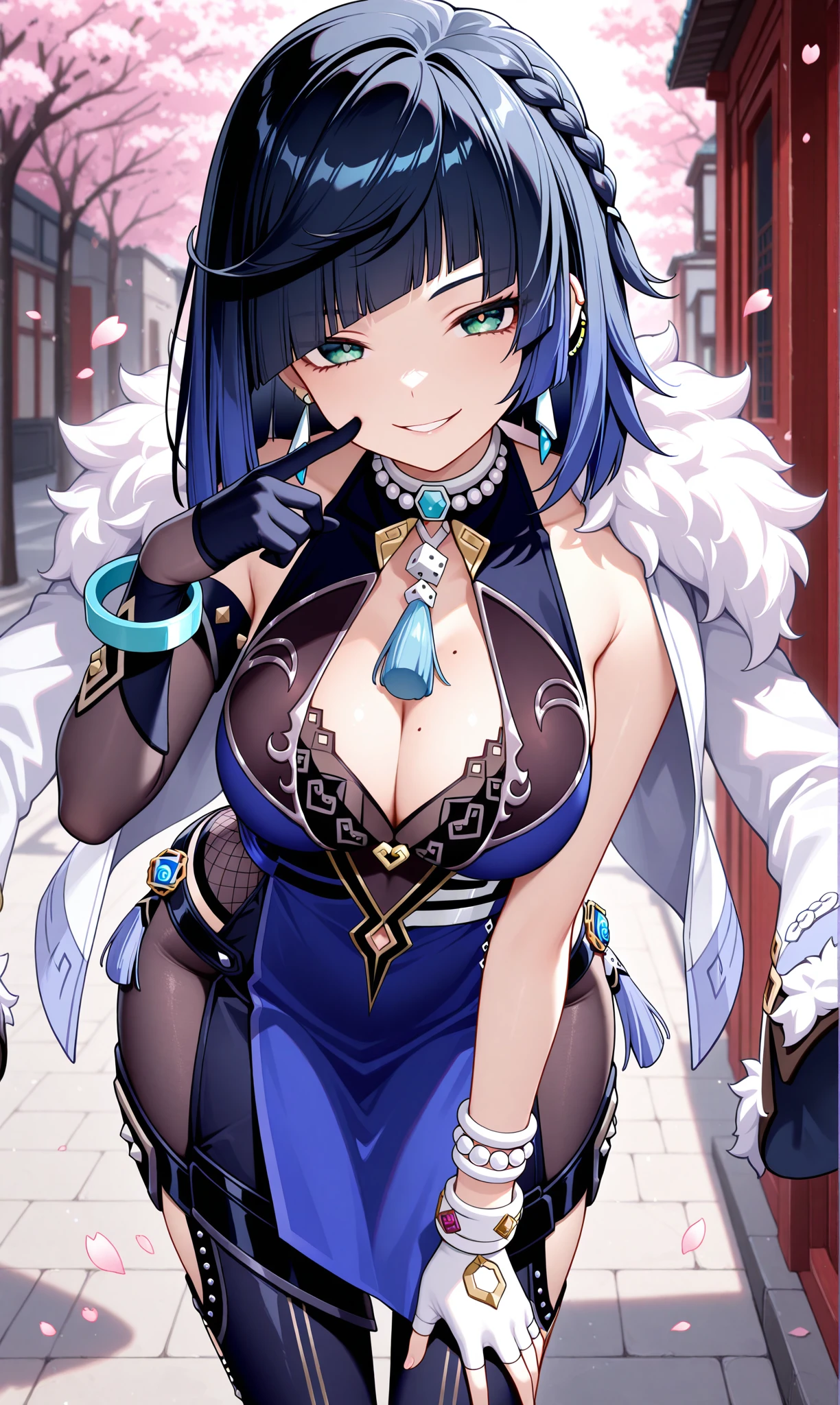 yelan (genshin impact), mole, mole on breast, green eyes, black hair, two-tone hair, short hair, bobcut, diagonal bangs, earrings๐ข๐๐๐ณ๐ถ๐: