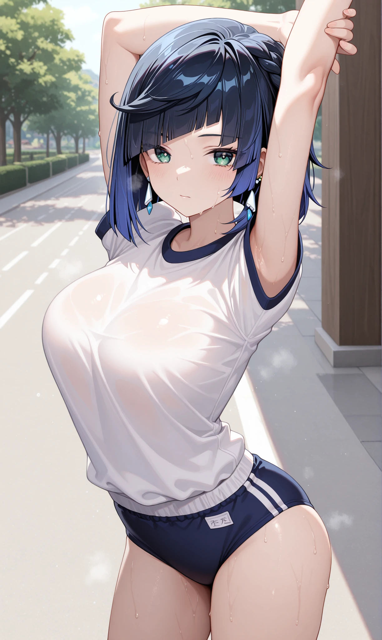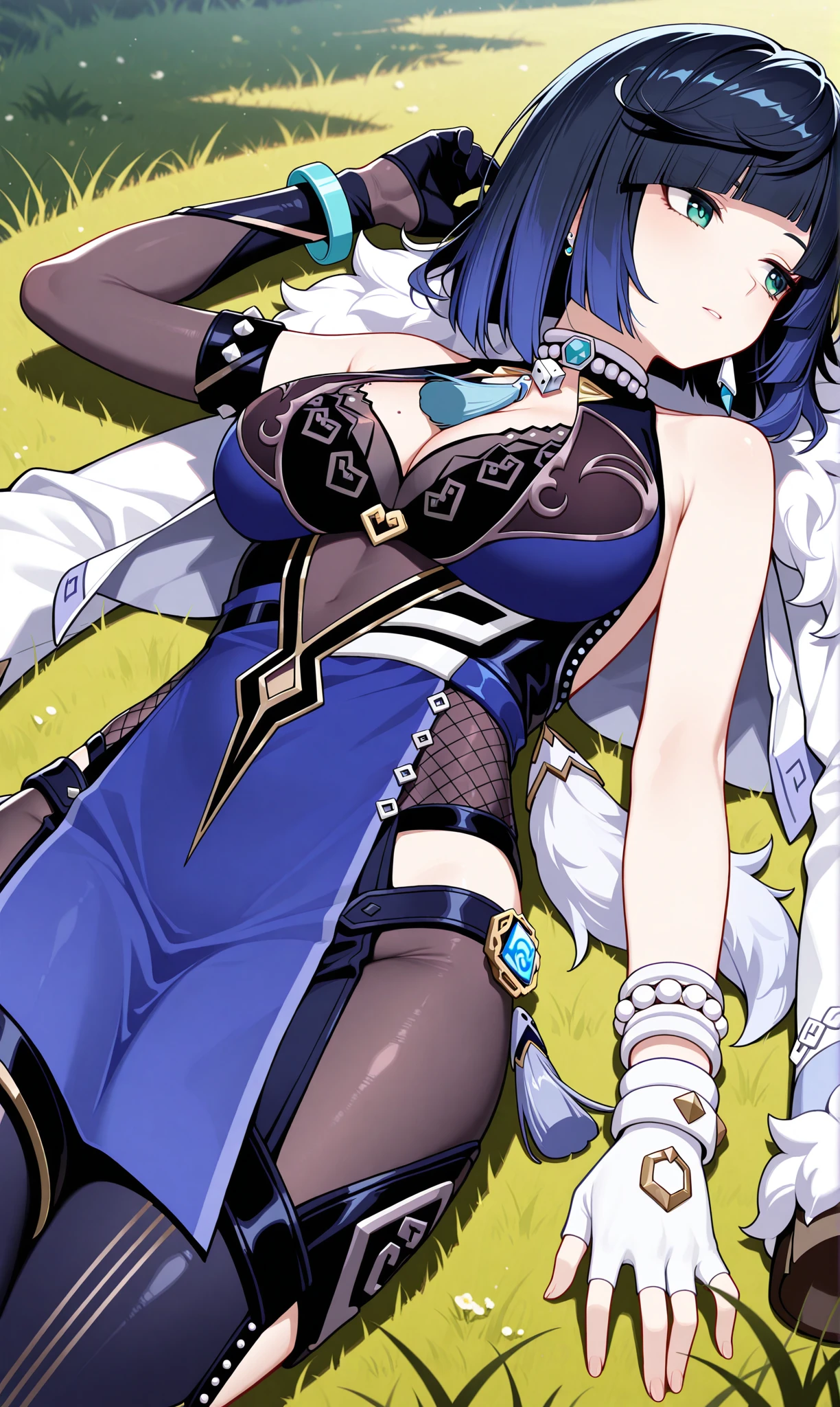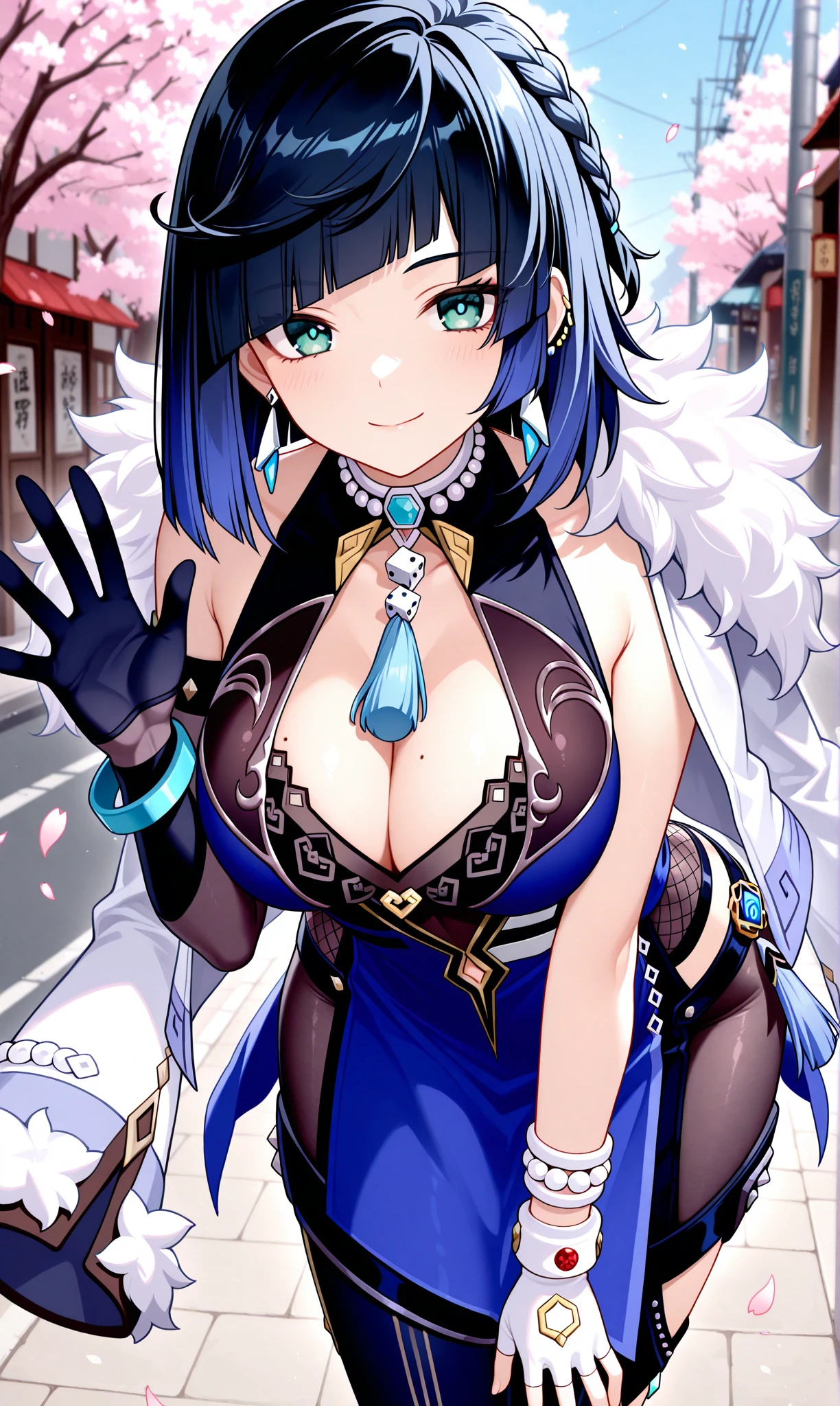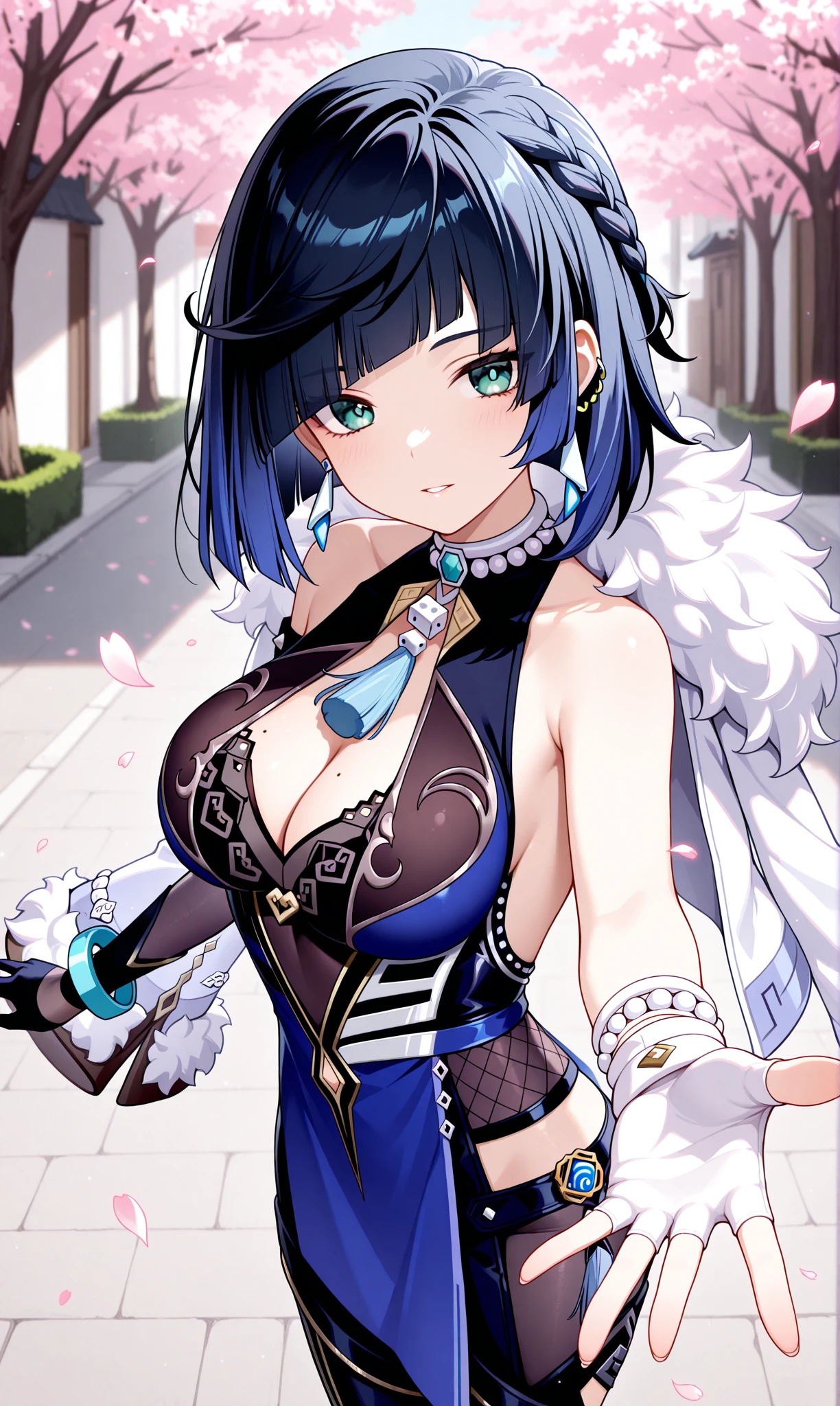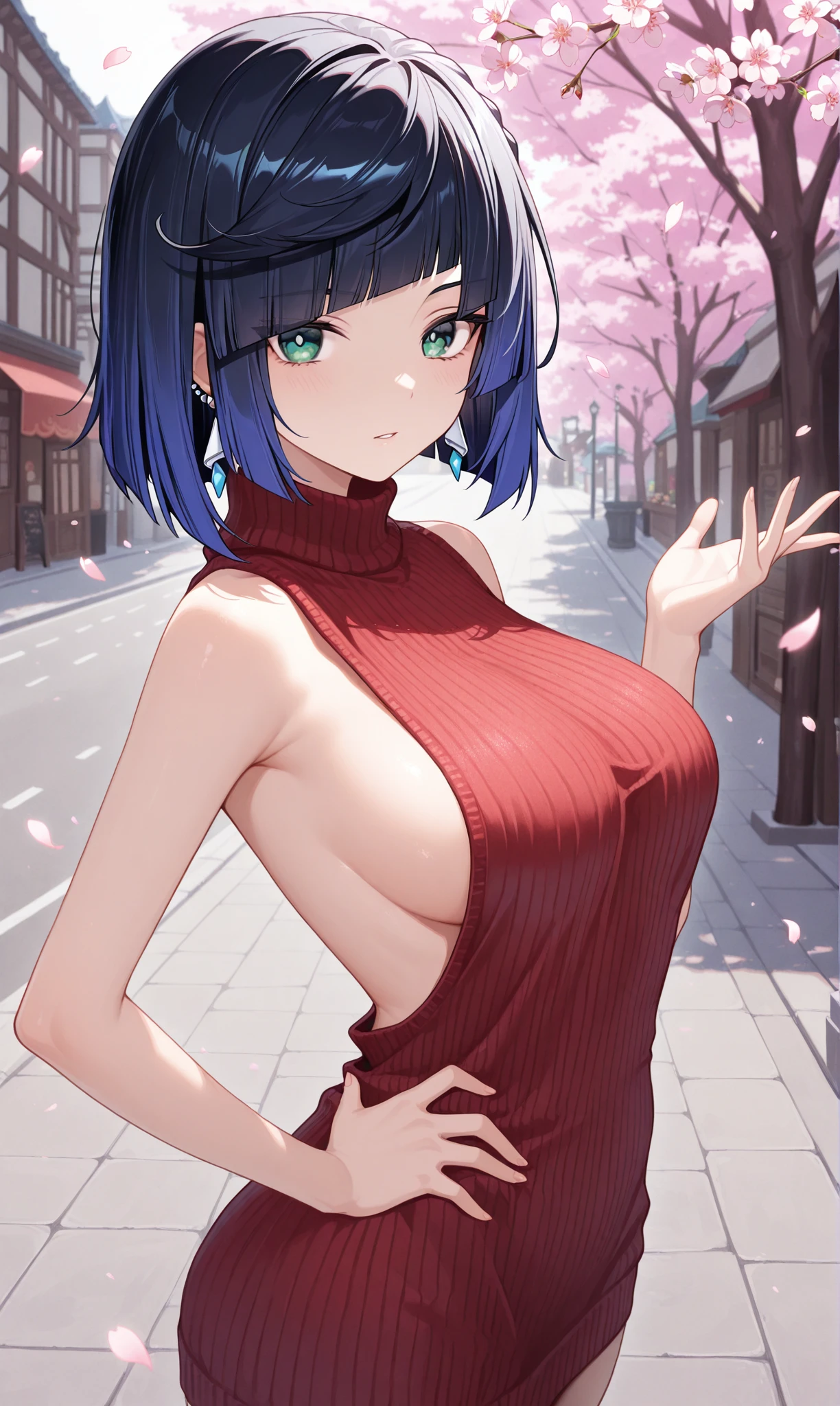 yelan (genshin impact), mole, mole on breast, green eyes, black hair, two-tone hair, short hair, bobcut, diagonal bangs, earrings๐ข๐๐๐ณ๐ถ๐: