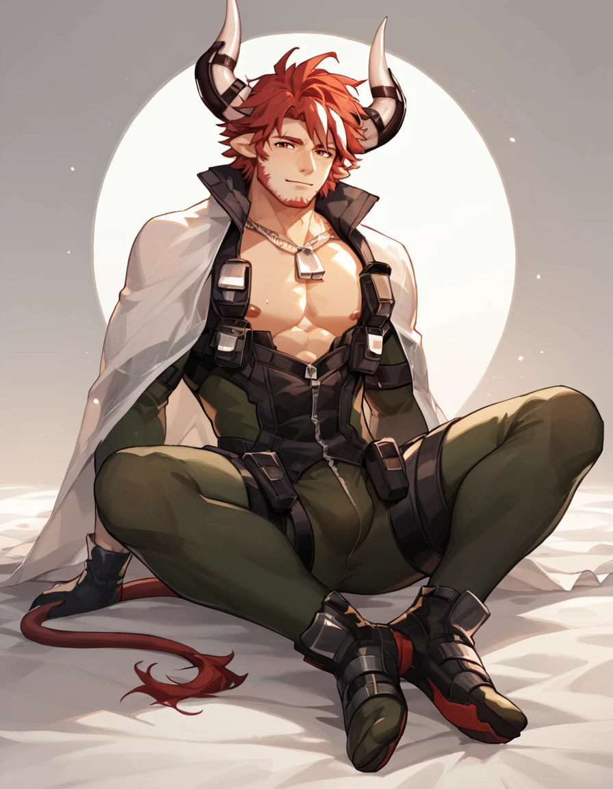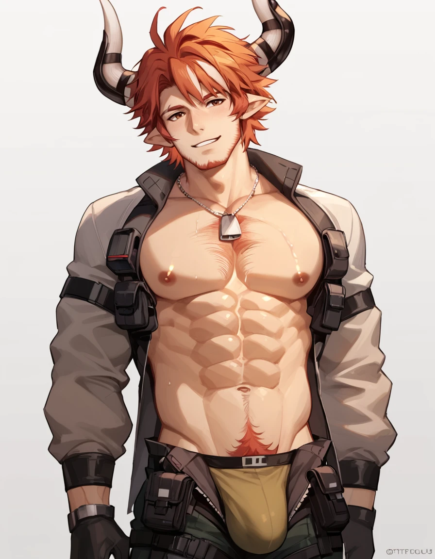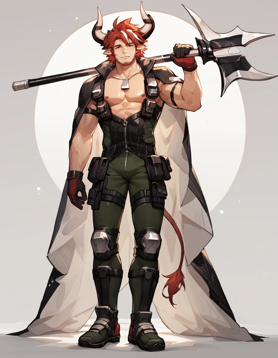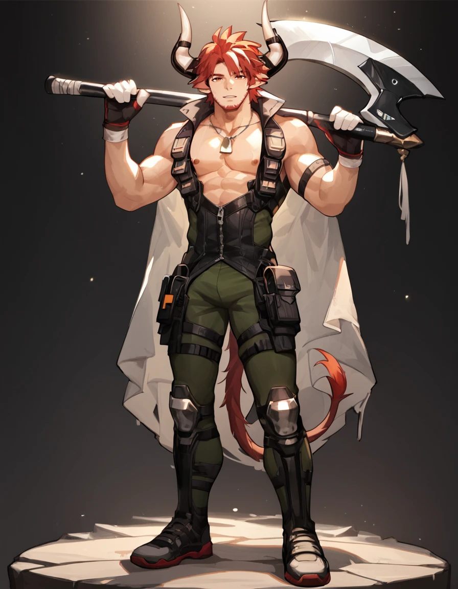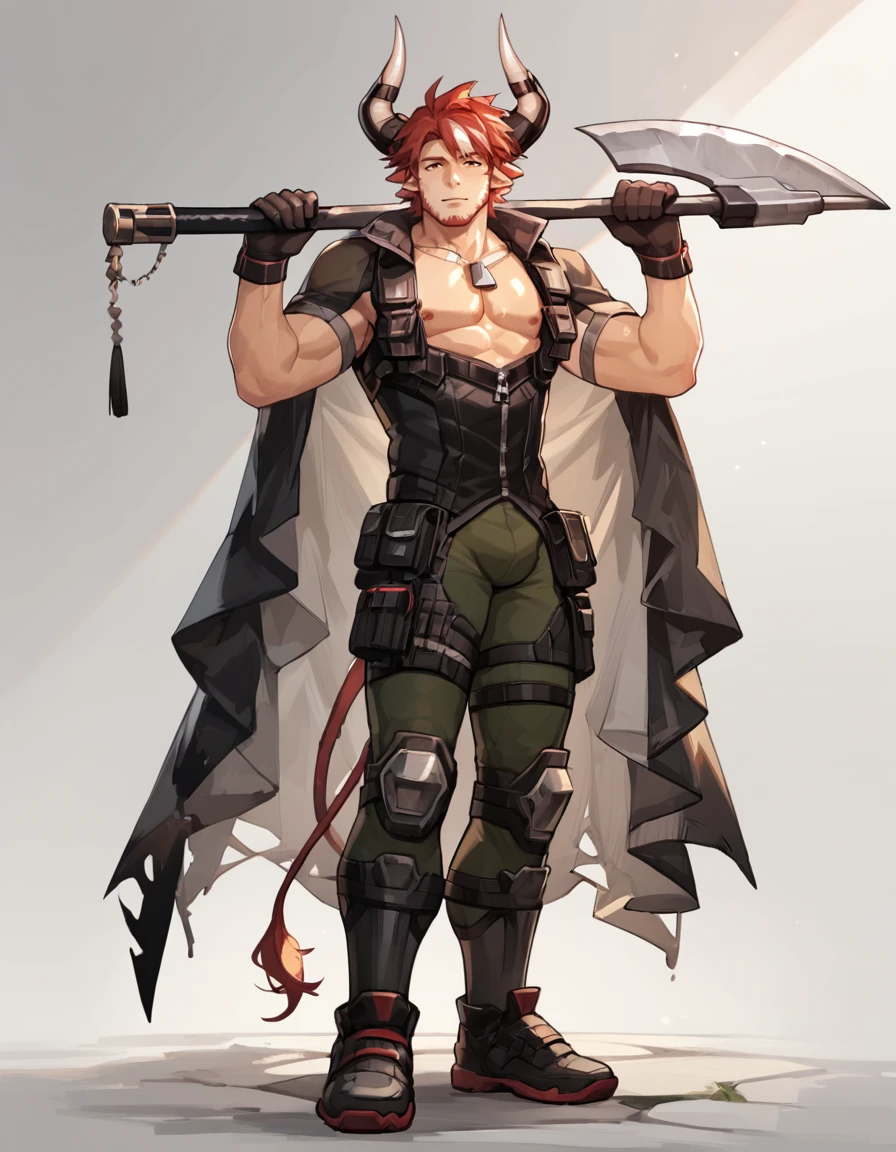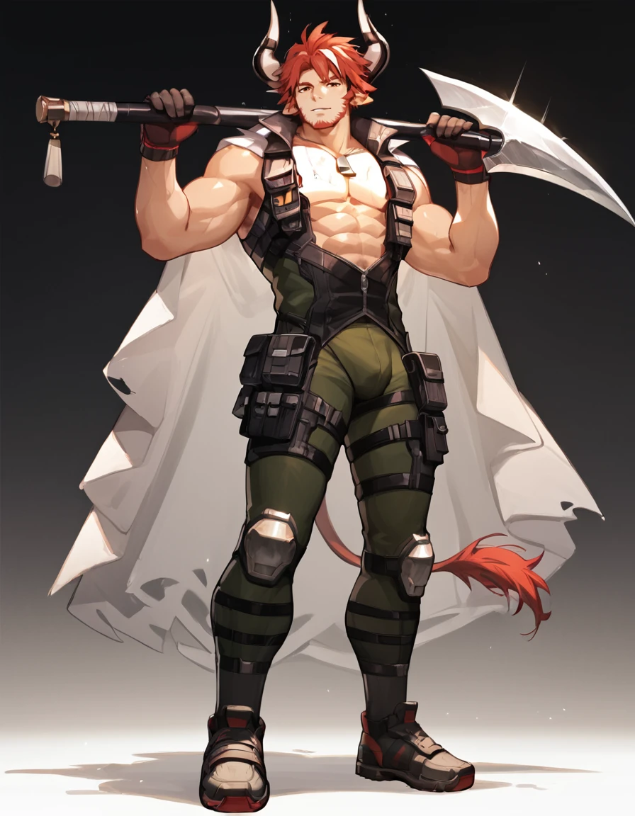 Tags: Humus_Arknights, solo, looking at viewer, short hair, gloves, 1boy, animal ears, standing, tail, full body, male focus, red hair, horns, pants, holding weapon, muscular, facial hair, pectorals, muscular male, bara, beard, mature male, stubble, goatee, cow ears, cow horns, axe, over shoulder, weapon over shoulder, cow boy