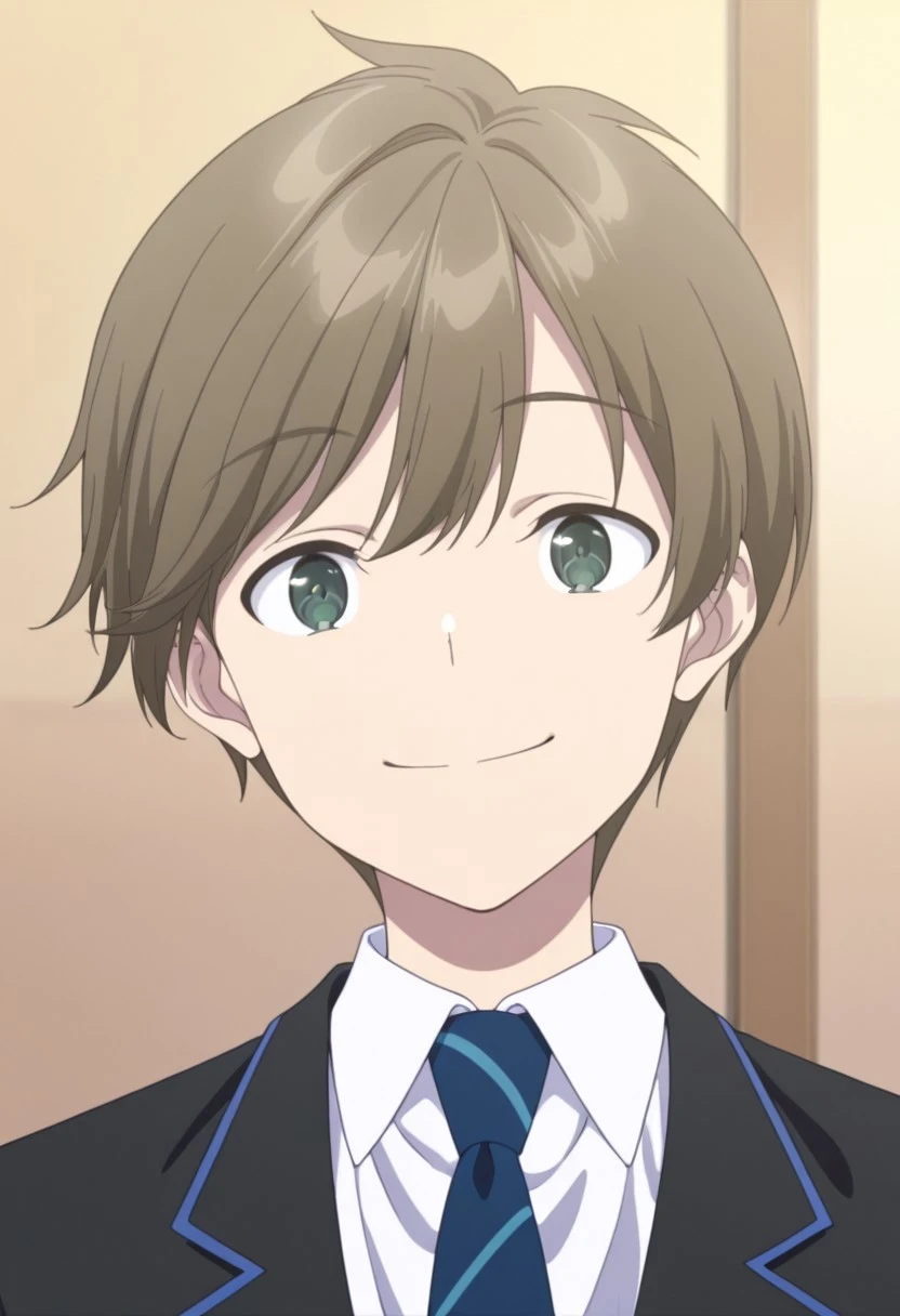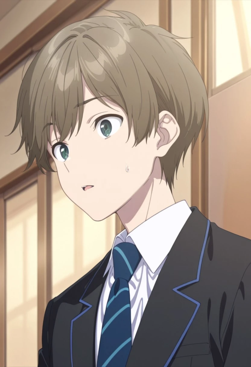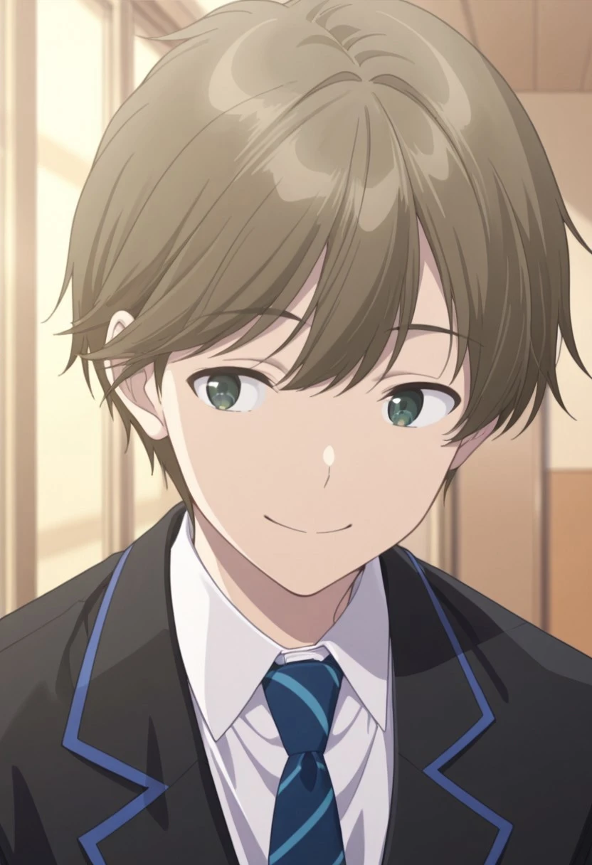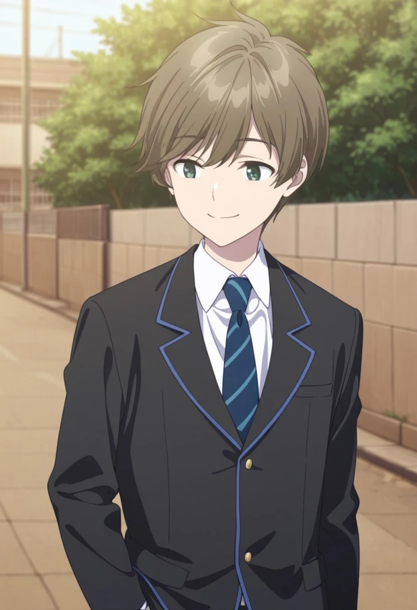 1boy, male focus, solo, green eyes, brown hair, short hair, school uniform, white shirt, collared shirt, blue necktie, striped necktie, black jacket, black pants,