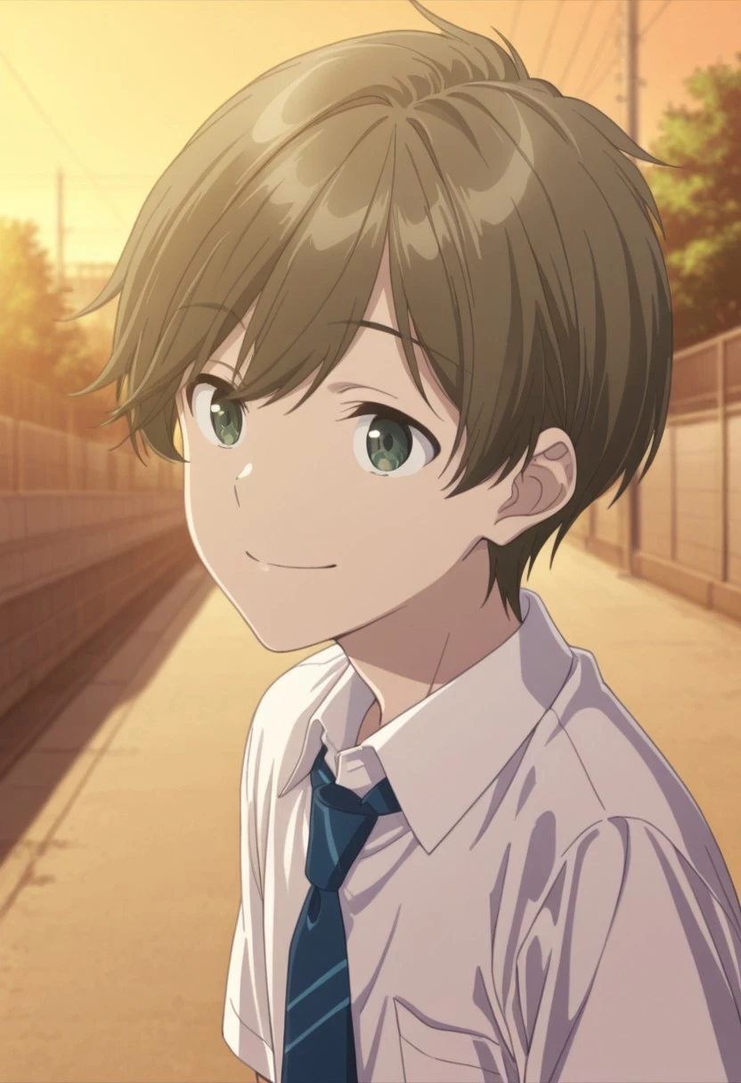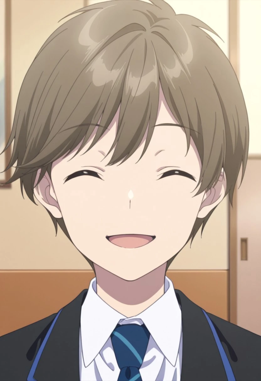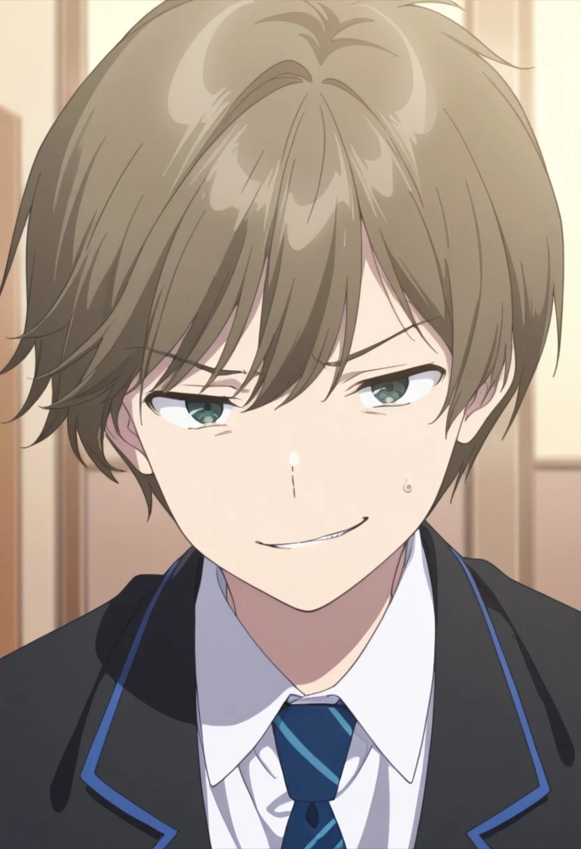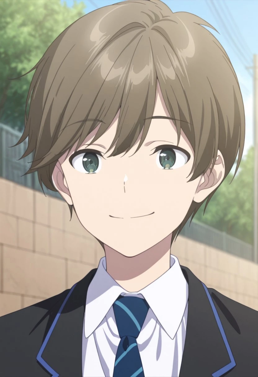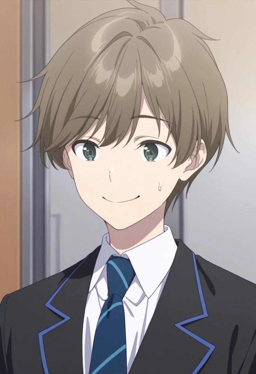 1boy, male focus, solo, green eyes, brown hair, short hair, school uniform, white shirt, collared shirt, blue necktie, striped necktie, black jacket, black pants,