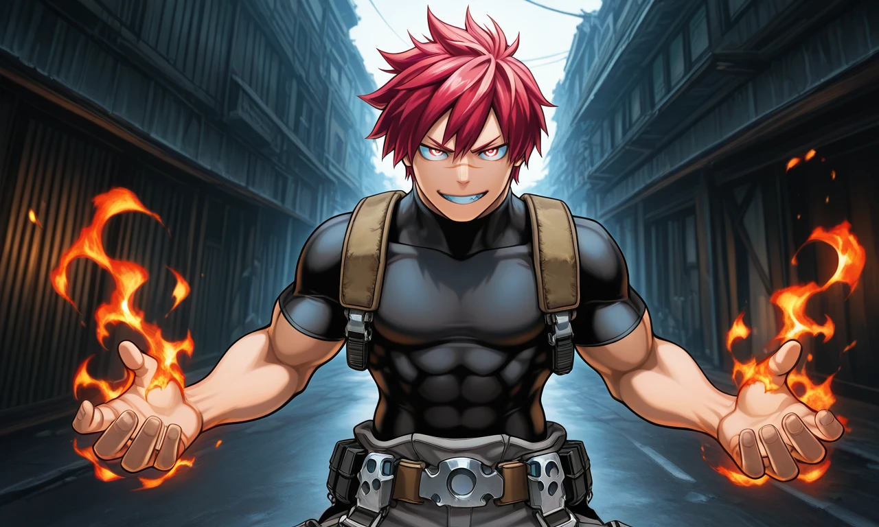 settrigh, 1boy, solo, male focus, red hair, short hair, spiked hair, swept bangs, hair between eyes, red eyes, mismatched pupils, x-o pupils, scar on noseOutfit 1