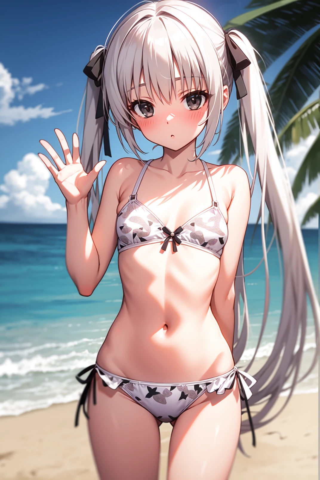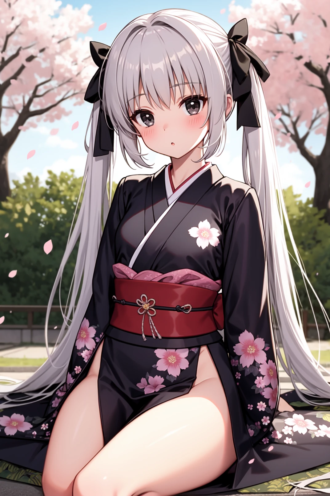 sora, black eyes, white hair, long hair, twintails,
