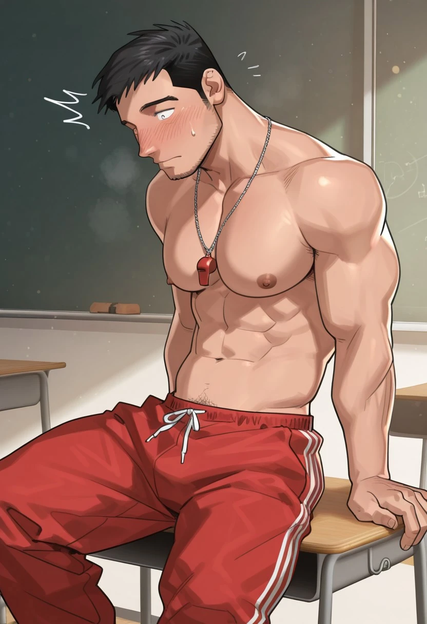 Hoan, Ero Condo, Short hair, black hair, red sports sweatshirt, black sleeveless shirt, red sweatpants, whistle necklace,
