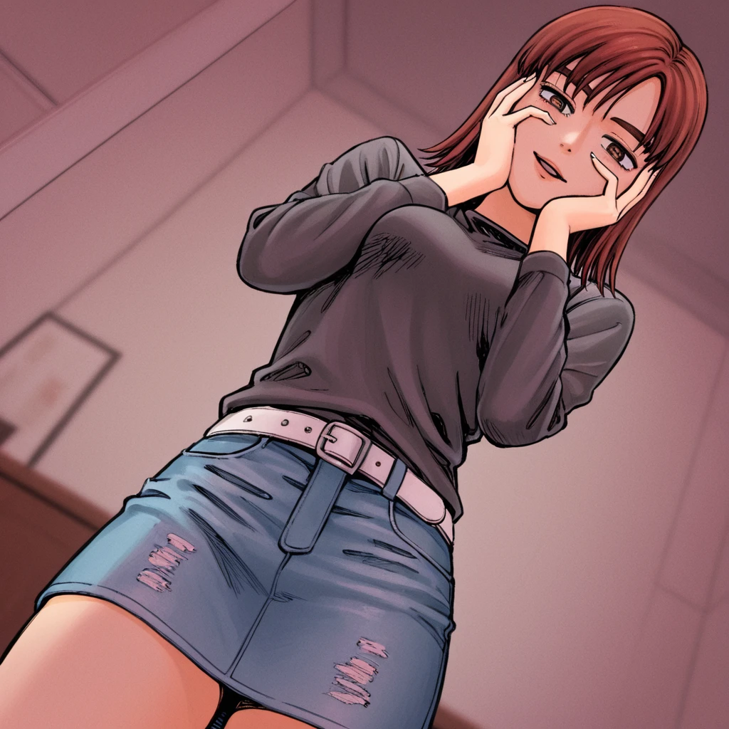 Outfit: black shirt, long sleeves, denim skirt, white belt,sneakers (<-these barely showed up in data)