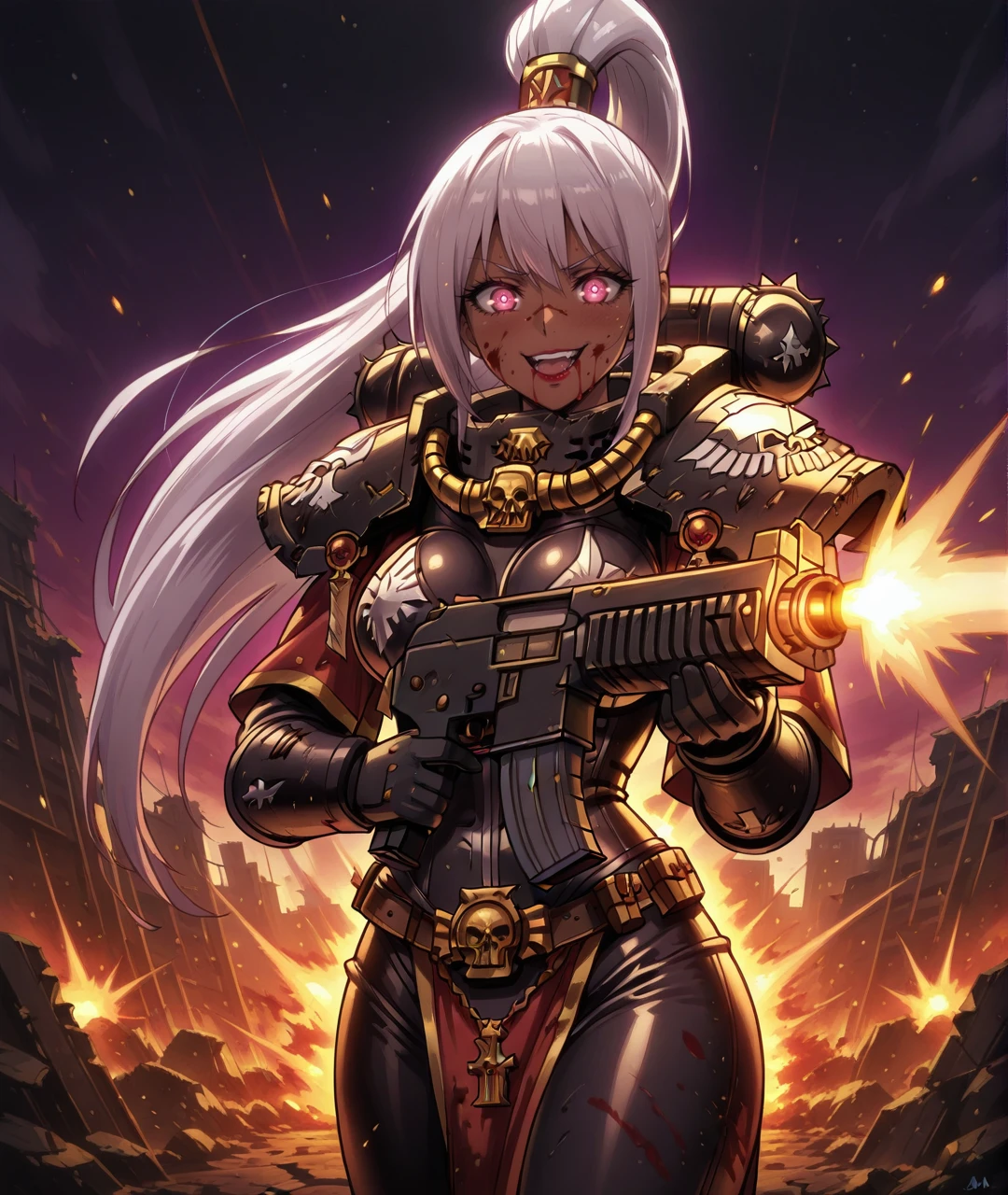 SigynBase, dark-skinned female, pink eyes, make up, lipstick, long hair, silver hair, high ponytail, brown hair tie, jewelry, gold choker, necklace, bare shoulders, collarbone, large breasts, cleavage, dancer, revealing clothes, white harem outfit, gold trim, gold bracelets, brown fingerless gloves, midriff, navel, tattoo, white pelvic curtain, no panties, brown gladiator sandals,
