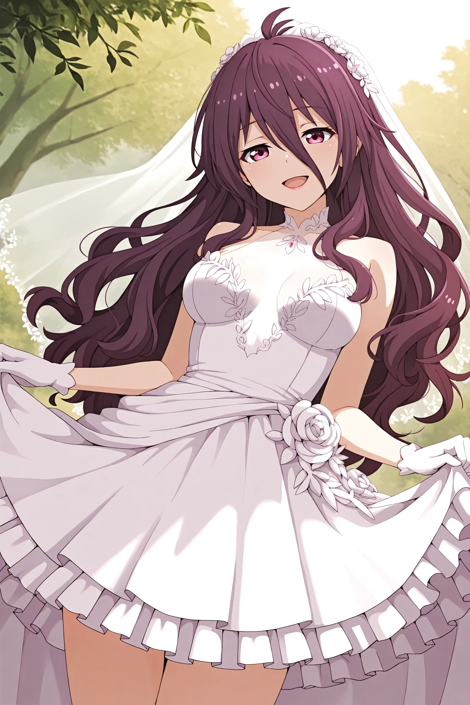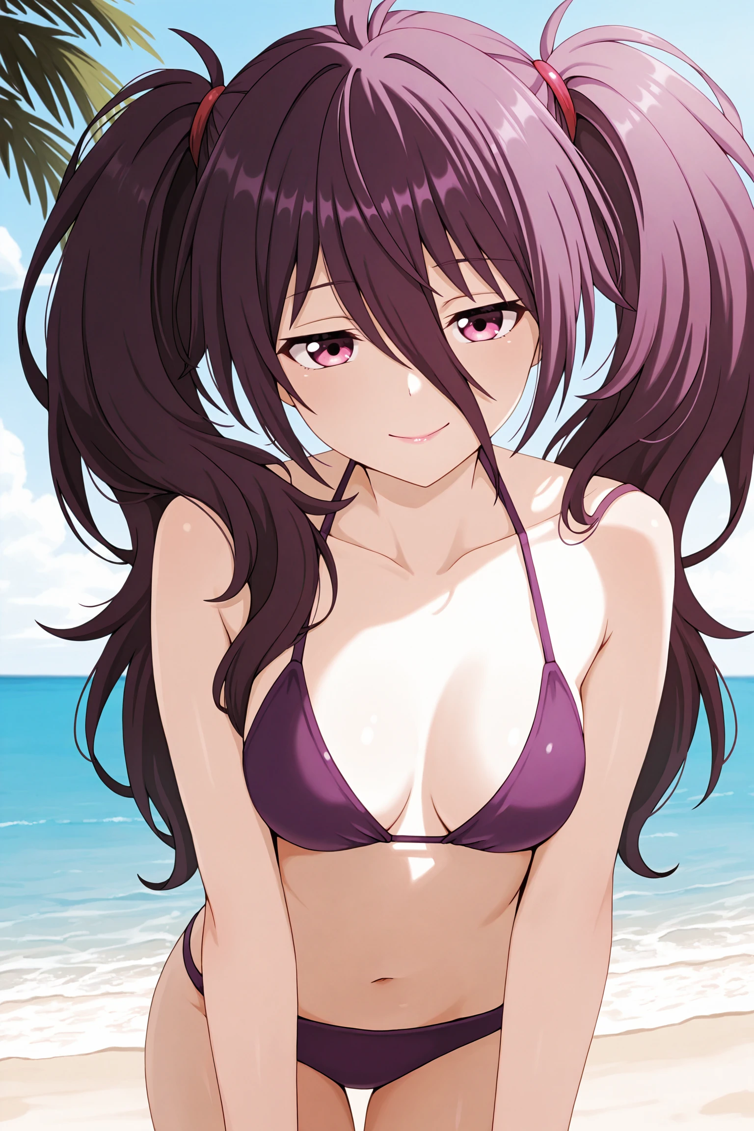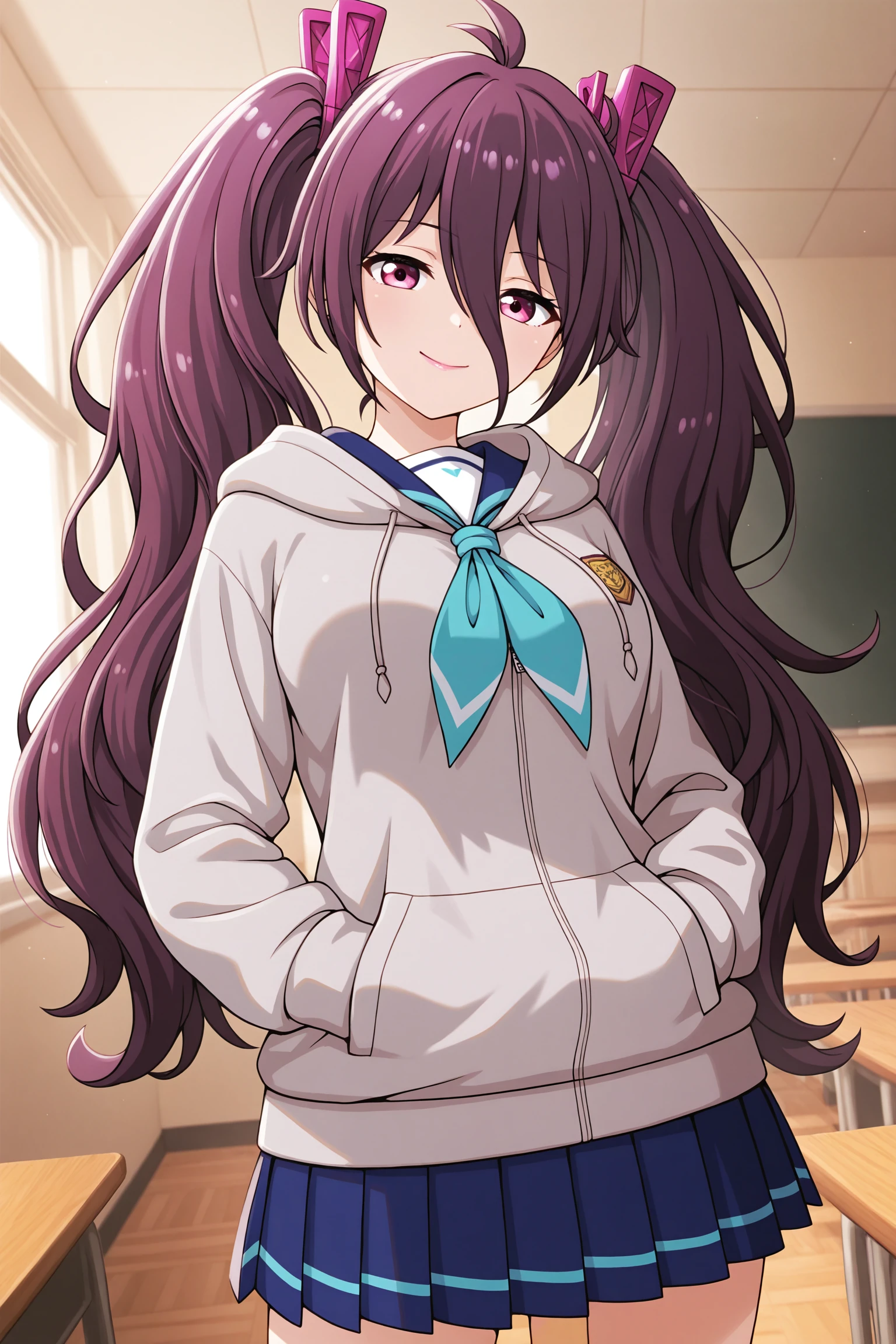 brownish purple hair, antenna hair, giant purple hairclips, high twintails, long bangs, messy hair, very long hair, pink eyes